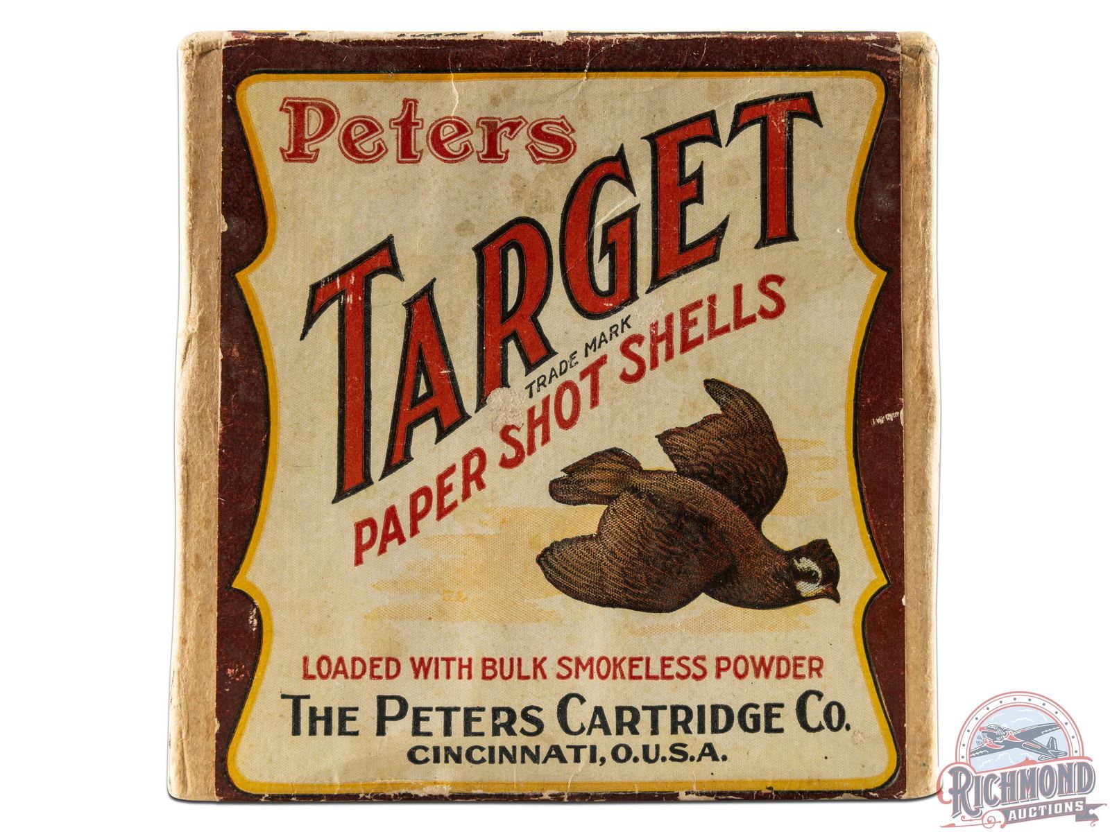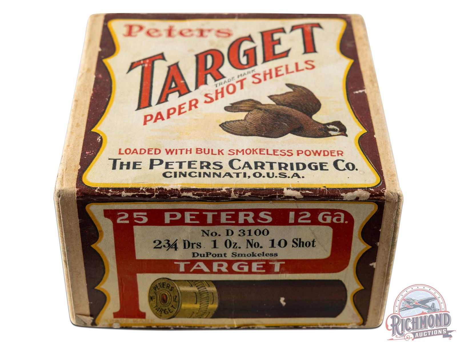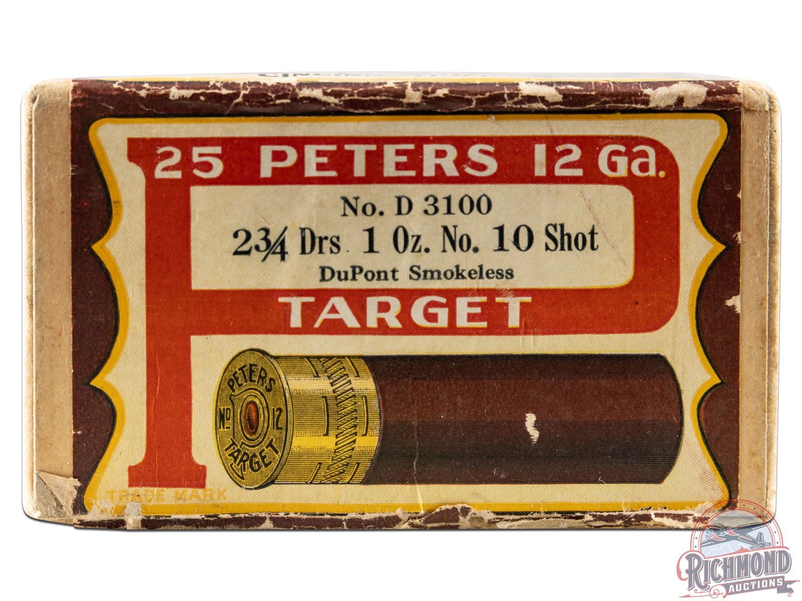 Box is 25 round, 12 gauge, factory full Peters "Target" labeled two-piece shotshell box with Cincinnati, Address. Shells are correctly loaded as label states with "Dupont Smokeless" powder and "No. 10" shot.