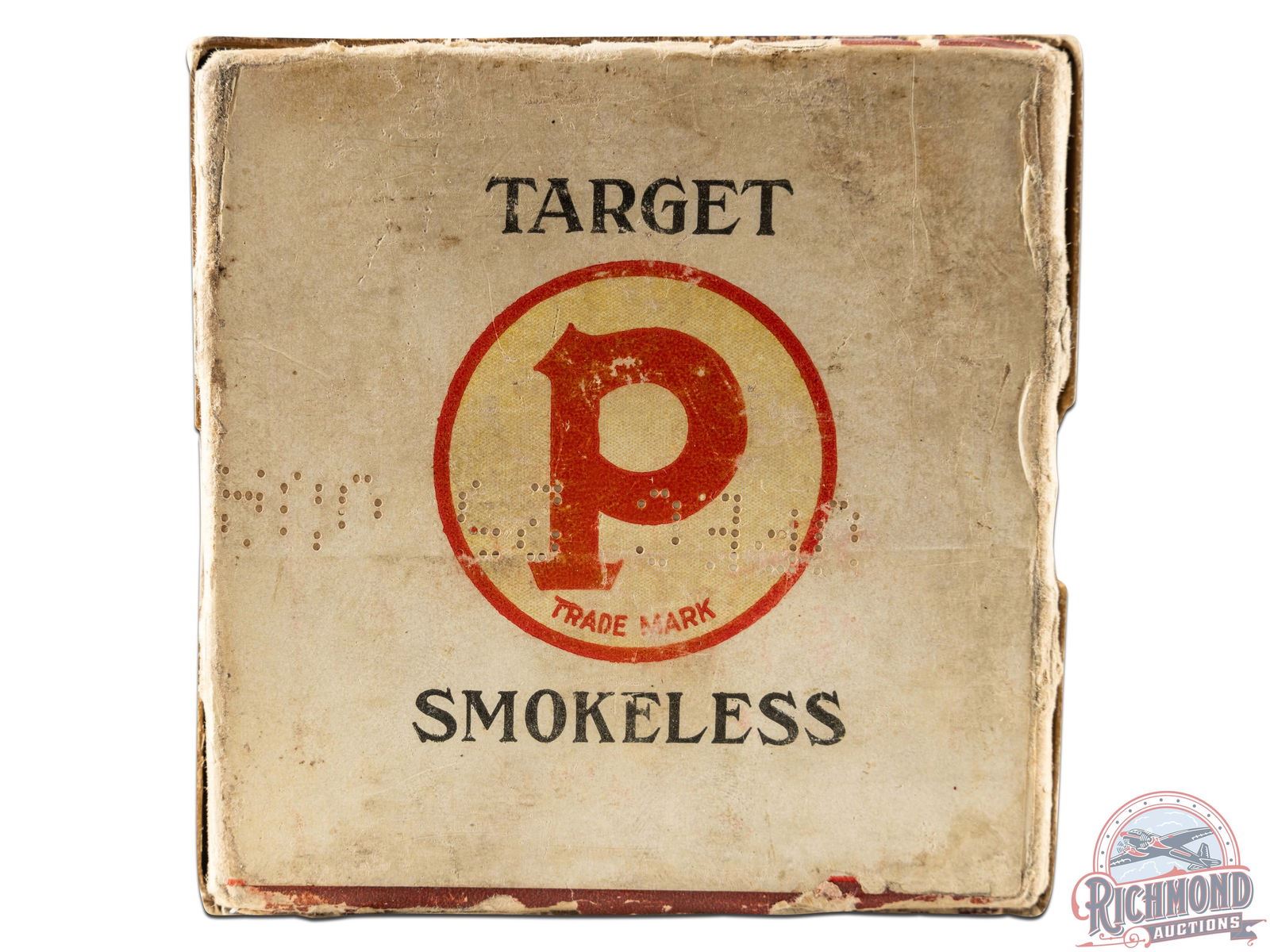 Listed as a "4" rarity in Bacyk's Shotshell Encyclopedia. Box is a 25 round, 20 gauge, two-piece cardboard "Target Rustless Spreader Load" labeled shotshell box with Cincinnati, Ohio Address. "Spreader Load" is stamped across all three labels. Label states shells were loaded with Smokeless powder and "6" shot.