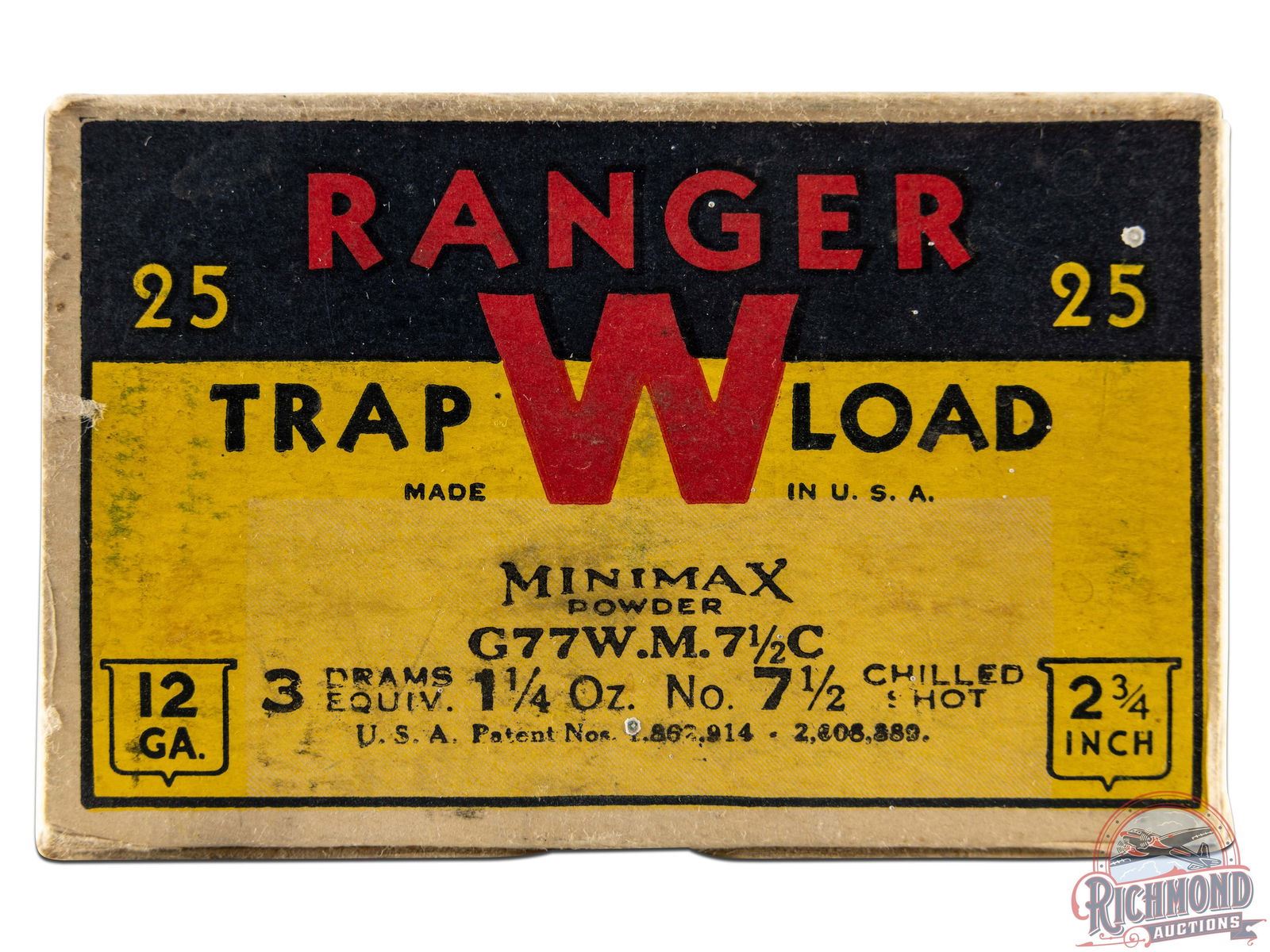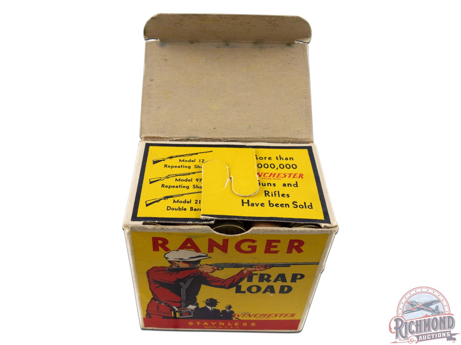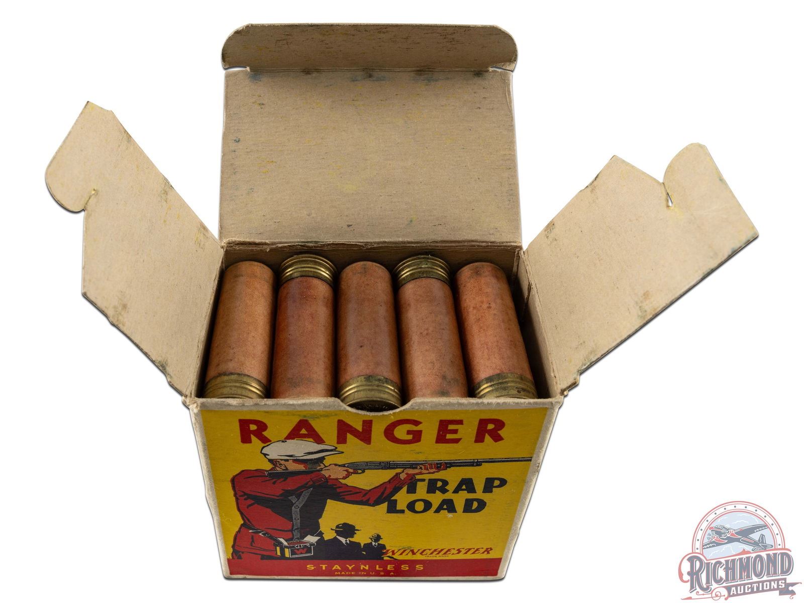 Box is a 25 round, 12 gauge, one-piece cardboard box with "Ranger Trap Load" label, Trap Shooter scene and Staynless roll crimp shells. Correct factory shells loaded with Minimax powder and "7 1/2" Chilled Shot.