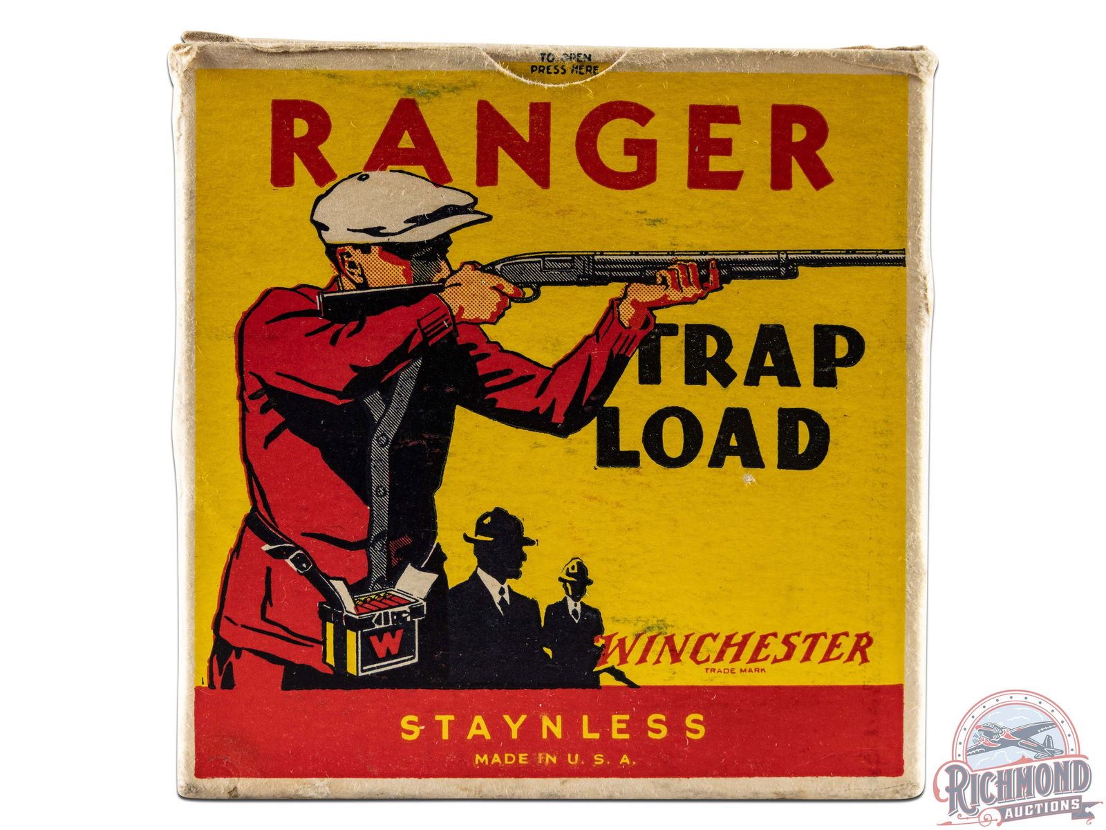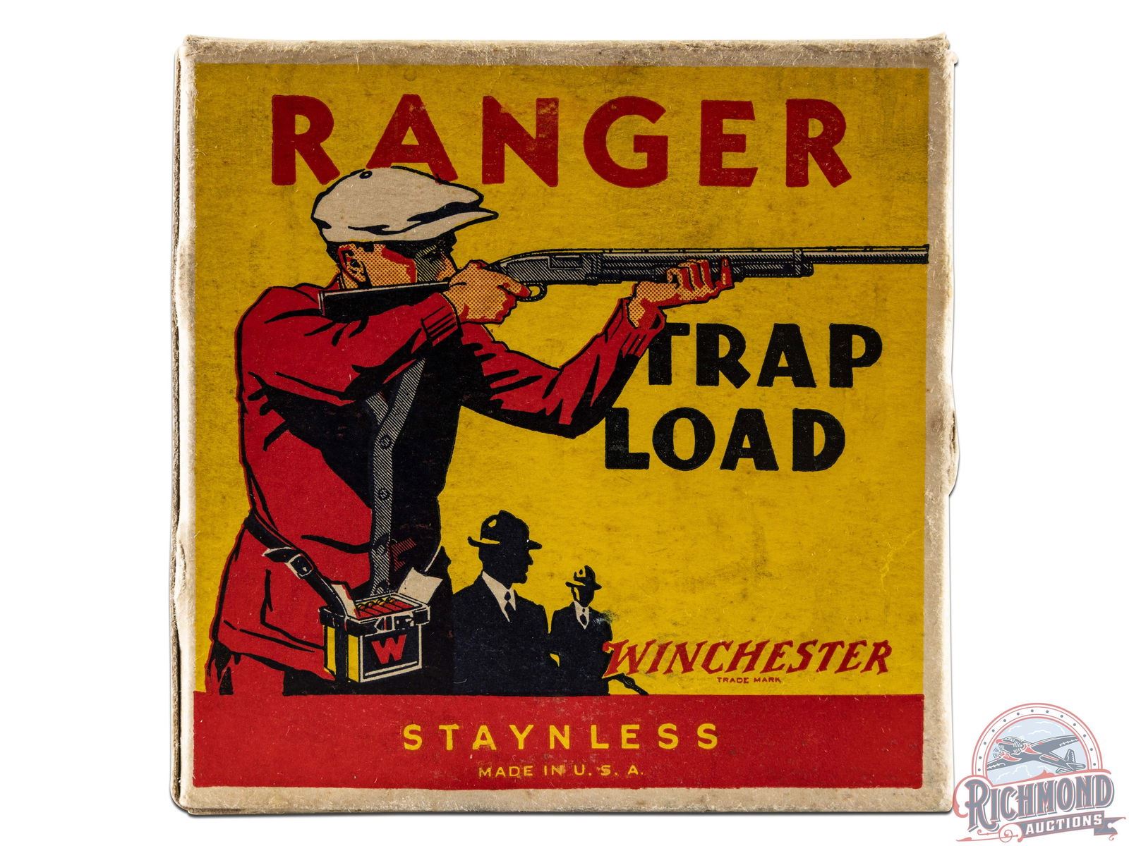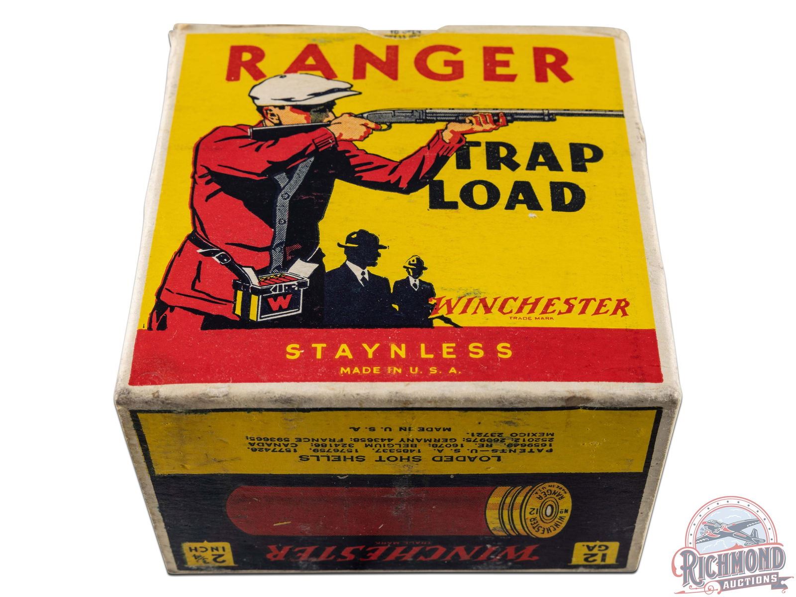 Box is a 25 round, 12 gauge, one-piece cardboard box with "Ranger Trap Load" label, Trap Shooter scene and Staynless roll crimp shells. Correct factory shells loaded with Minimax powder and "7 1/2" Chilled Shot.