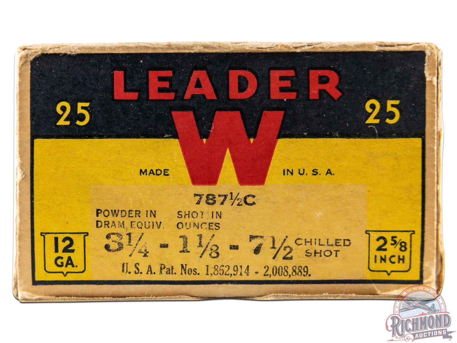 Listed as a "5" rarity in Bacyk's Shotshell Encyclopedia. Box is a 25 round, 12 gauge, one piece cardboard box with colorful Leader "Grouse" scene with original shells loaded with smokeless powder and "7 1/2 Chilled Shot".