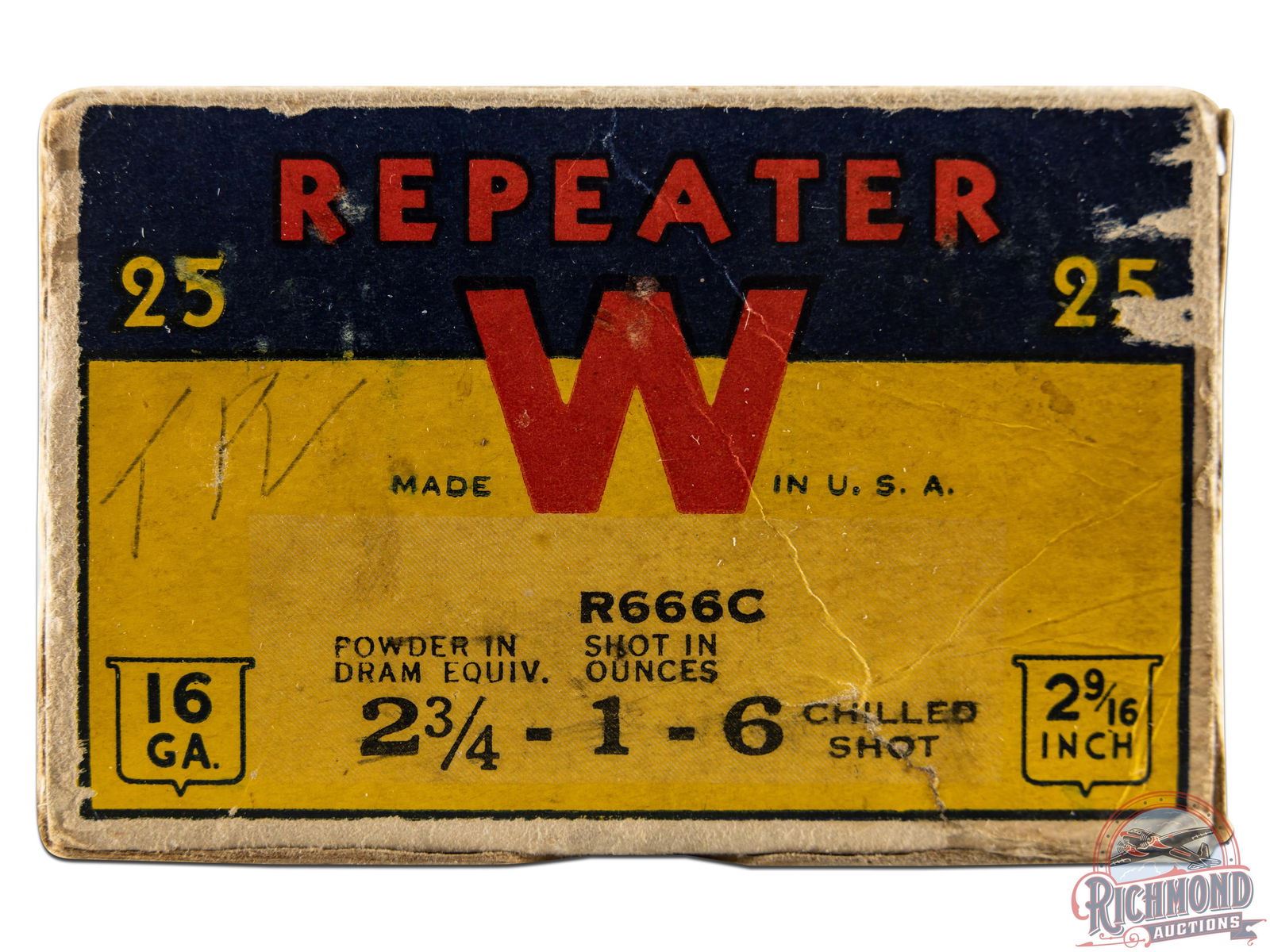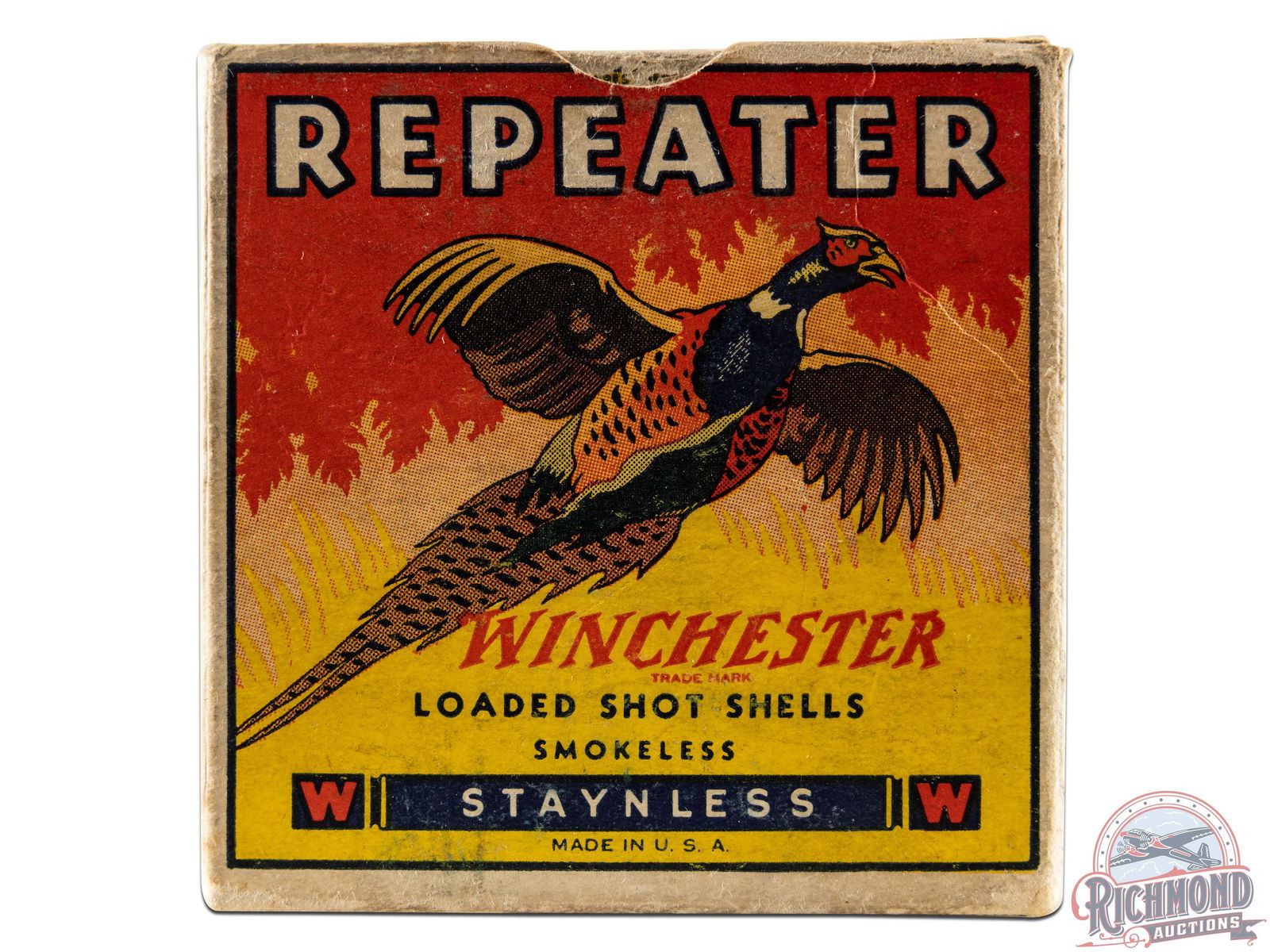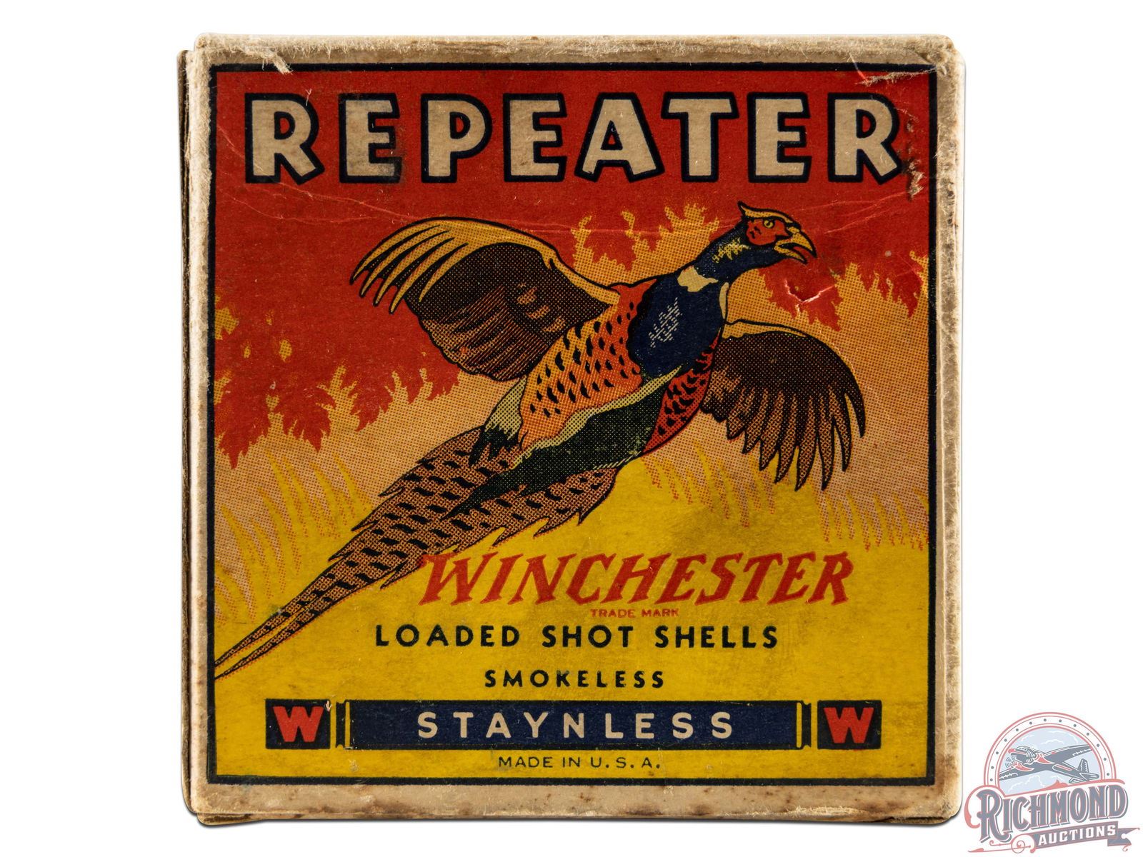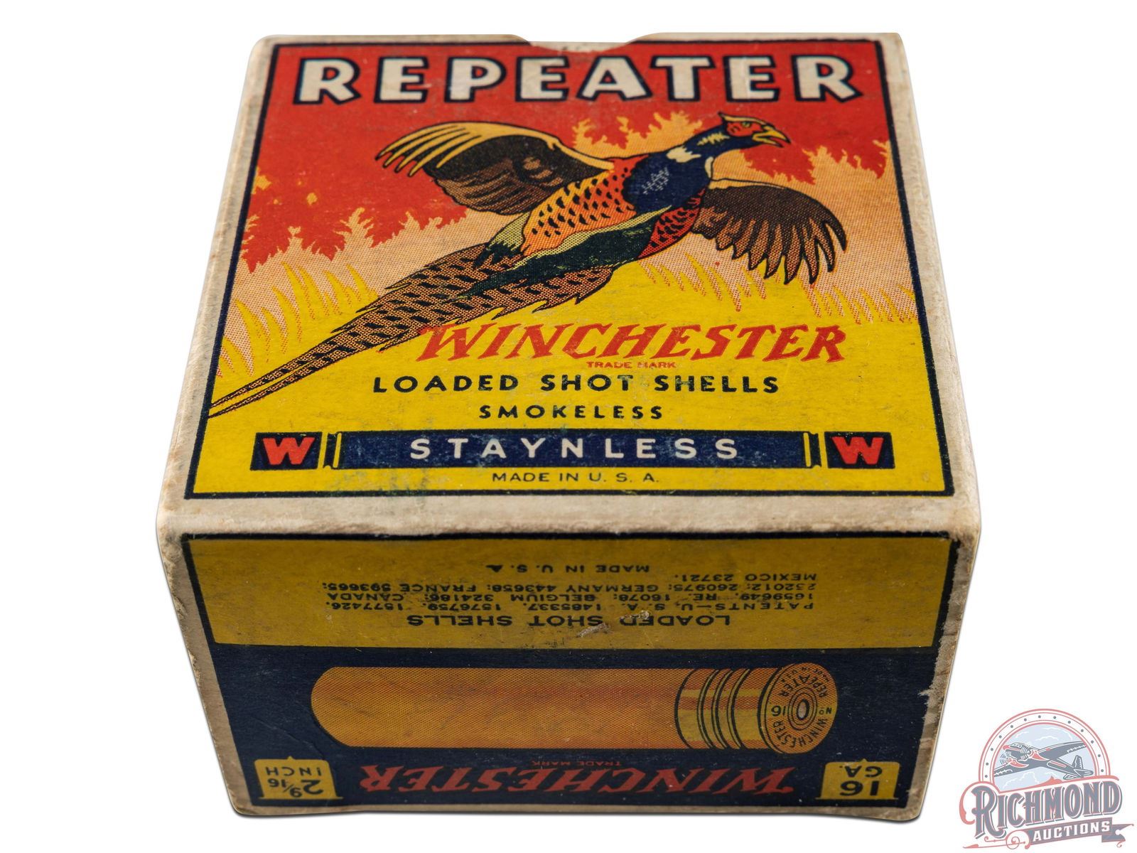Listed as a "5" rarity in Bacyk's Shotshell Encyclopedia. Box is a 25 round, 16 gauge, one-piece cardboard box with colorful Repeater "Pheasant" scene with original 2-9/16" shells loaded with smokeless powder and "6 Chilled" shot.
