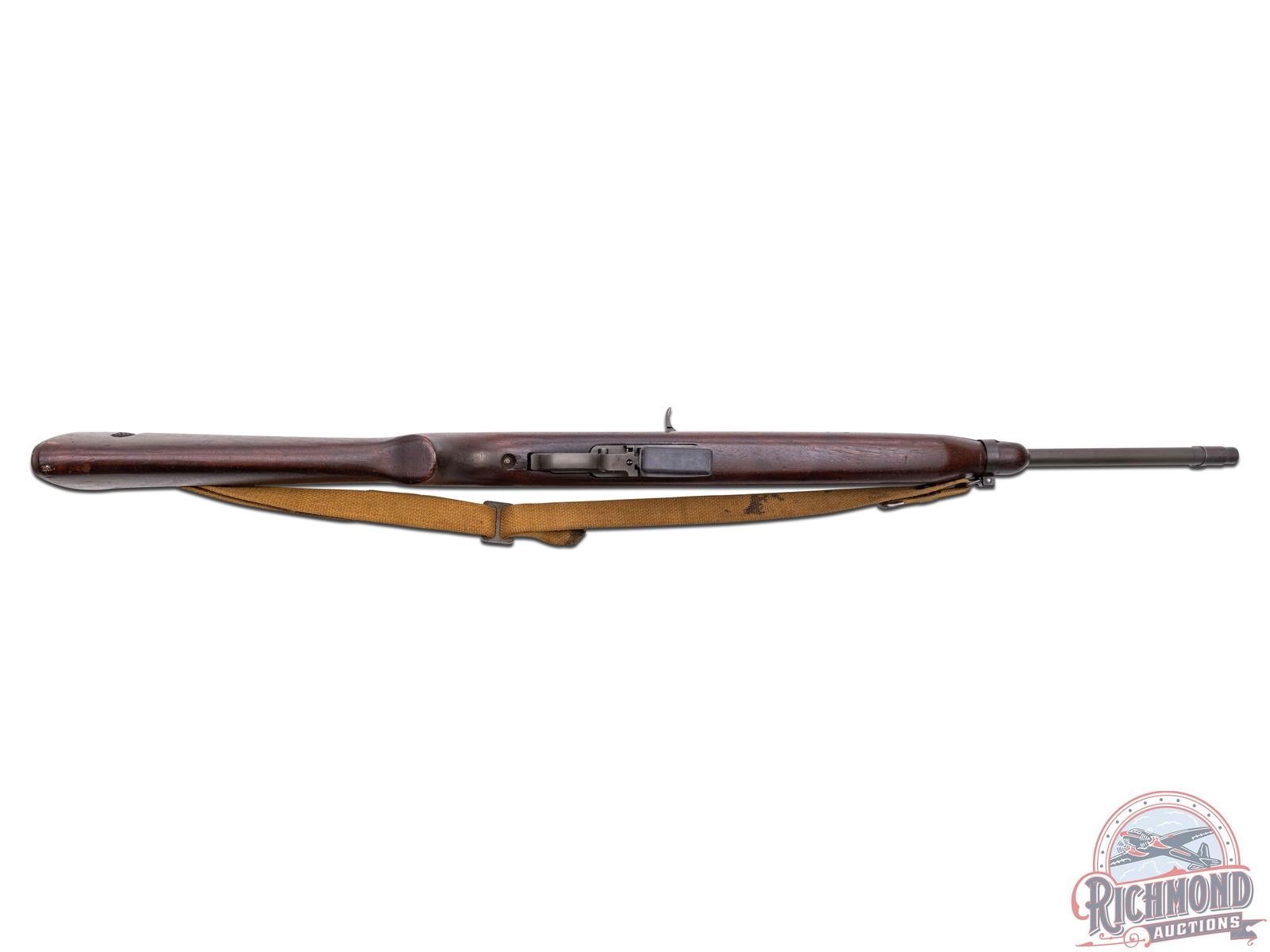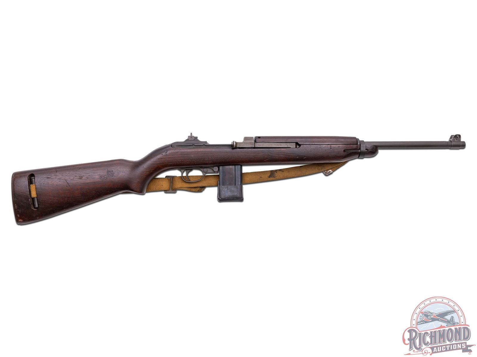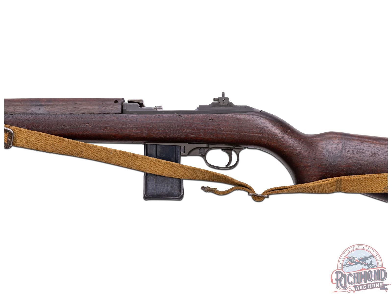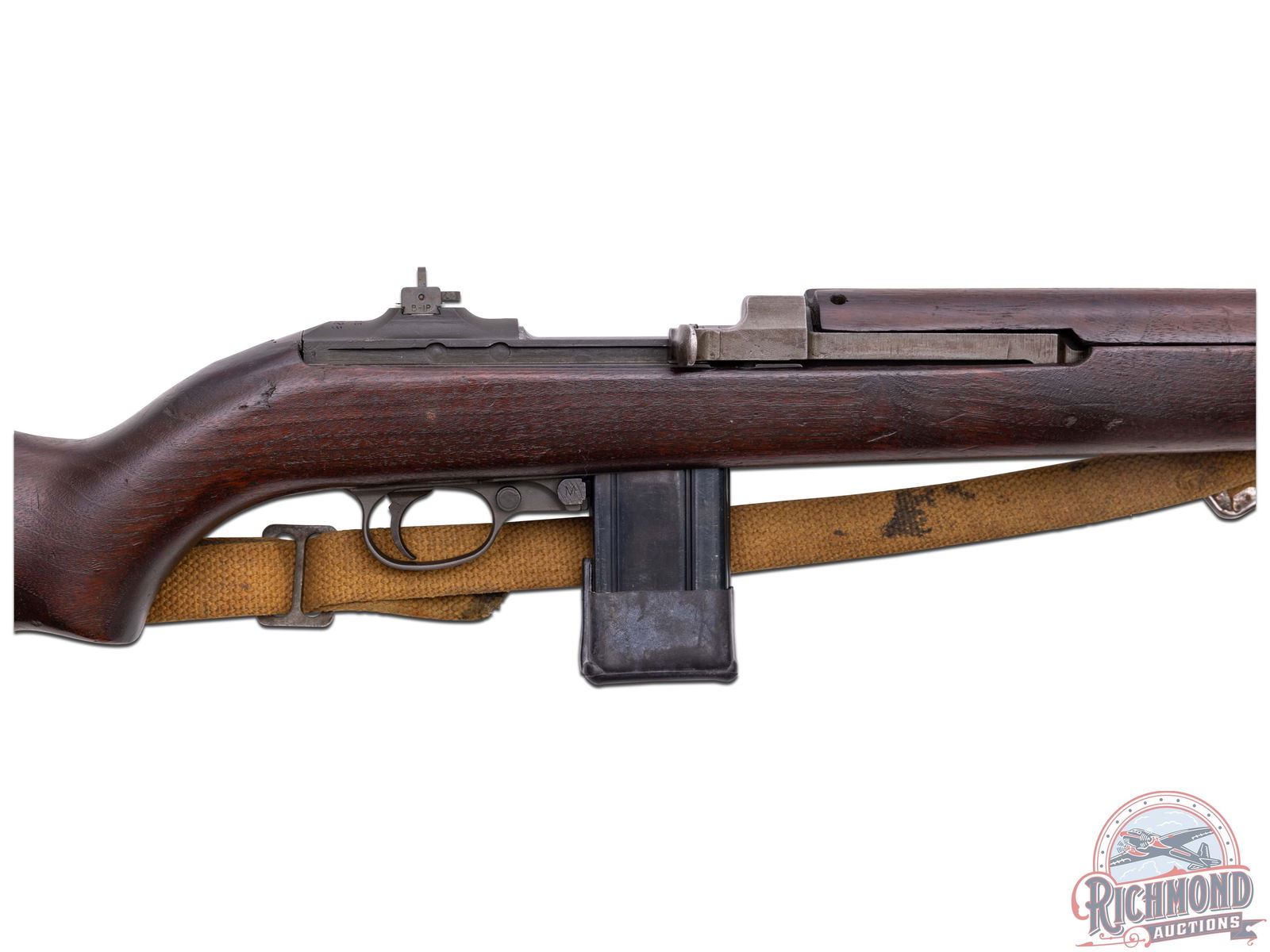 Manufactured in 1943 during the height of WWII. Features an 18" barrel stamped "UNDERWOOD 9/43" with period correct flip-up rear 2-position peep sight with shrouded blade milled front sight. RSG stamped two rivet top wood. SG marked trigger group with early cross bolt safety. SG marked sidewall and blued flat SG stamped bolt. SG stamped stock with Ordnance cross cannon cartouche, has not been cut for an M2. Includes period correct canvas sling and 10-round flat bottom magazine with rubber cap. Steel checkered butt plate. Has not been through a rebuild - no bayonet lug or "P" proof mark. LOP: 13". CALIBER: 30 CARBINE. S/N: 1850328. FFL STATUS: Curio & Relic.