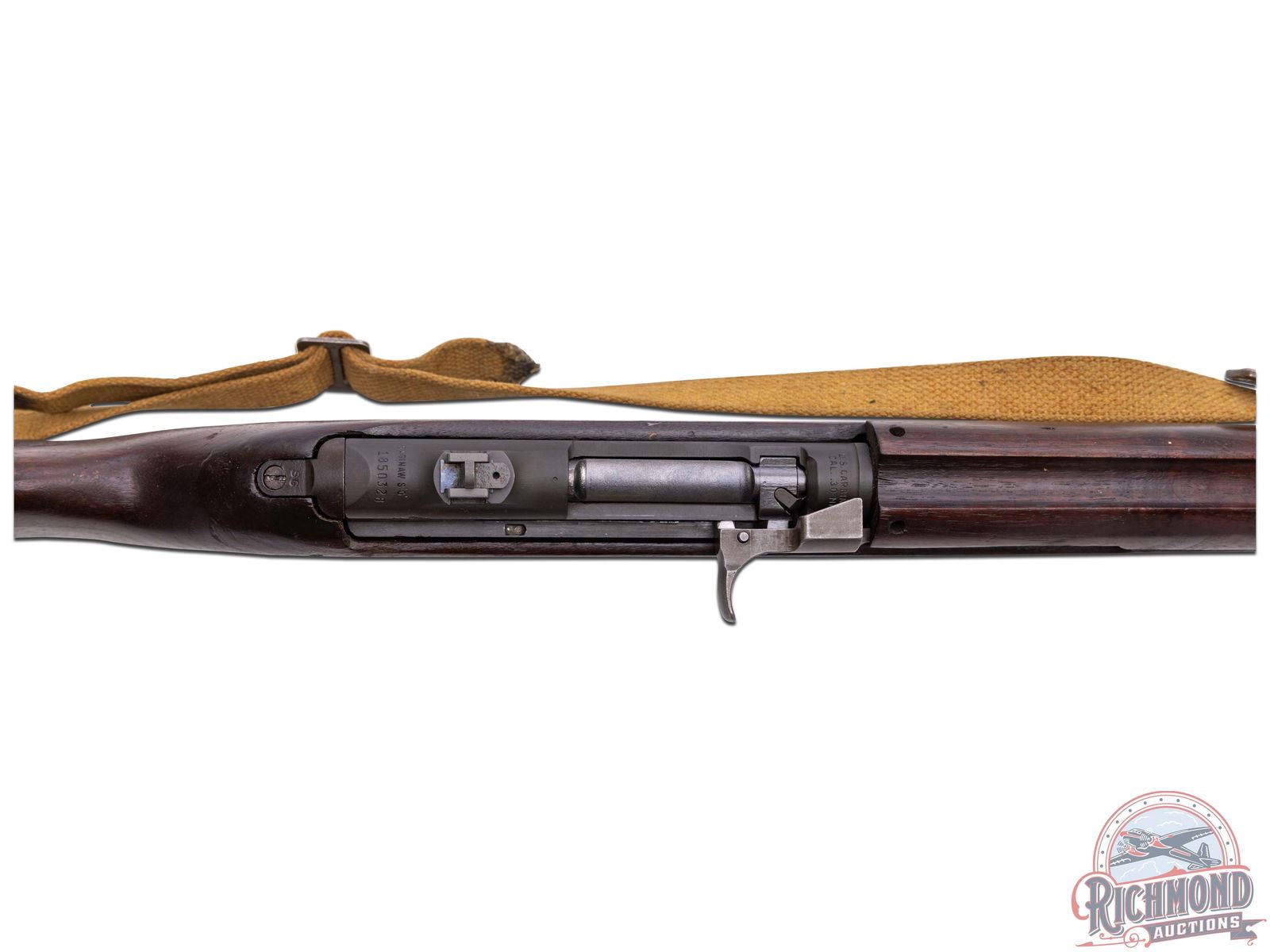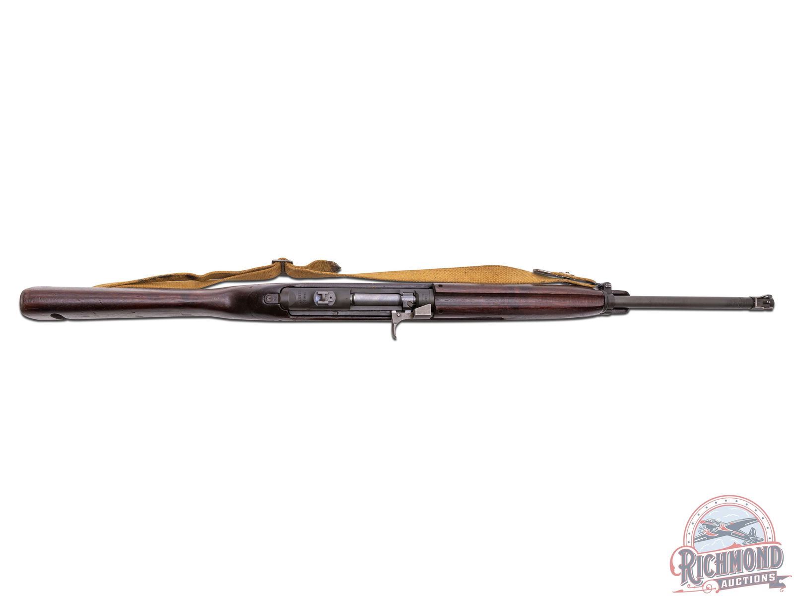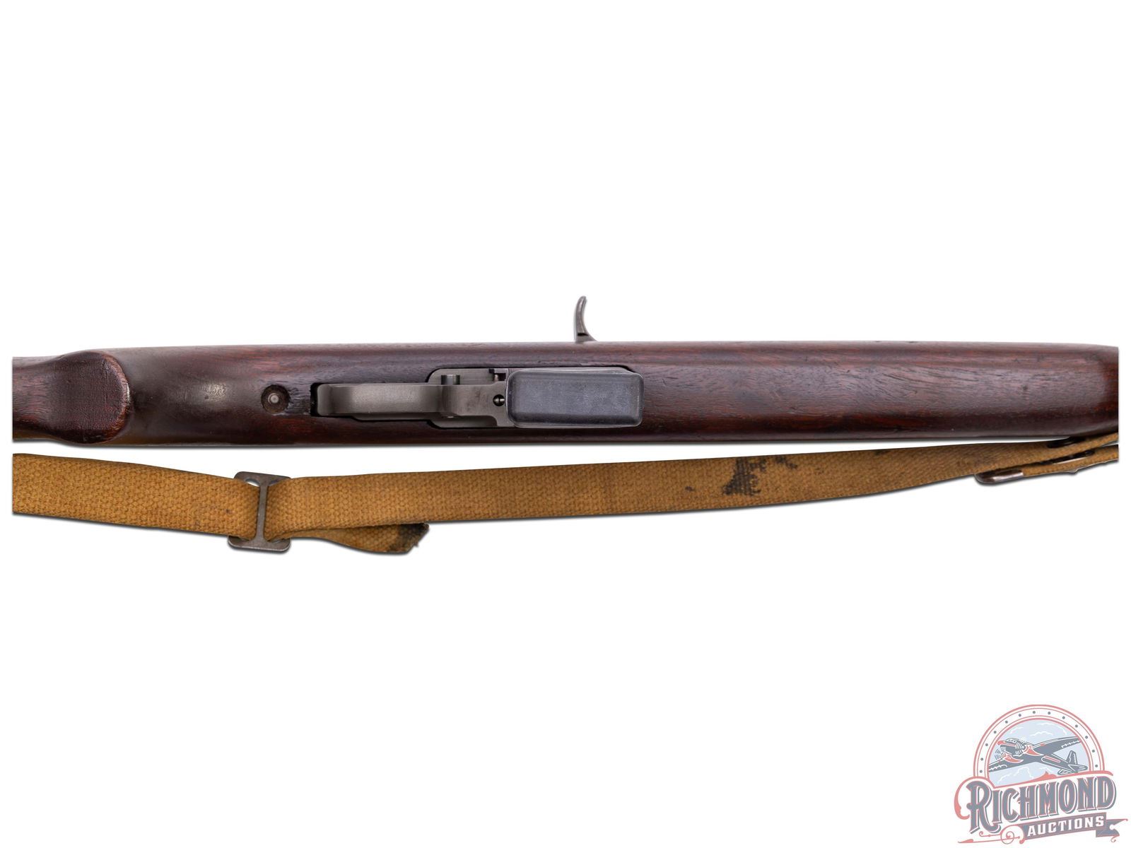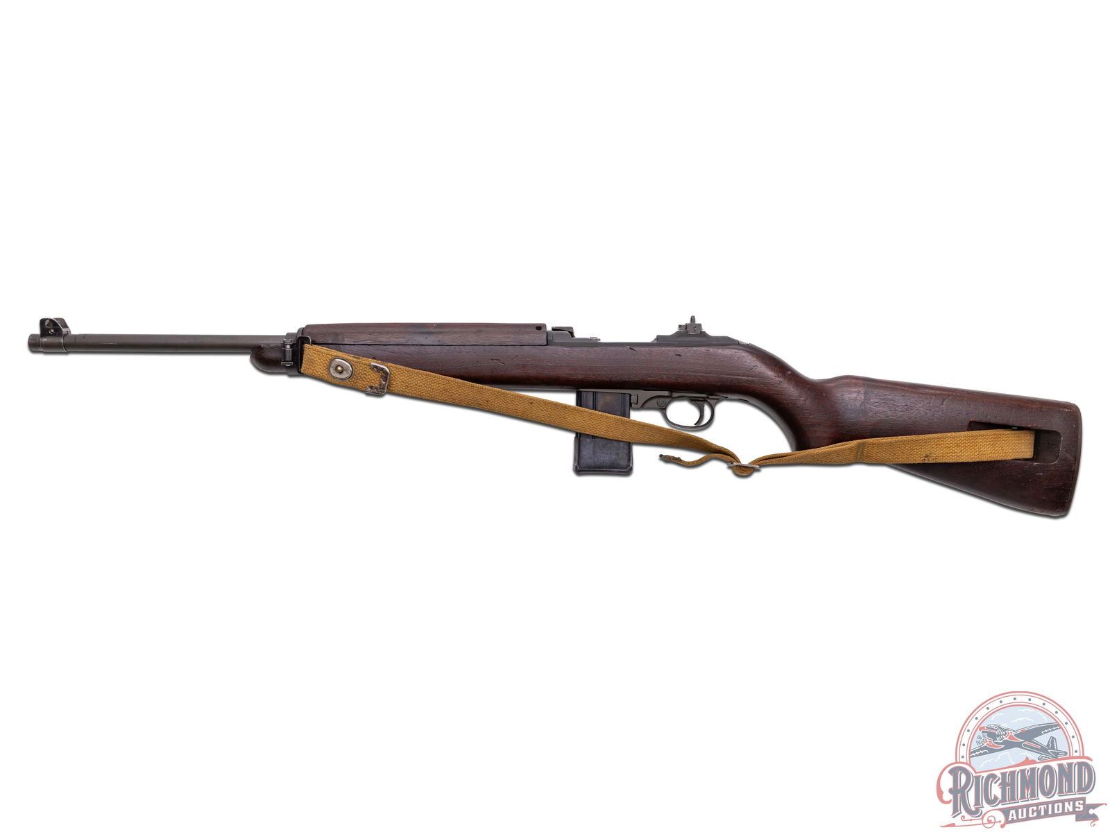 Manufactured in 1943 during the height of WWII. Features an 18" barrel stamped "UNDERWOOD 9/43" with period correct flip-up rear 2-position peep sight with shrouded blade milled front sight. RSG stamped two rivet top wood. SG marked trigger group with early cross bolt safety. SG marked sidewall and blued flat SG stamped bolt. SG stamped stock with Ordnance cross cannon cartouche, has not been cut for an M2. Includes period correct canvas sling and 10-round flat bottom magazine with rubber cap. Steel checkered butt plate. Has not been through a rebuild - no bayonet lug or "P" proof mark. LOP: 13". CALIBER: 30 CARBINE. S/N: 1850328. FFL STATUS: Curio & Relic.