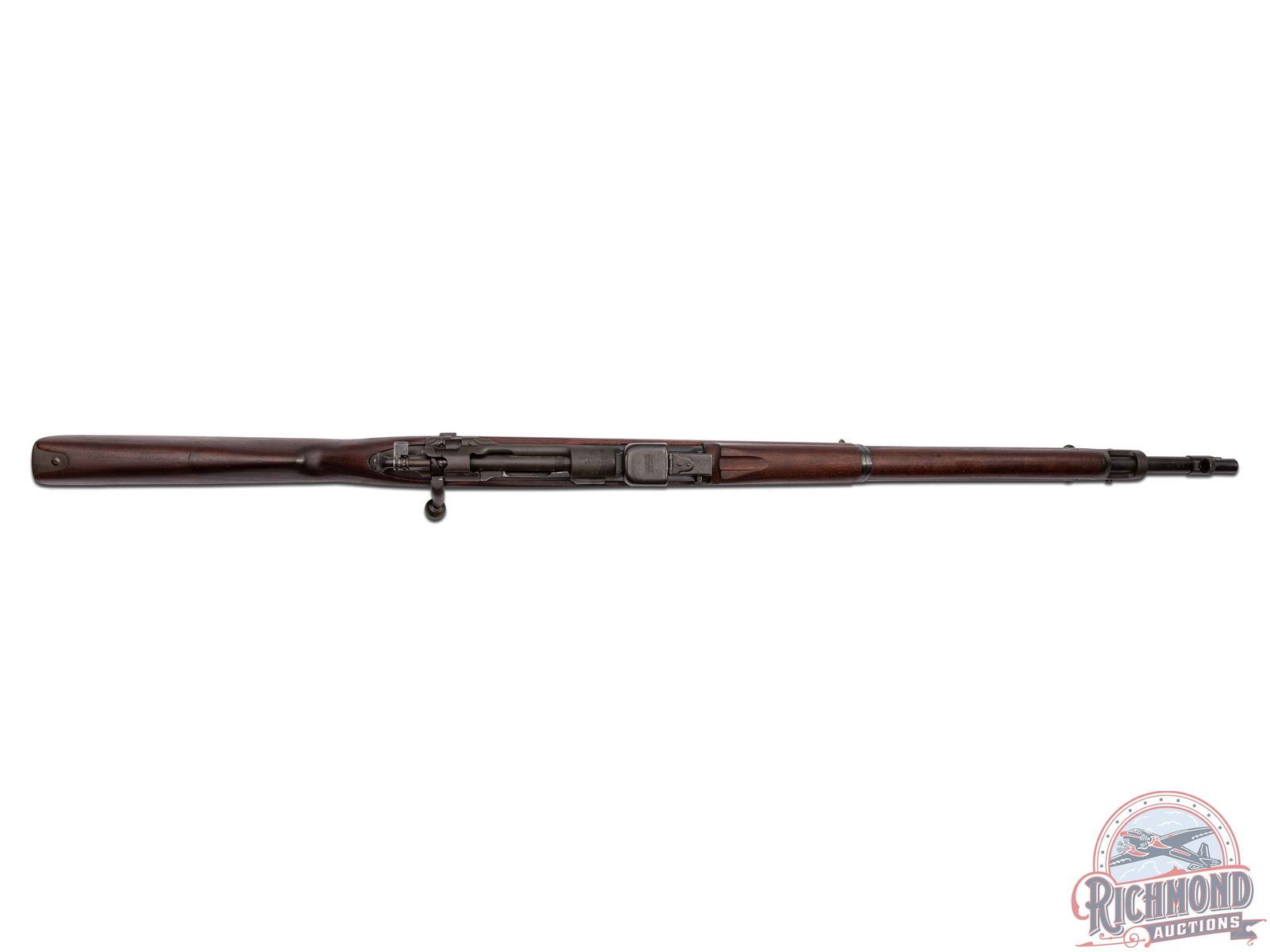 Made at Springfield Armory in 1921. 24" blued round military barrel in 30-06 caliber with "SA/Flaming Bomb/1-21/A" barrel stamping. Barrel fitted with banded front Globe target sight and P.J. O'Hare covered 2800 yard rear graduated flip sight. Parkerized finished receiver with Springfield address with swept handle military bolt with standard trigger. Receiver is drilled for Lyman 48S or Vavier sight (missing). Walnut "C" stock with "P" in circle stamp and "SA/S.P.G." in square inspector marks. Matching walnut humped top wood. Blued milled trigger guard and stock furniture. CALIBER: 30-06. S/N: 1213300. FFL STATUS: Curio & Relic.