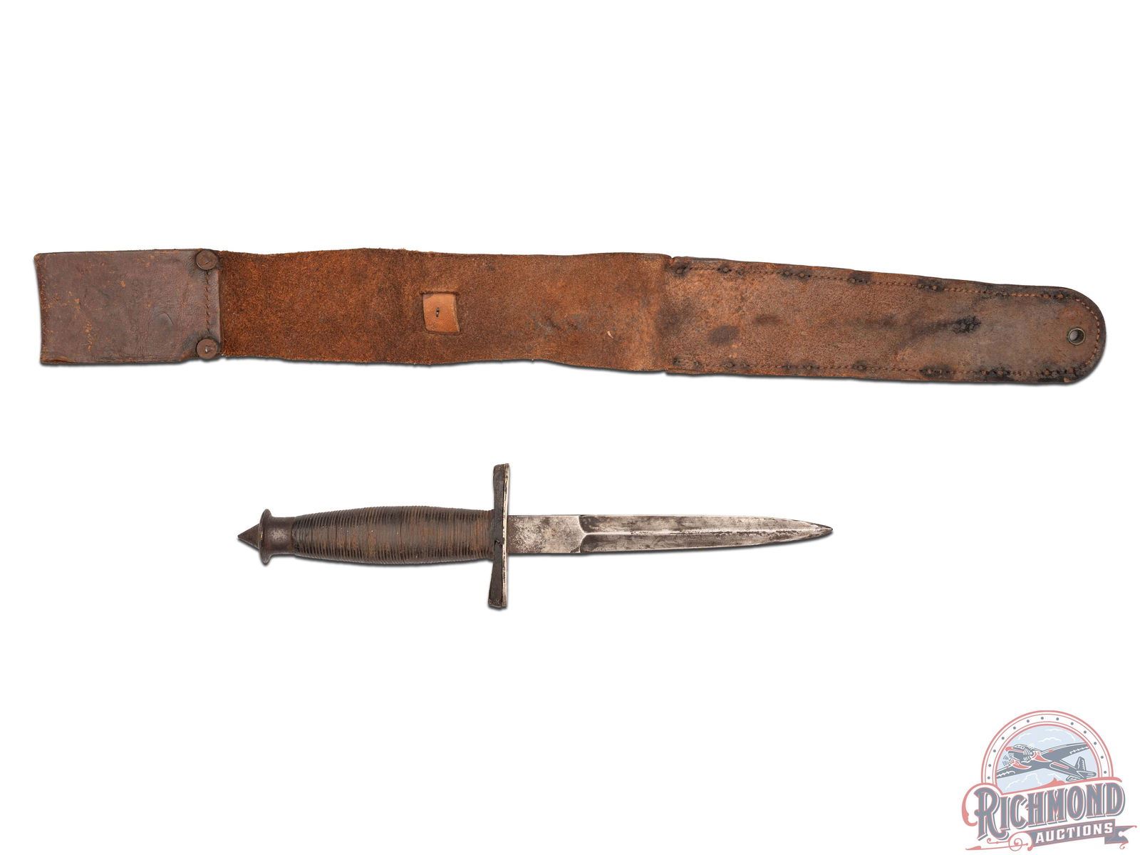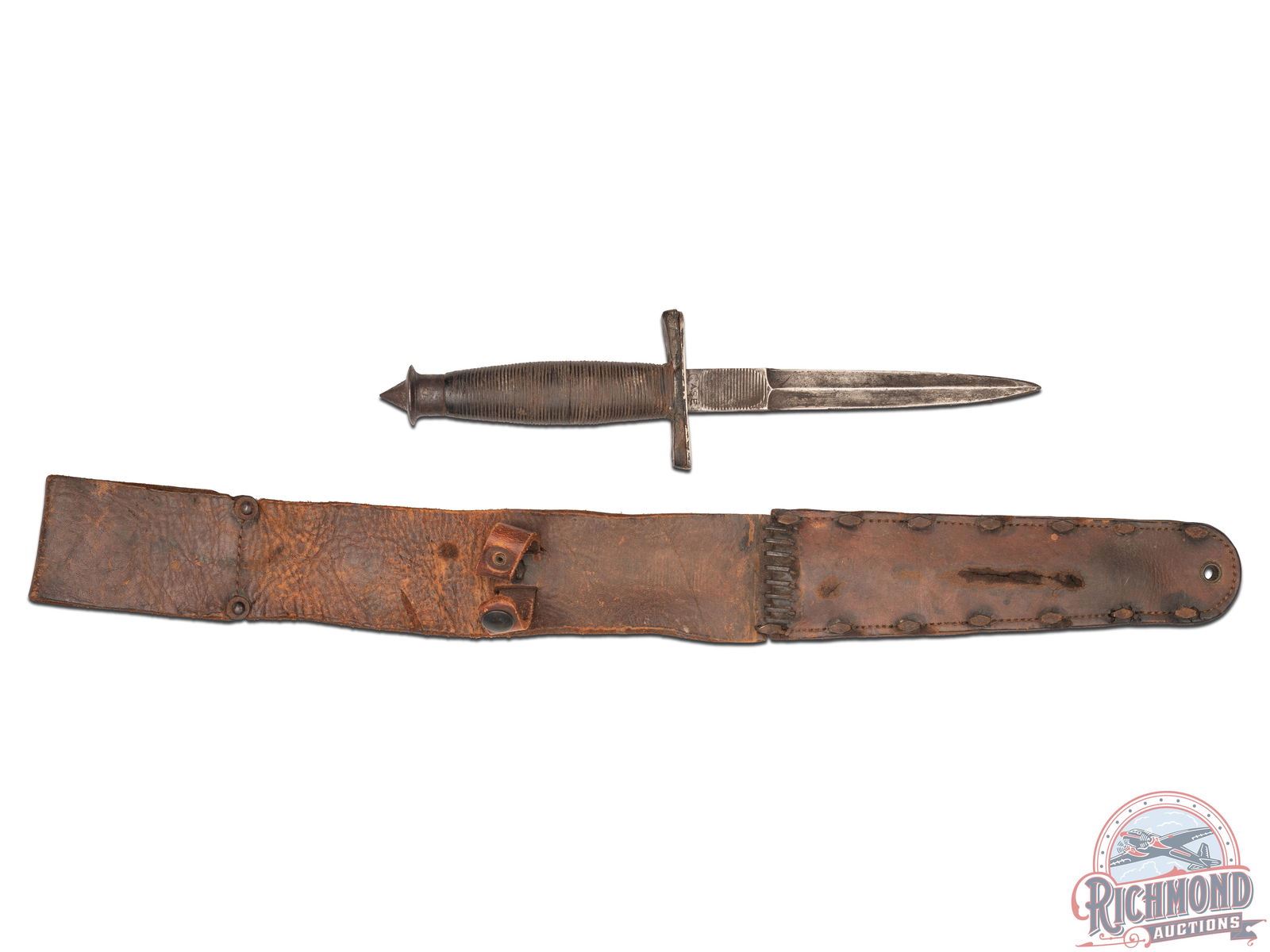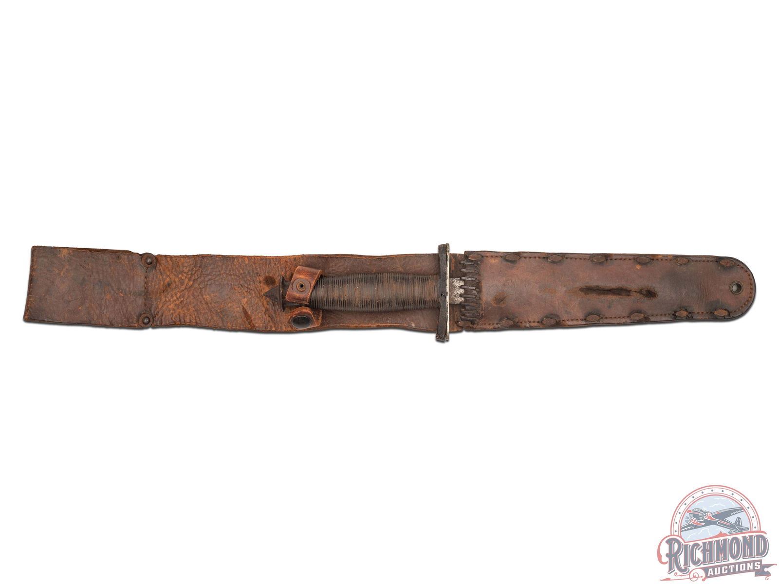 This rare knife was made by W.R. Case & Sons Cutlery Co. in 1942 in Bradford, Pennsylvania. Originally made for use by the First Special Service Force - "The Devil's Brigade". Knife has a 6-1/2" blade with "CASE" stamping at guard. Blade has signature "thumbprint" in front of guard also. Leather cushioned guard with ribbed grip and unique "skull cracker" base. Overall length is 11-1/2", indicating blade has been shortened, possibly due to breakage at some point. Some accounts show that these were sometimes ground down by users to alleviate withdrawal problems and since largely hand made lengths sometimes differed from status quo. Some 70 of theses knives were issued to U.S. Marine Corps Raiders stationed on the U.S.S. Omaha, which was a ship charged with hunting German commerce raiders and blockade runners. When returned or taken home the leather scabbard had "U.S.S. Omaha" on it and was scraped off. This scabbard has that feature along with correct diamond rivets and staple guide, also leather loop at top with rivet loop fastener. J.T. Livengood Collection.