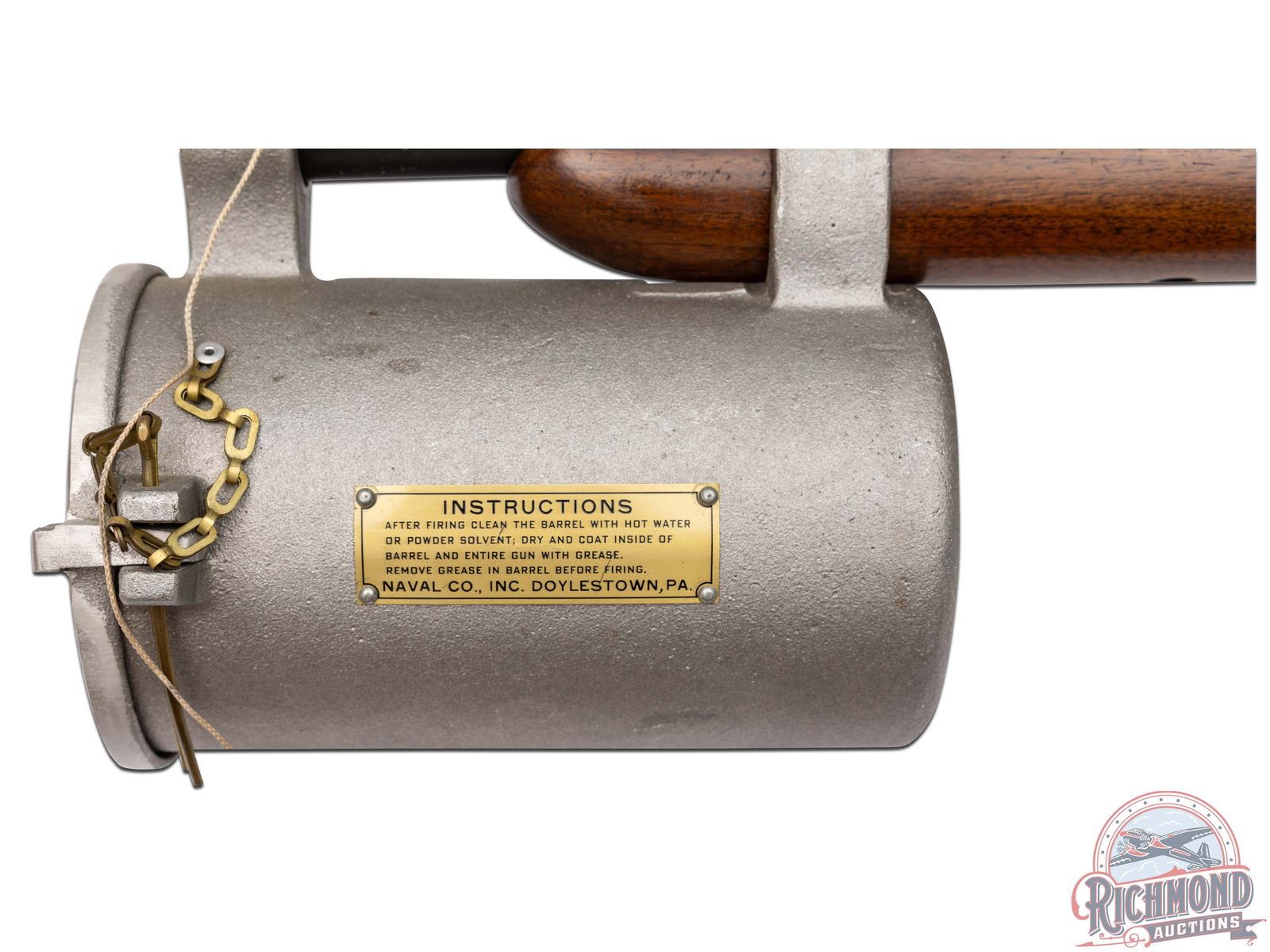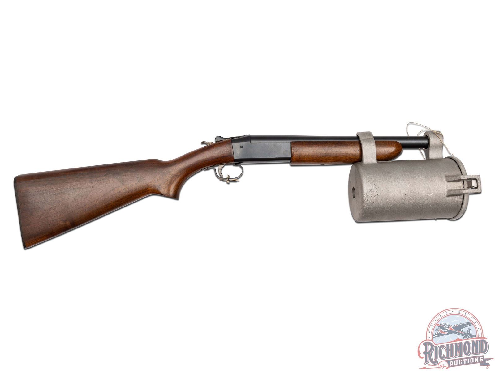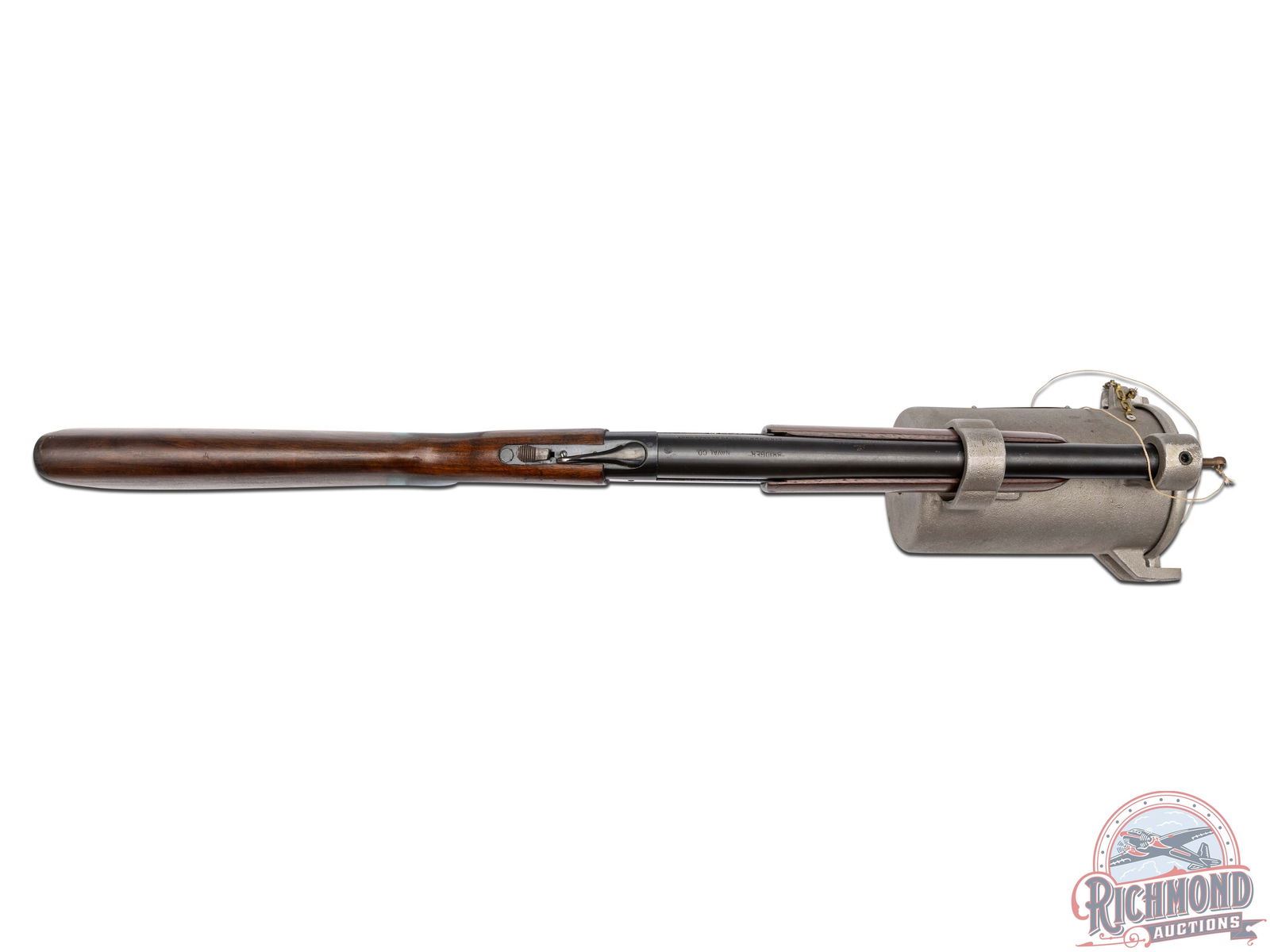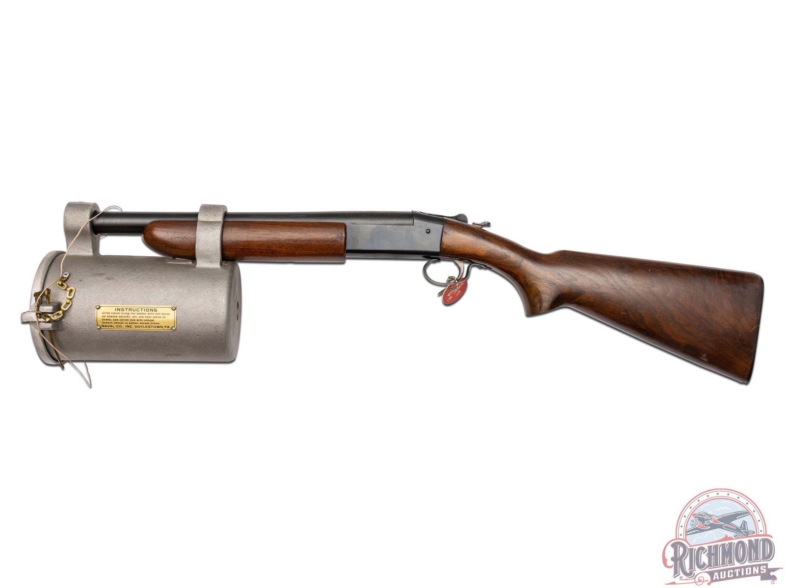 Made by Winchester Repeating Arms, circa 1960, for Naval Company Inc. of Doylestown, Pennsylvania. Gun is known as a "Bridger", was built on a Modified Winchester Model 37 single barrel shotgun. 14" blued Winchester Proof steel barrel marked with Winchester address, "Line Gun-45-70-Blanks Only", Winchester Proofs and on top "Bridger" Naval Co. Attached to barrel is aluminum line canister with rope roll inside, brass latch pin and chain with brass instruction and maker tag. Gun has standard blued Model 37, 12 gauge frame with standard trigger, external hammer type cocking and safety button, and opening lever. Standard walnut plain Model 37 pistol grip stock with Winchester hard rubber butt plate. Standard Winchester Model 37 plain walnut forearm. Comes with Naval Company documents and ATF regulations. NFA exempt. CALIBER: 45-70. FFL STATUS: Curio & Relic.