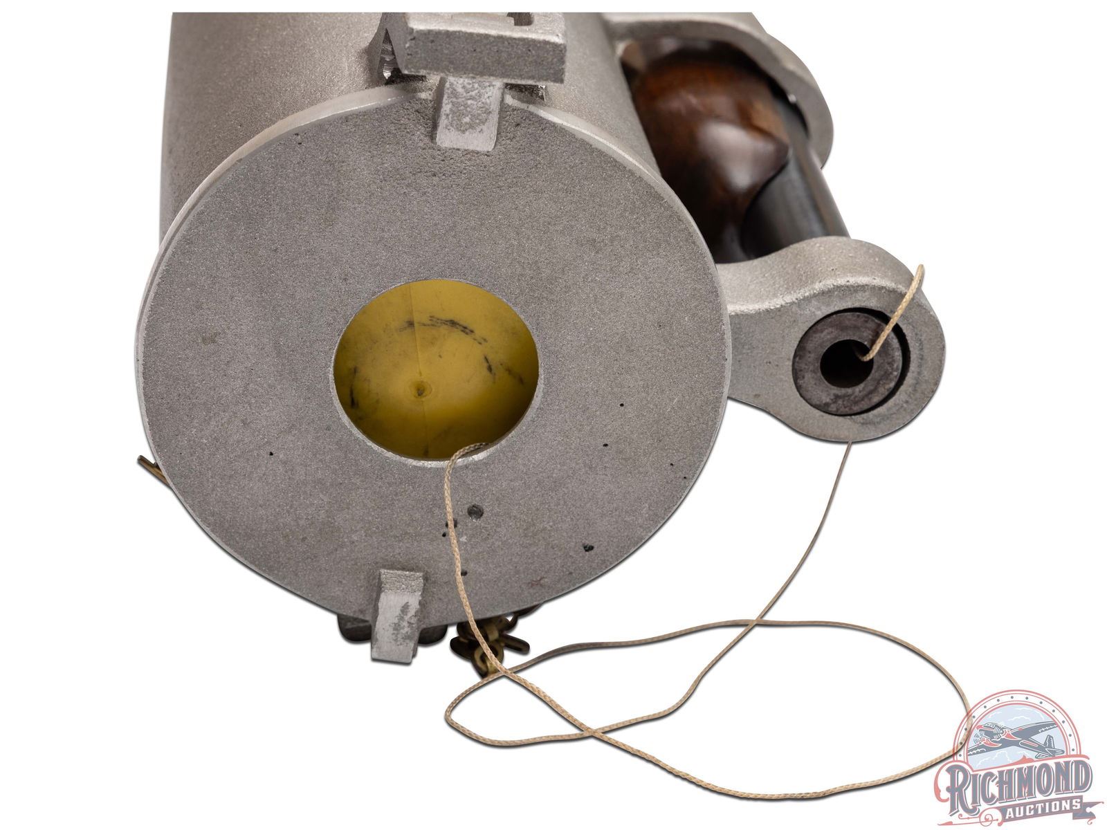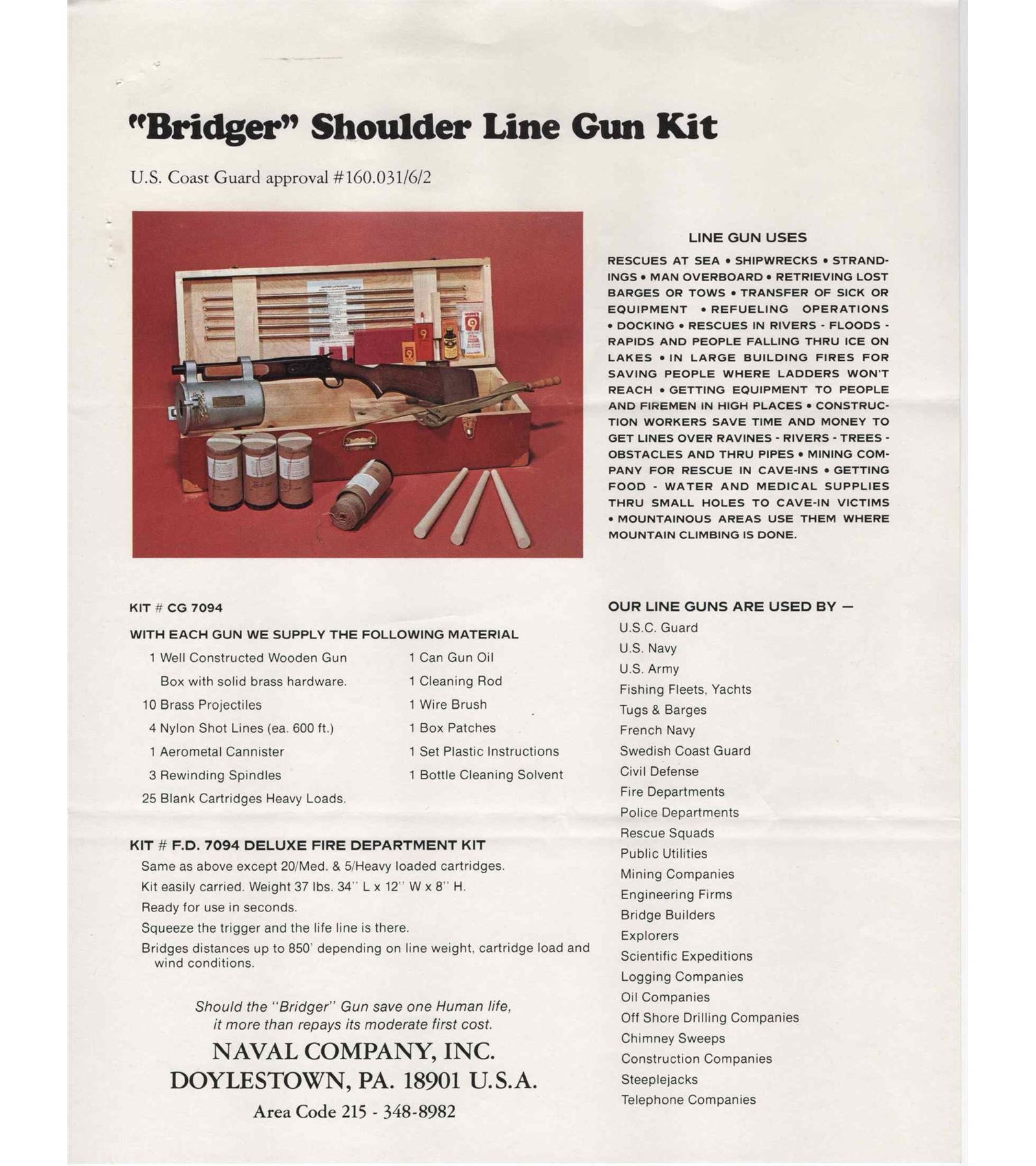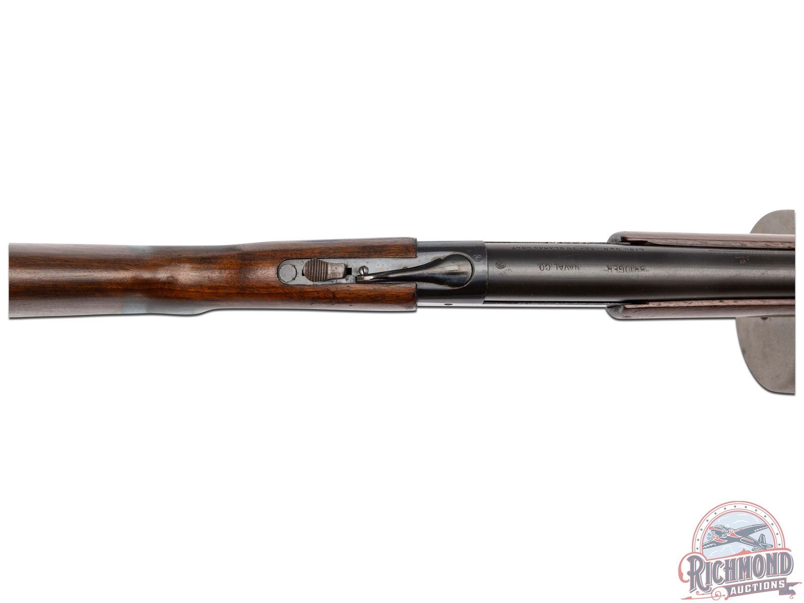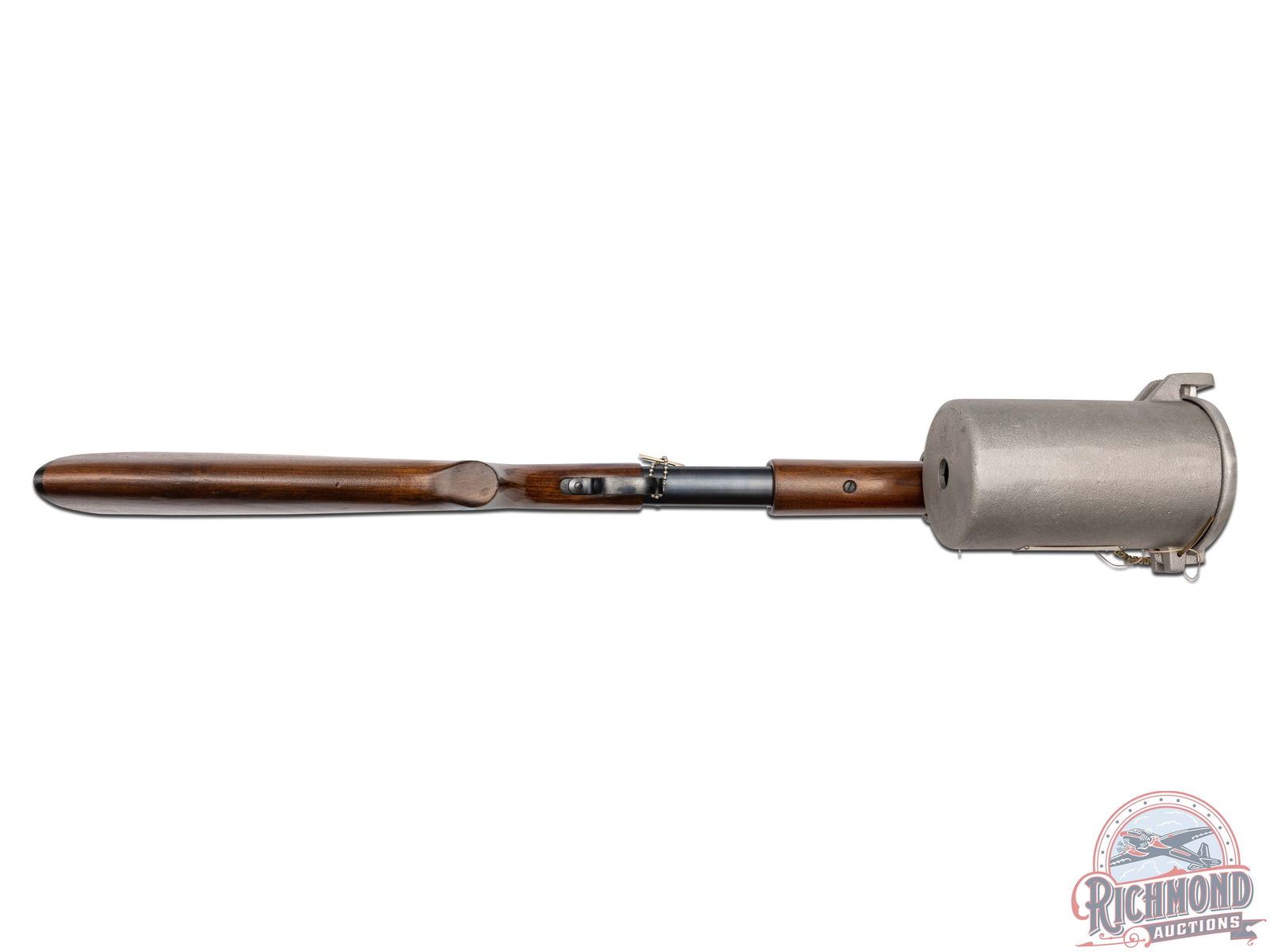 Made by Winchester Repeating Arms, circa 1960, for Naval Company Inc. of Doylestown, Pennsylvania. Gun is known as a "Bridger", was built on a Modified Winchester Model 37 single barrel shotgun. 14" blued Winchester Proof steel barrel marked with Winchester address, "Line Gun-45-70-Blanks Only", Winchester Proofs and on top "Bridger" Naval Co. Attached to barrel is aluminum line canister with rope roll inside, brass latch pin and chain with brass instruction and maker tag. Gun has standard blued Model 37, 12 gauge frame with standard trigger, external hammer type cocking and safety button, and opening lever. Standard walnut plain Model 37 pistol grip stock with Winchester hard rubber butt plate. Standard Winchester Model 37 plain walnut forearm. Comes with Naval Company documents and ATF regulations. NFA exempt. CALIBER: 45-70. FFL STATUS: Curio & Relic.