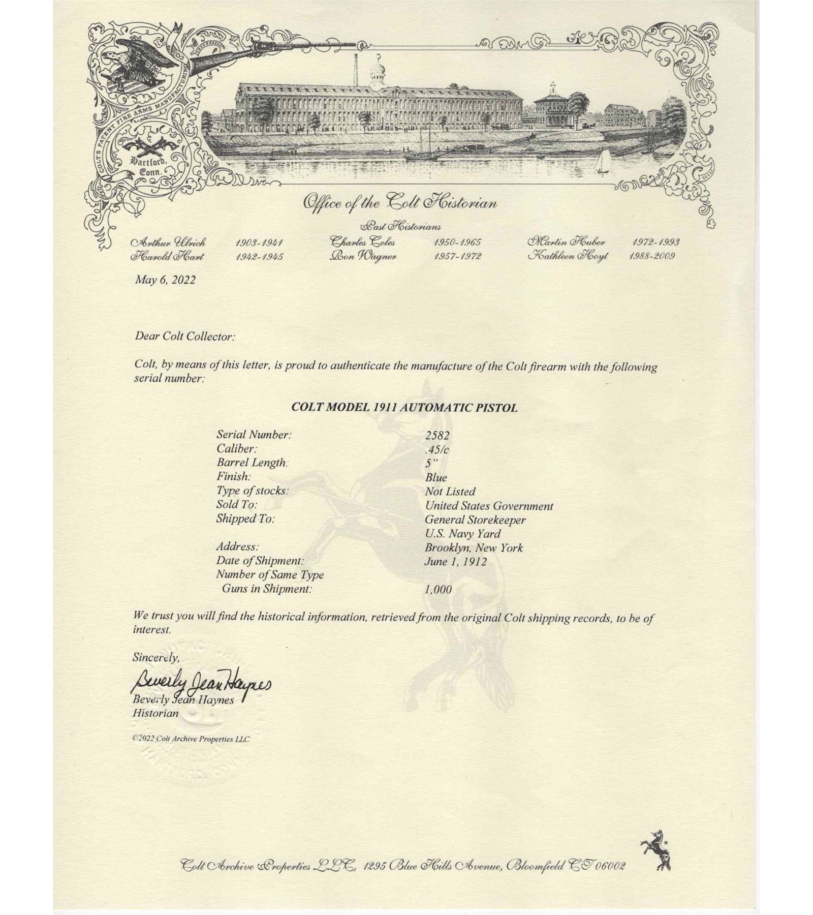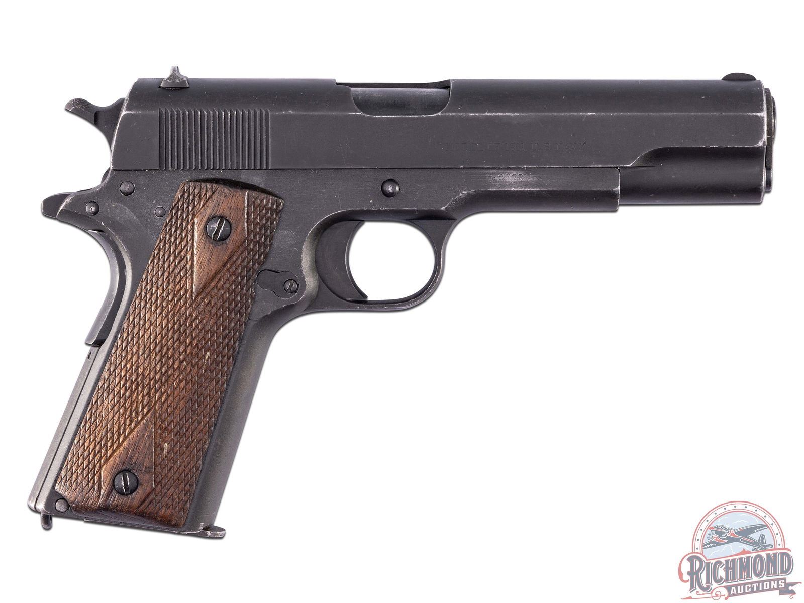 This Authentic Rarely seen 4-Digit Serial number Colt 1911 was manufactured in 1912. Colt Archive letter is included and provides the following information: Shipped to General Storekeeper, US Navy Yard in Brooklyn, NY on June 1, 1912. Left side of the frame is stamped "UNITED STATES PROPERTY" with import stamp, assuming after service, is stamped on the left side above trigger guard. Inspection stamp by Major Walter G. Penfield. Left side of the slide is stamped "PATENTED APR.20 1897 SEPT, 9 1902 DEC, 19 1905 FEB, 14 1911" "COLT'S PT. F.A. MFG CO. HARTFORD, CT U.S.A.". Right side of the slide is stamped "MODEL OF 1911 U.S. NAVY" with serial number stamped on the frame below the slide. Features period correct iron sights, lanyard loop and diamond checkered walnut grip panels. Includes 8 round magazine. This is a must have edition for any Colt or 1911 collector! CALIBER: 45 ACP. S/N: 2582. FFL STATUS: Curio & Relic.