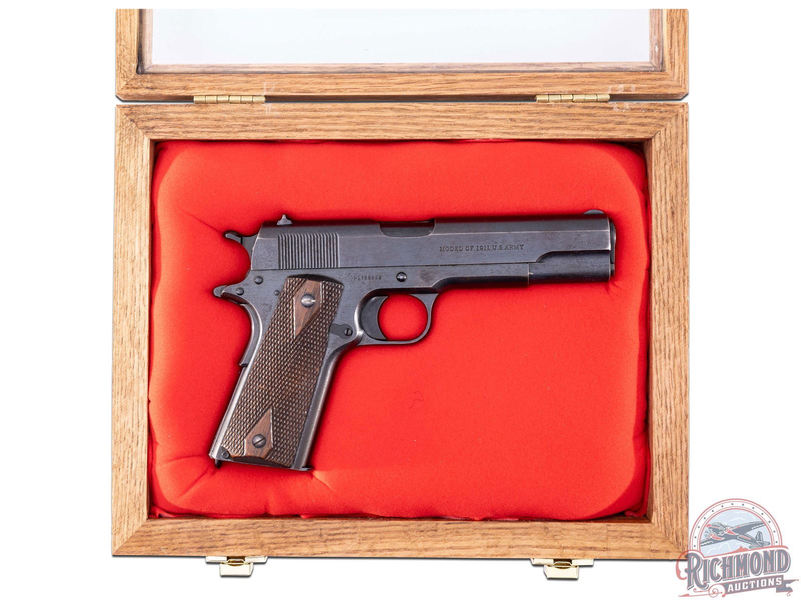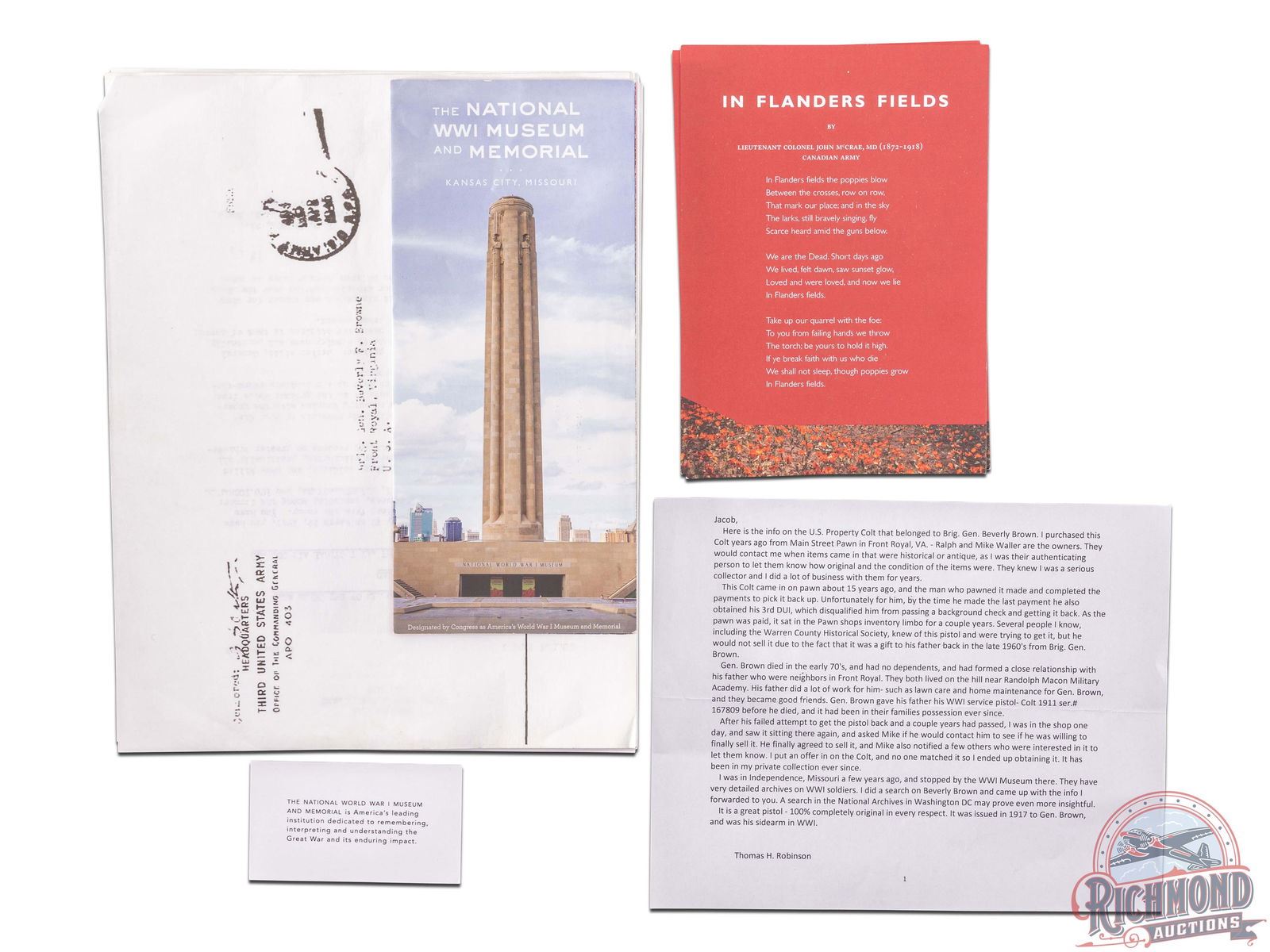 Manufactured in 1917, this United States Property Colt 1911 pistol is all original. Features a 5" barrel, blued finish, period correction notch and half-moon front sight, diamond checkered wood grips, lanyard loop and the two-tone magazine. All standard Colt stampings, right side of the slide stamped "MODEL OF 1911 U.S. ARMY". Right side of the frame is stamped with the serial "No 169809". Left side of the slide is stamped with the two-line Colt patent address and Rampant Colt on the rear of the serrations. Left side of the frame is stamped "UNITED STATES PROPERTY", and Major Gilbert H Stewart's proof mark behind the trigger. Comes in red foam lined oak display case with glass top with correspondences between Brigadier General Beveraly Browne and US Army General George S. Patton Jr, and Mr. Browne's military and ancestry history. CALIBER: 45 ACP. S/N: 169809. FFL STATUS: Curio & Relic.