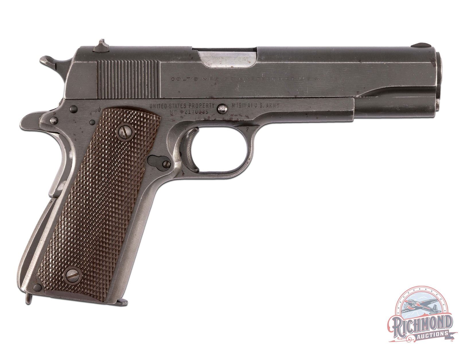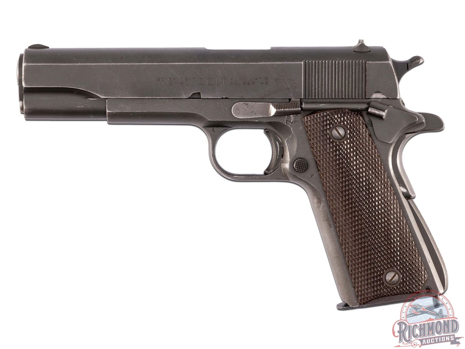 Manufactured in 1945 during WWII. This military issued M1911A1 features a 5" barrel, with period correct iron sights. Left side of the slide is stamped "GOVERNMENT MODEL / COLT / AUTOMATIC CALIBER .45" with the Rampant Colt logo. Inspection stamp by "FJA" by Col. Frank J. Atwood on the frame below the slide stop, "4" stamped on the top corner of the trigger guard and a "P" below the mag release. Left side of the slide is stamped "COLT'S MFG. CO HARTFORD CT. U.S.A.". Right side of the frame is stamped "UNITED STATES PROPERTY / M1911 A1 U.S. ARMY" with the serial number below. A partial "crossed cannon" inspection mark in the top rear corner of the frame. Features period correct lanyard loop and diamond checkered synthetic brown grip panels. Includes 8 round magazine, stamped "COLT 45 AUTO" on the base. A beautiful edition to any Colt collection! CALIBER: 45 ACP. S/N: 2170035. FFL STATUS: Curio & Relic.
