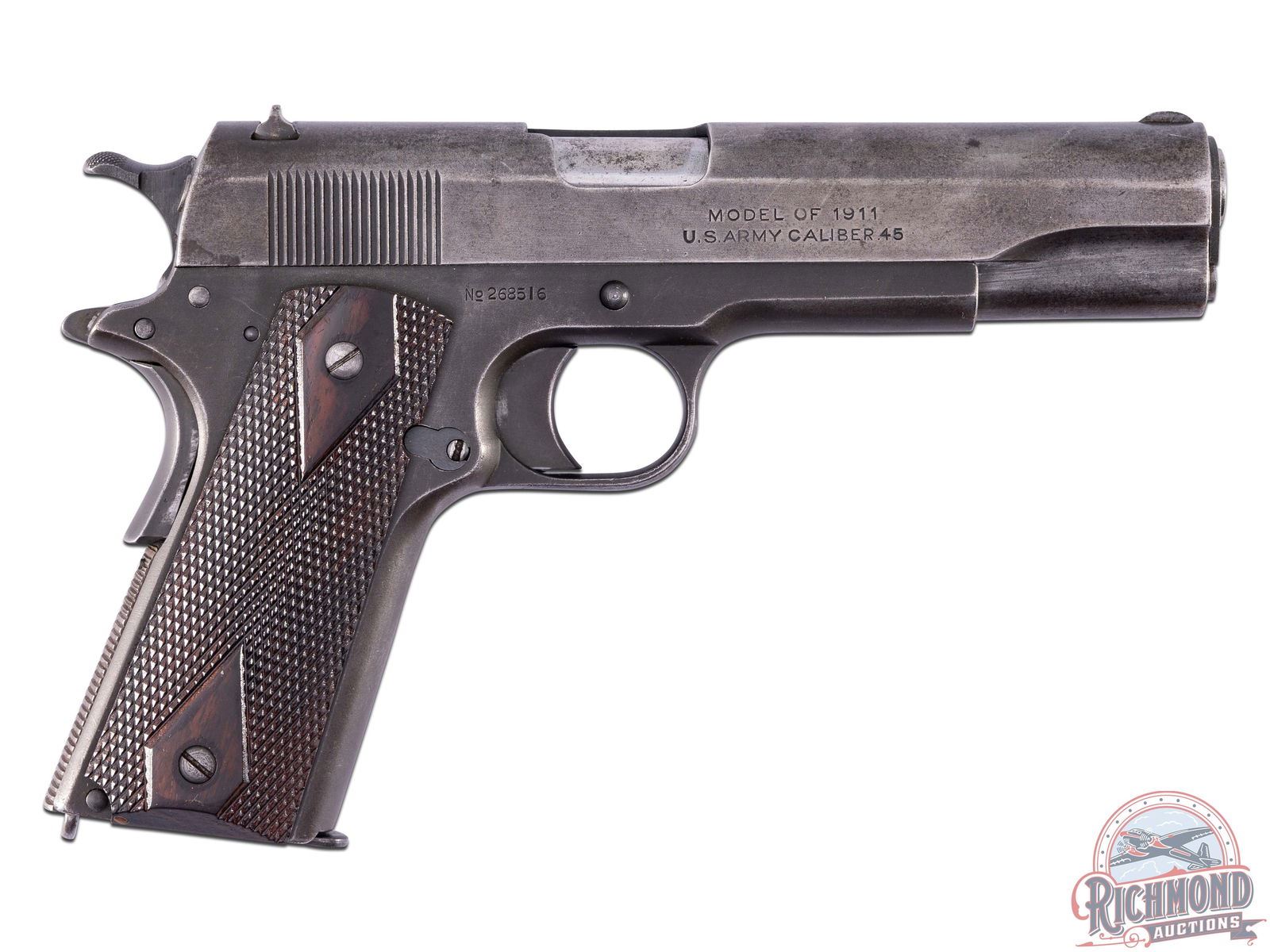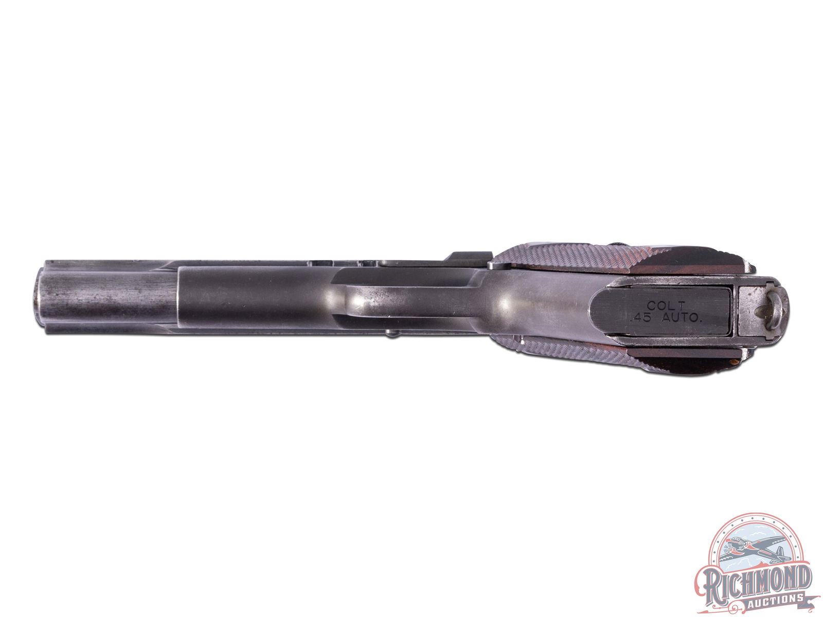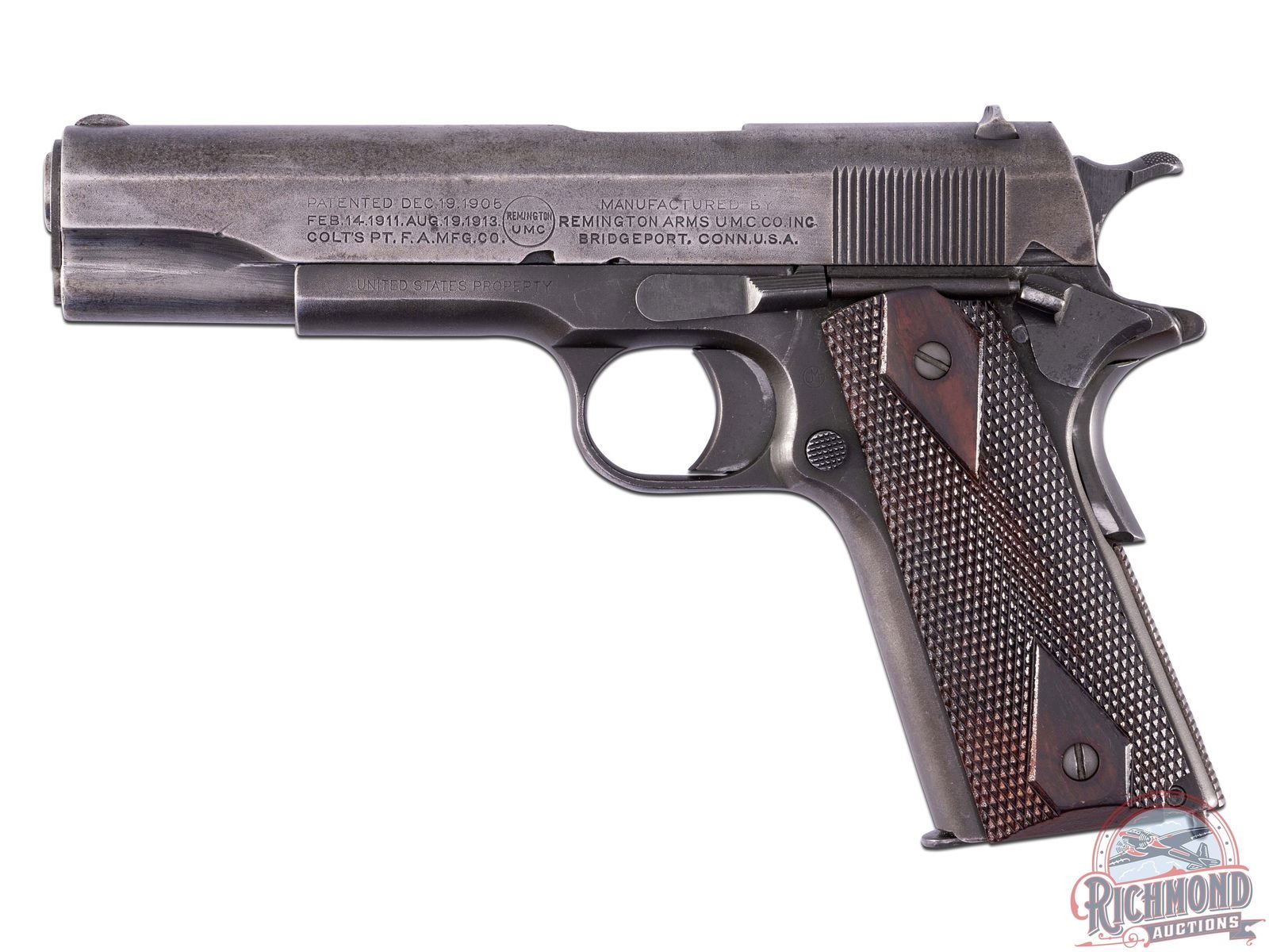 Manufactured in 1918 both Remington UMC slide and Colt frame. Full size model 1911 featuring a 5" barrel, period correct iron sights, manual thumb safety and grip safety and lanyard loop. Left side of the slide features Colt's patent dates, the Remington UMC circled logo, and a three line Remington Arm's address. The left side of the frame is stamped "UNITED STATES PROPERTY" and marked with the "J.M.G." inspectors mark for Major John M. Gilbert who was responsible for Colt production inspection during the WWI time frame. Right side of the slide is stamped "MODEL OF 1911 / U.S. ARMY CALIBER 45" with the serial number stamped below on the frame. Fitted with original style diamond checkered walnut wood grips and includes a Colt factory 8 round magazine. CALIBER: 45 ACP. S/N: 268516. FFL STATUS: Curio & Relic.