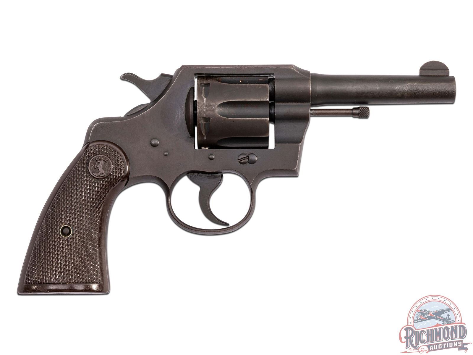 Manufactured in 1943, one of approximately 36,000 sent to the U.S. Army Ordnance Department by Colt to arm stateside guards, police and security. U.S. military mark of the Ordnance bomb cartouche on the upper left corner of the frame. Features a 4" barrel with integrated rear notch sight and blade front sight. Top of the barrel is stamped with the two-line Colt address. Left side of the barrel is stamped "COLT COMMANDO / .38 SPECIAL". Six-round fluted swing-out cylinder chambered for the .38 Special cartridge. Parkerized finish and fitted with factory Colt brown synthetic checkered grips. CALIBER: 38 SPL. S/N: 21341. FFL STATUS: Curio & Relic.