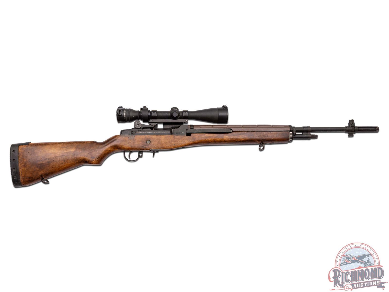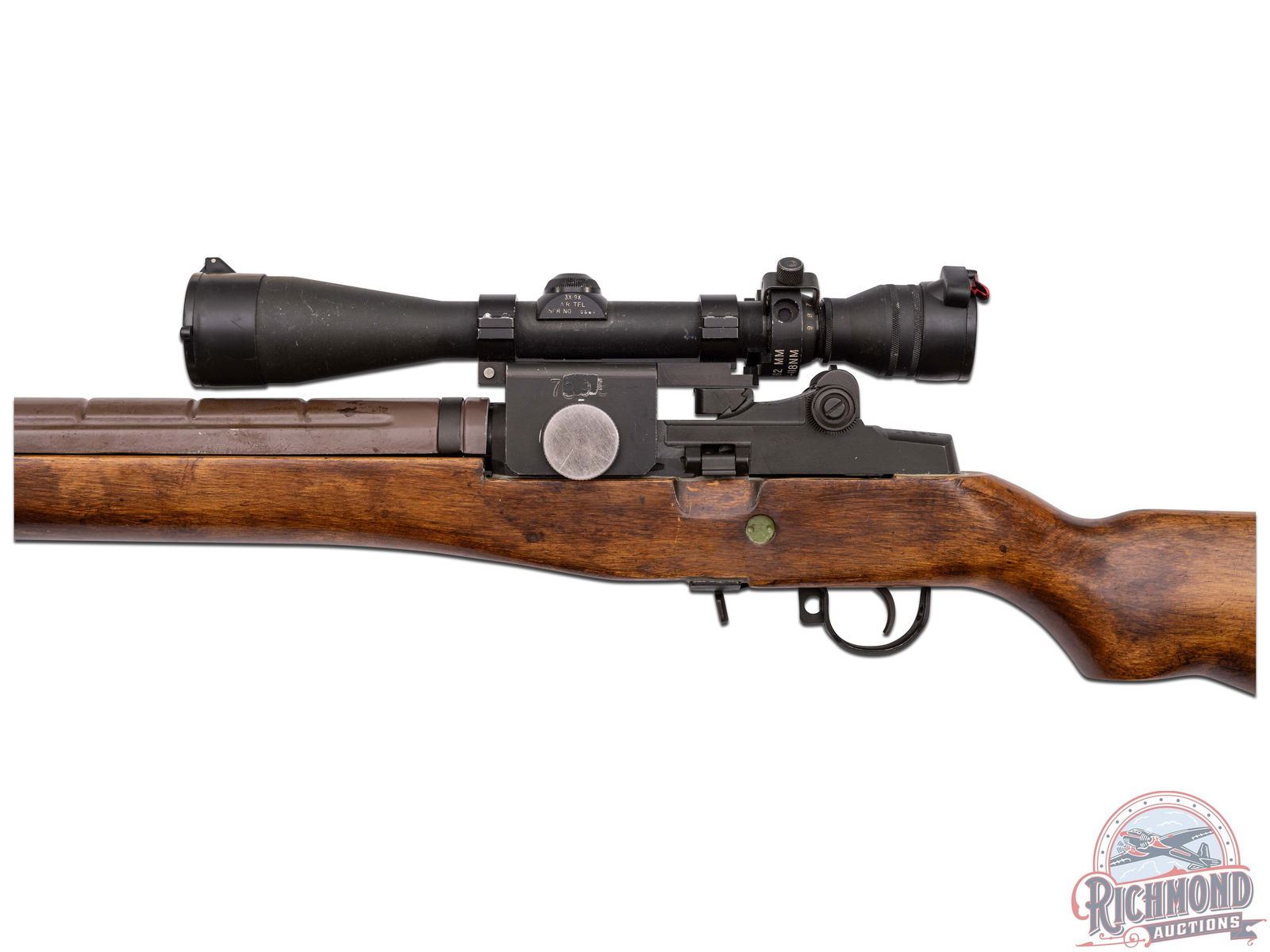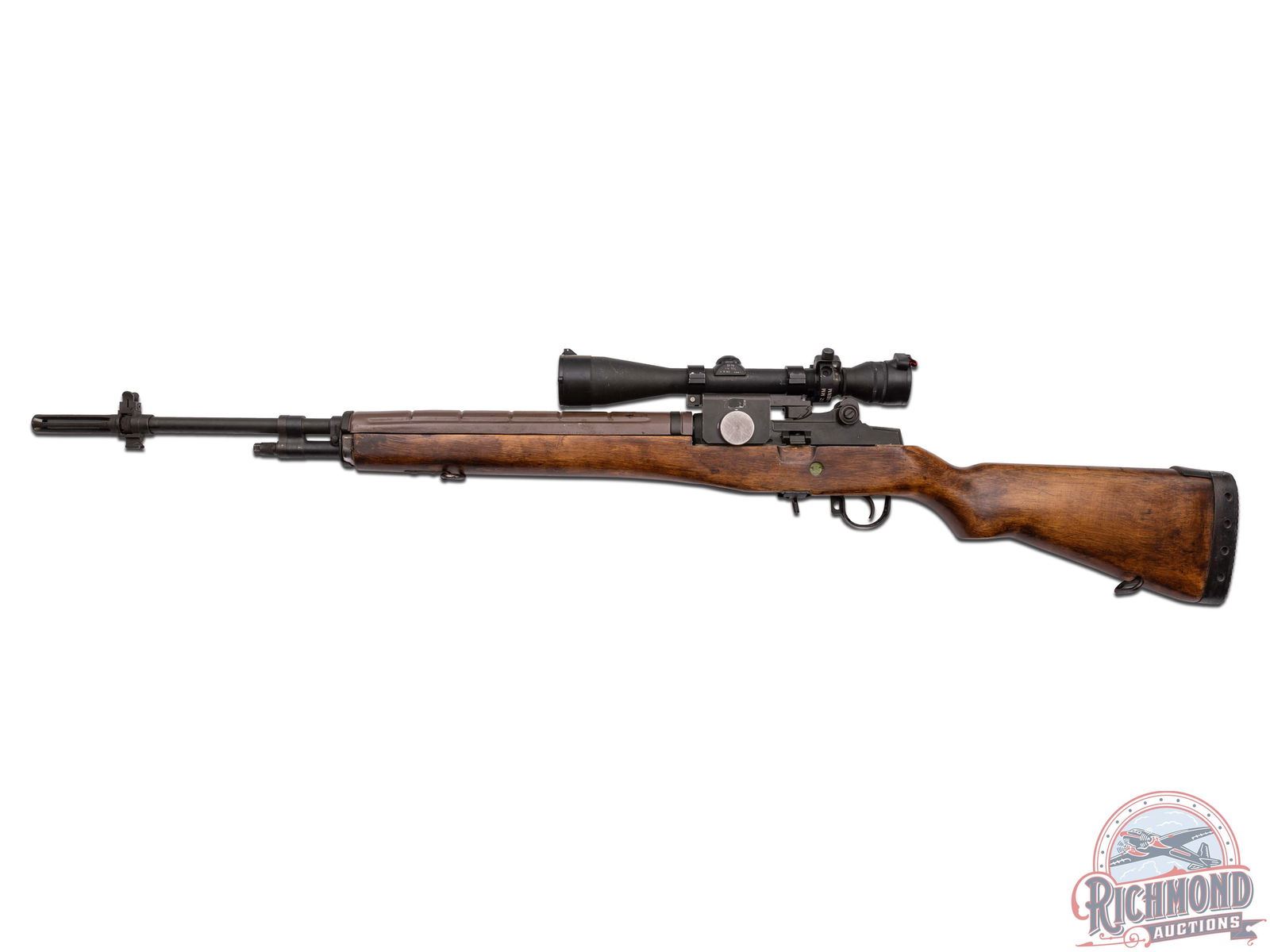 Made by Springfield Armory at Geneseo, Illinois on a circa 1980 action. 25" blued barrel including flash suppressor with "Geneseo, Ill." marking with standard sights and fitted with Redfield "AR Tel" 3-9x Duplex reticle scope. Steel frame with removed cut-off switch and "TRW" bolt. Springfield op-rod and trigger group with missing magazine. G.I. stock with "P" proofs, modified by unknown gunsmith or shooter with added recoil pad and fiber filling for accuracy. Standard plastic handguard. CALIBER: 7.26. S/N: 012487. FFL STATUS: Modern.