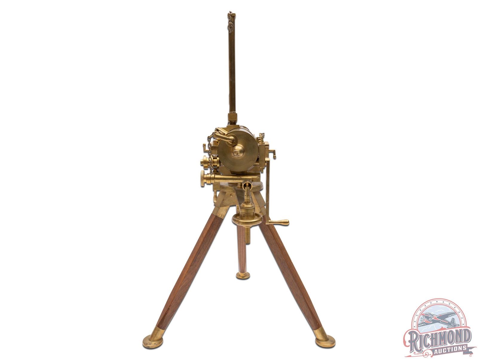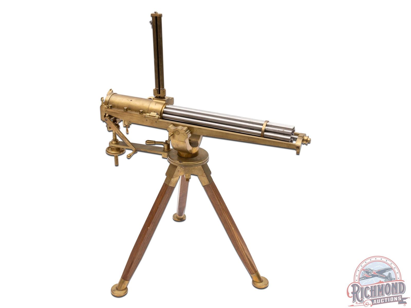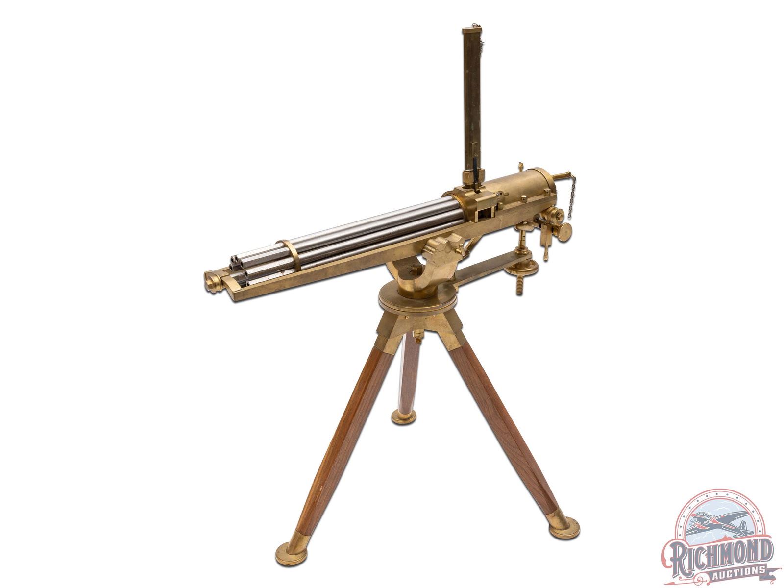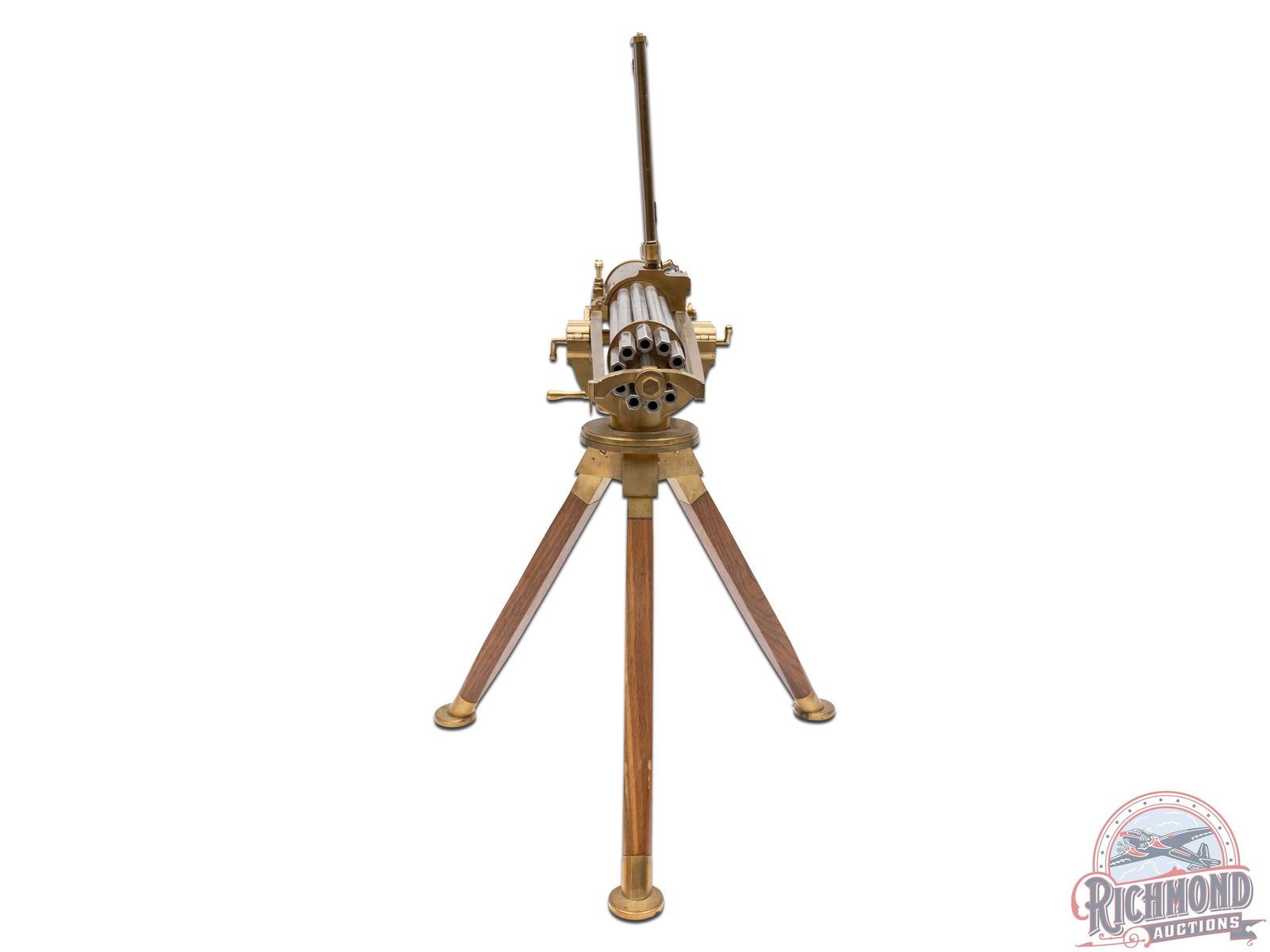 Reproduction 3/4 scale Gatling Gun Attributed To Thunder Valley Machine of Clinton, Ohio made circa 1969. Gun is an exact miniature copy of Dr. Gatling's famous gun with 10 polished steel hexagon 12" barrels in cluster chambered in .22 Long Rifle caliber. Gun measures 20" from muzzle to back of action and stands 25" to the top of the brass detachable 50 round magazine. Gun is made of brass with tripod wooden stand with brass feet. Comes with some Thunder Valley Letters with product descriptions but gun is unmarked and consignor attributed. CALIBER: 22. FFL STATUS: Curio & Relic.