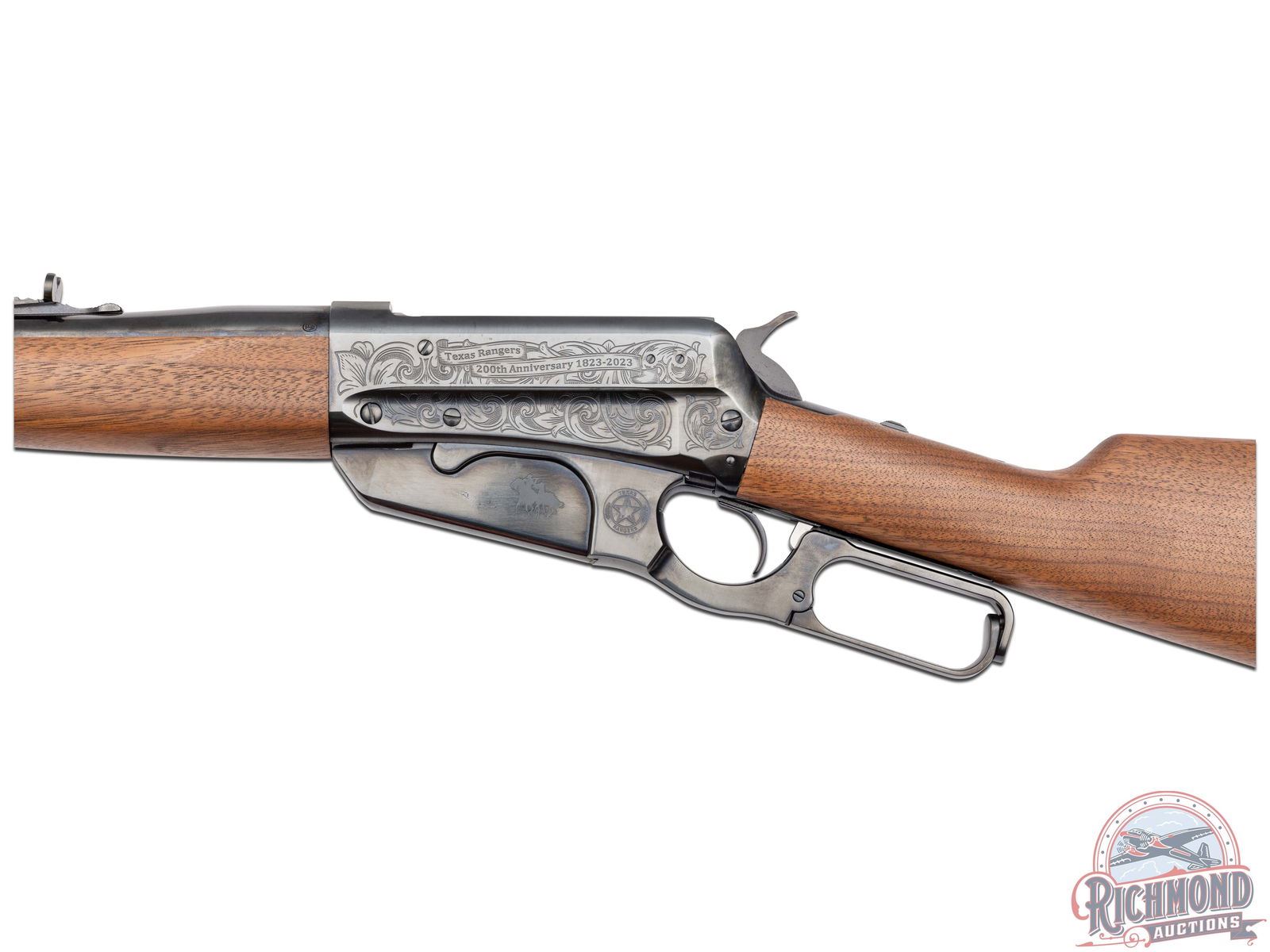 This beautiful Winchester 1895 exclusive lever action was produced in 2023 to commemorate the 200th anniversary of the Texas Rangers. Serial number 57 of only 500 made! Features include a 22" blued barrel with standard markings, a gold bead on blade front sight and rear semi-buckhorn sight. Smooth straight grain walnut stock and forearm with a Texas Rangers silver tone seal inlaid on the right side of the stock. The blued receiver features 75% engraving in a floral scroll motif. The left side has a banner engraved "TEXAS RANGERS / 200TH ANNIVERSARY 1823-2023" and Texas Rangers seal on the lever and a cowboy silhouette engraved on the magazine. Also features a tang safety, and a 4 round capacity magazine. Comes in the original factory box with Certificate of Authenticity, factory paperwork and cable lock. CALIBER: 30-06 SPRG. S/N: TXRNGH0057. FFL STATUS: Modern.