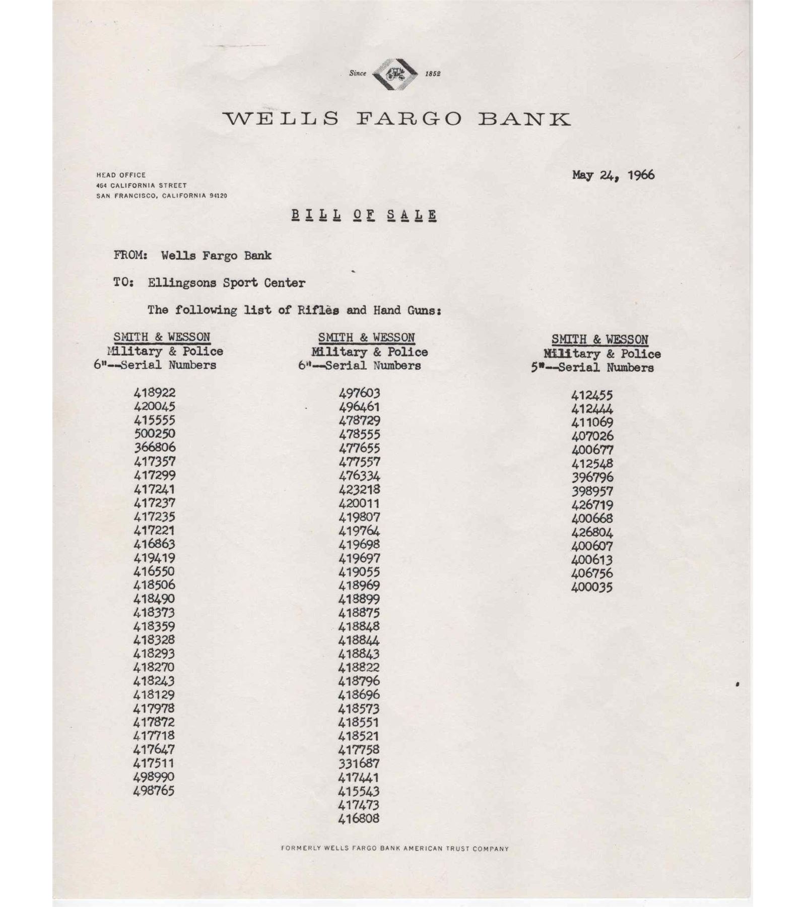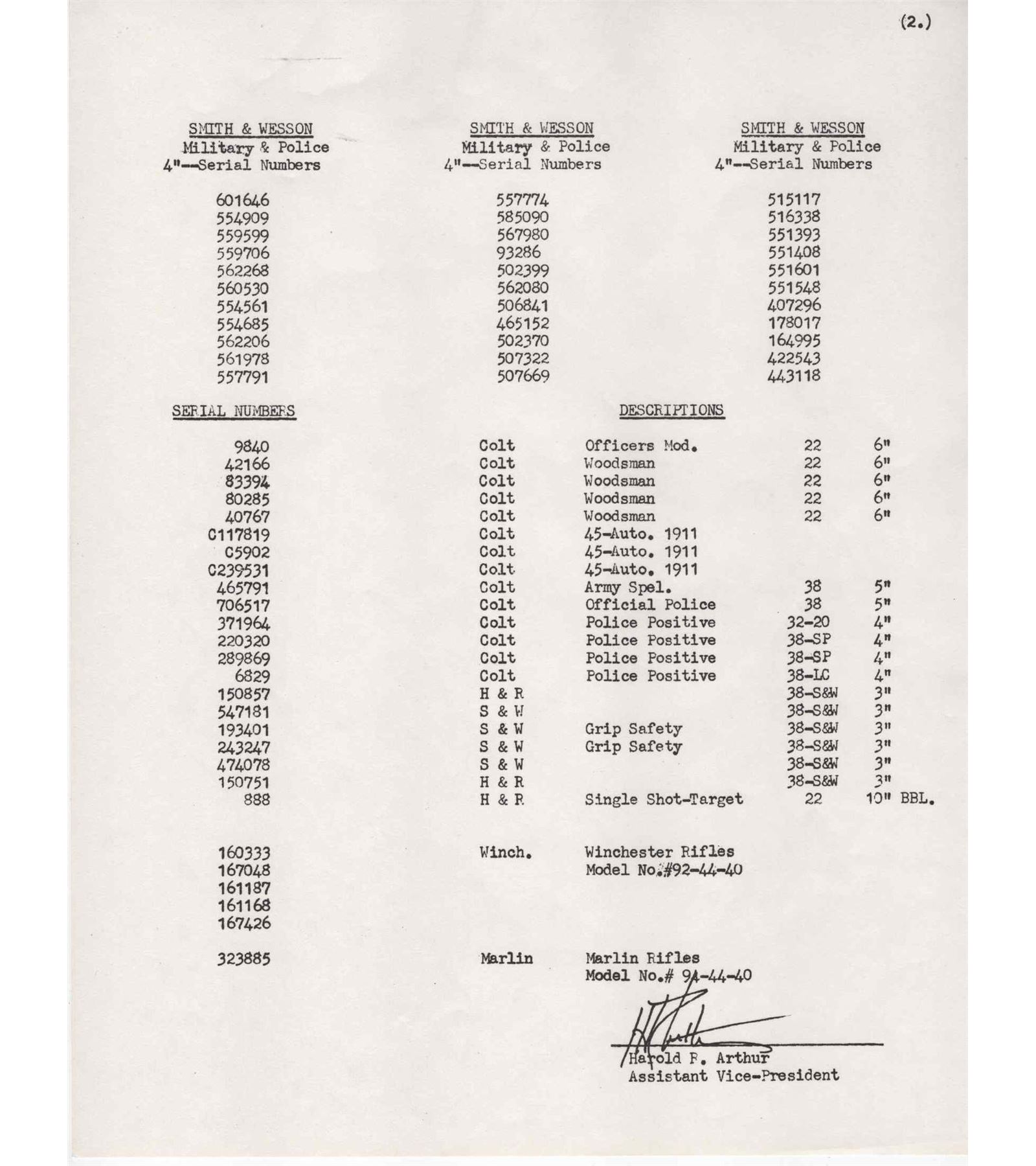 Manufactured in 1943, this Colt Official Police features a 5" barrel, blued finish, rear integrated notch and blade front sight. Standard two line Colt address on top, left side of the barrel stamped "COLT / OFFICIAL POLICE / 38". Six round swing-out fluted cylinder chambered for .38 special. Matching serial number stamped on the inside of the frame and on the crane. Factory checkered wood grips with Colt silver tone medallions. Includes Wells Fargo factory letterhead Bill of Sale with this firearm listed on page two, the only Official Police listed! CALIBER: 38 SPL. S/N: 706517. FFL STATUS: Curio & Relic.