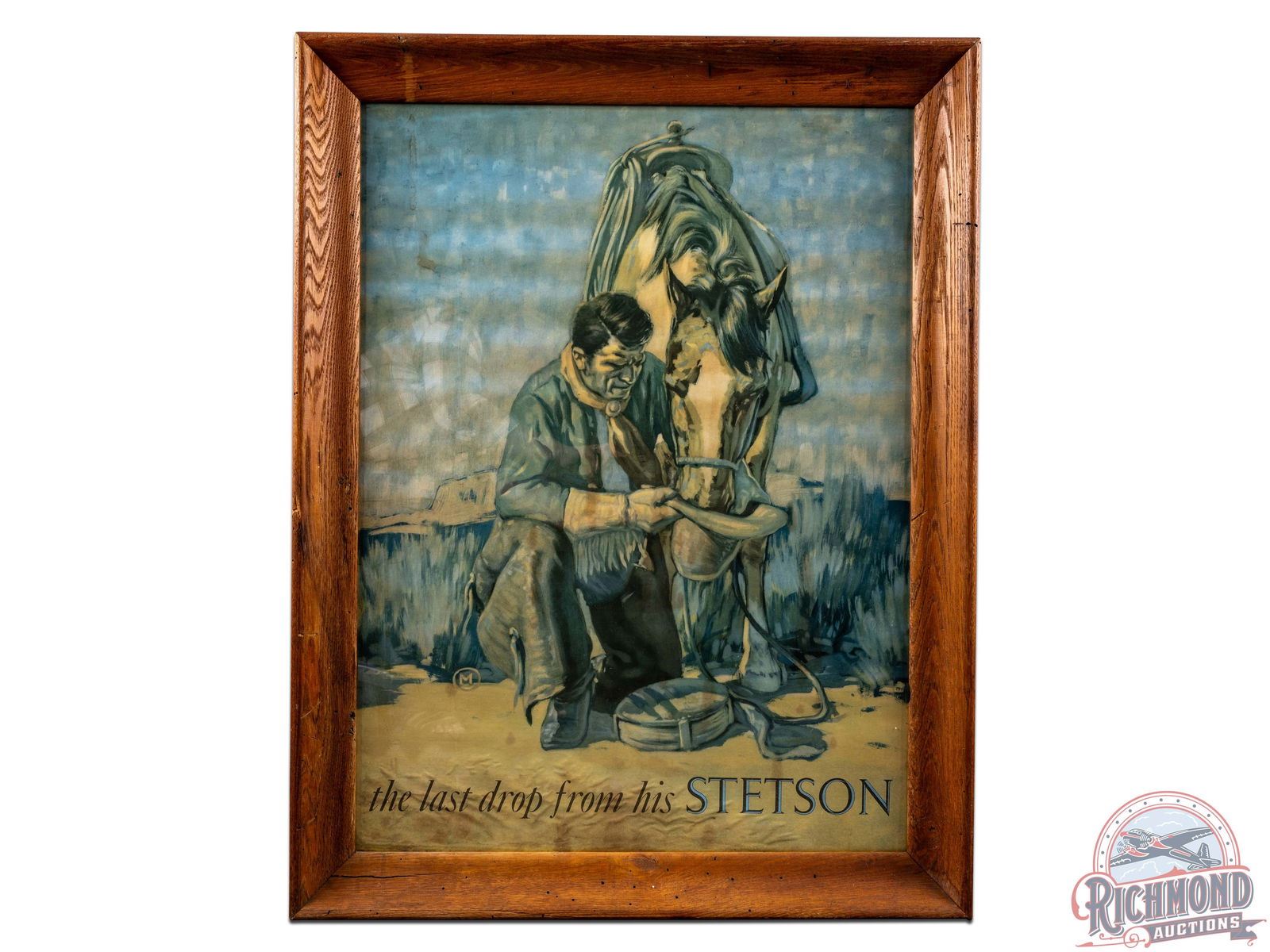 Paper poster with good color and graphics, featuring a touching scene of a cowboy letting his horse drink water from his Stetson hat. Poster has general age toning throughout and exhibits some signs of light staining along the bottom. Framed and under glass. The frame is in good condition and exhibits some wear, specifically a slight surface crack along the bottom left corner. Dimensions are of the frame. 35.5" H x 27.75" W.