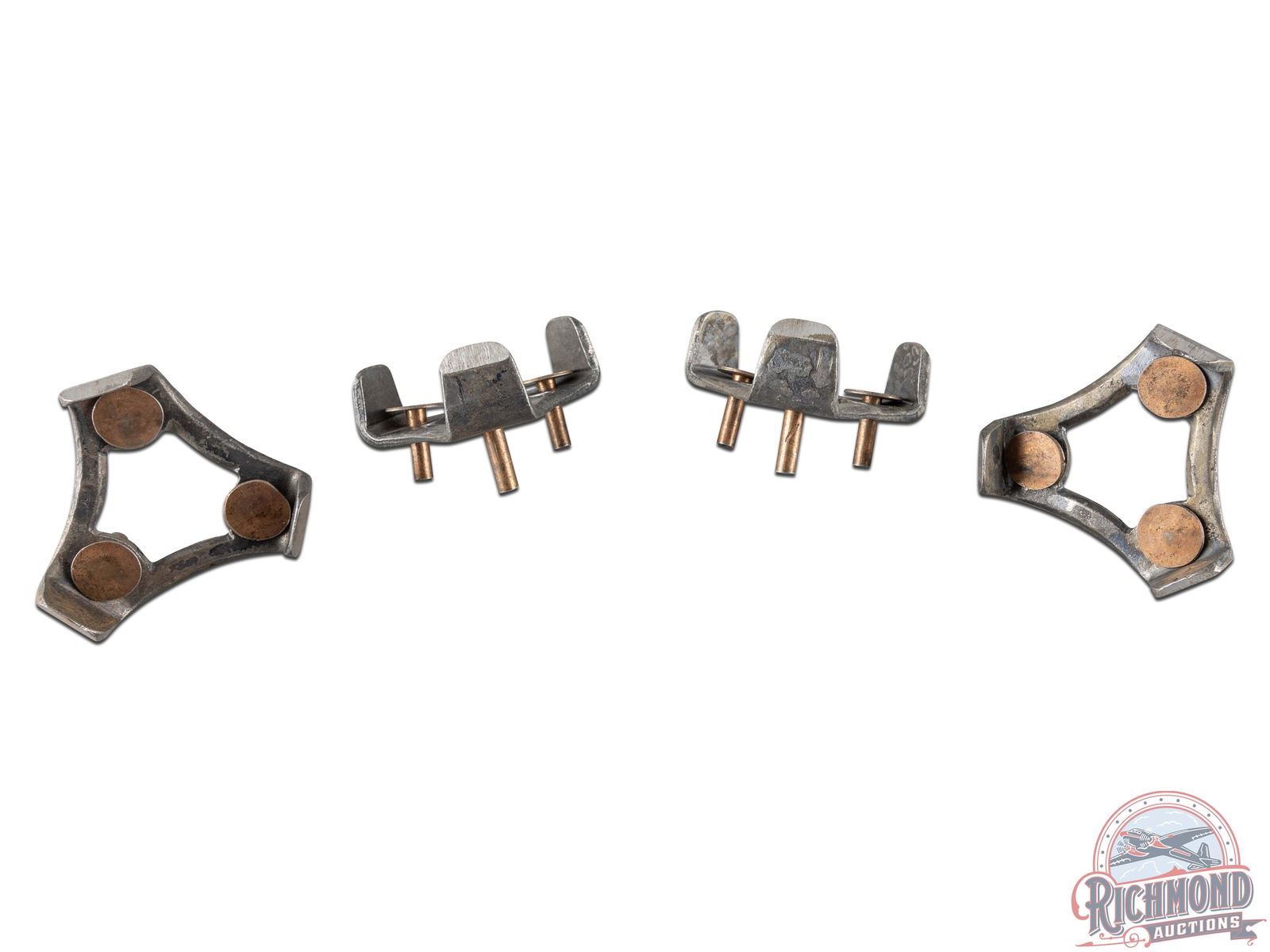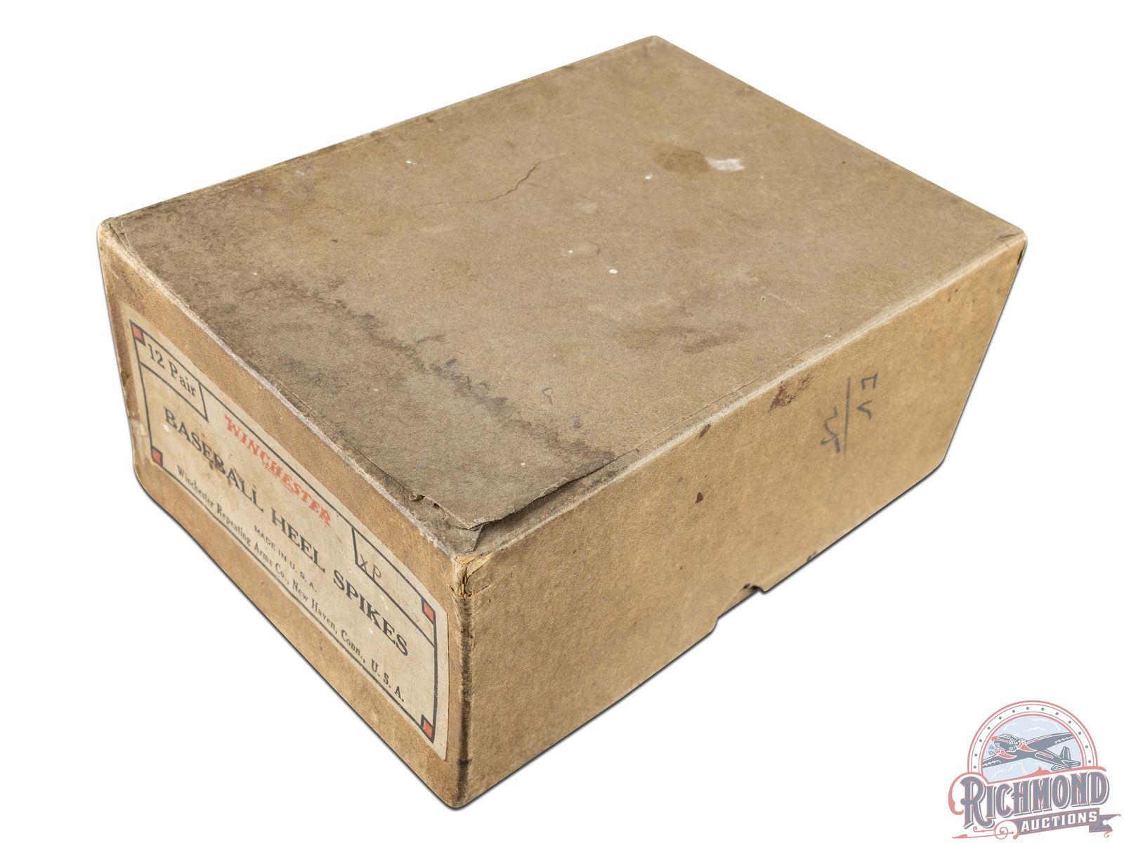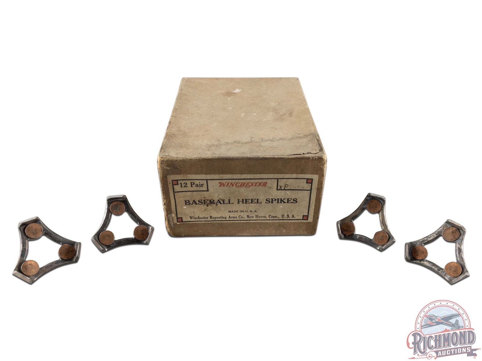 Scarce pair of Winchester metal baseball heel spikes and original cardboard box. Spikes appear to be new old stock. Original cardboard box retains the label and was used to hold 12 pairs of spikes. Label reads Winchester Repeating Arms Co., XP. Original box exhibits some water damage on top with slight separation in one corner. General age and storage wear in spots and a few pencil marks on one side of the box. Overall, a hard to find piece of Winchester baseball history. 3.75" H x 7.5" W.