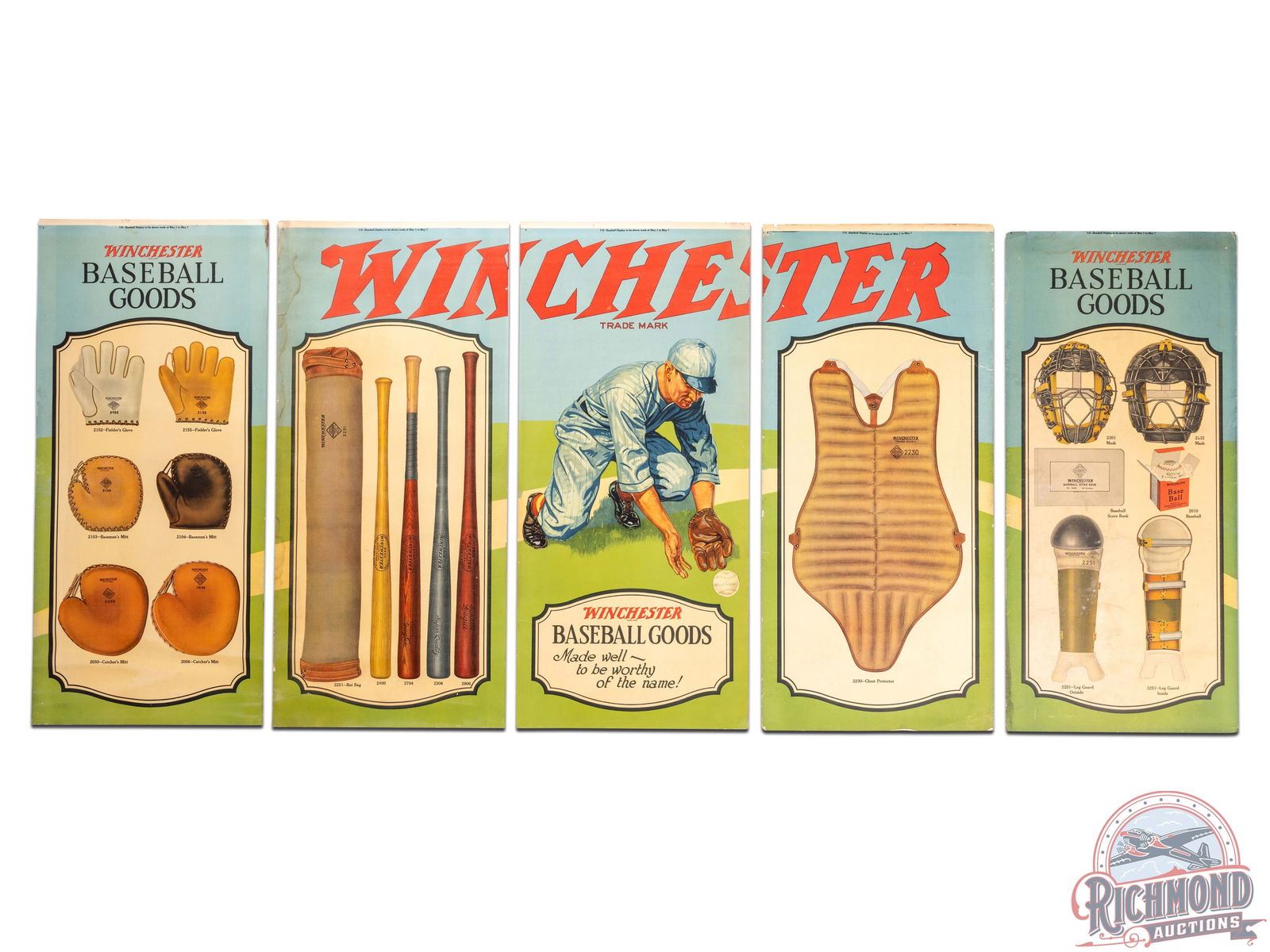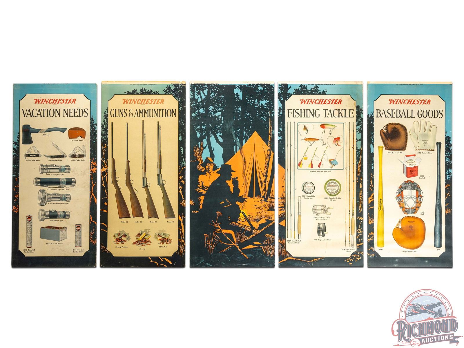 Lot 380 Complete 1922 Winchester "Baseball Goods" & "Vacation Needs" 5 Panel Display Sign