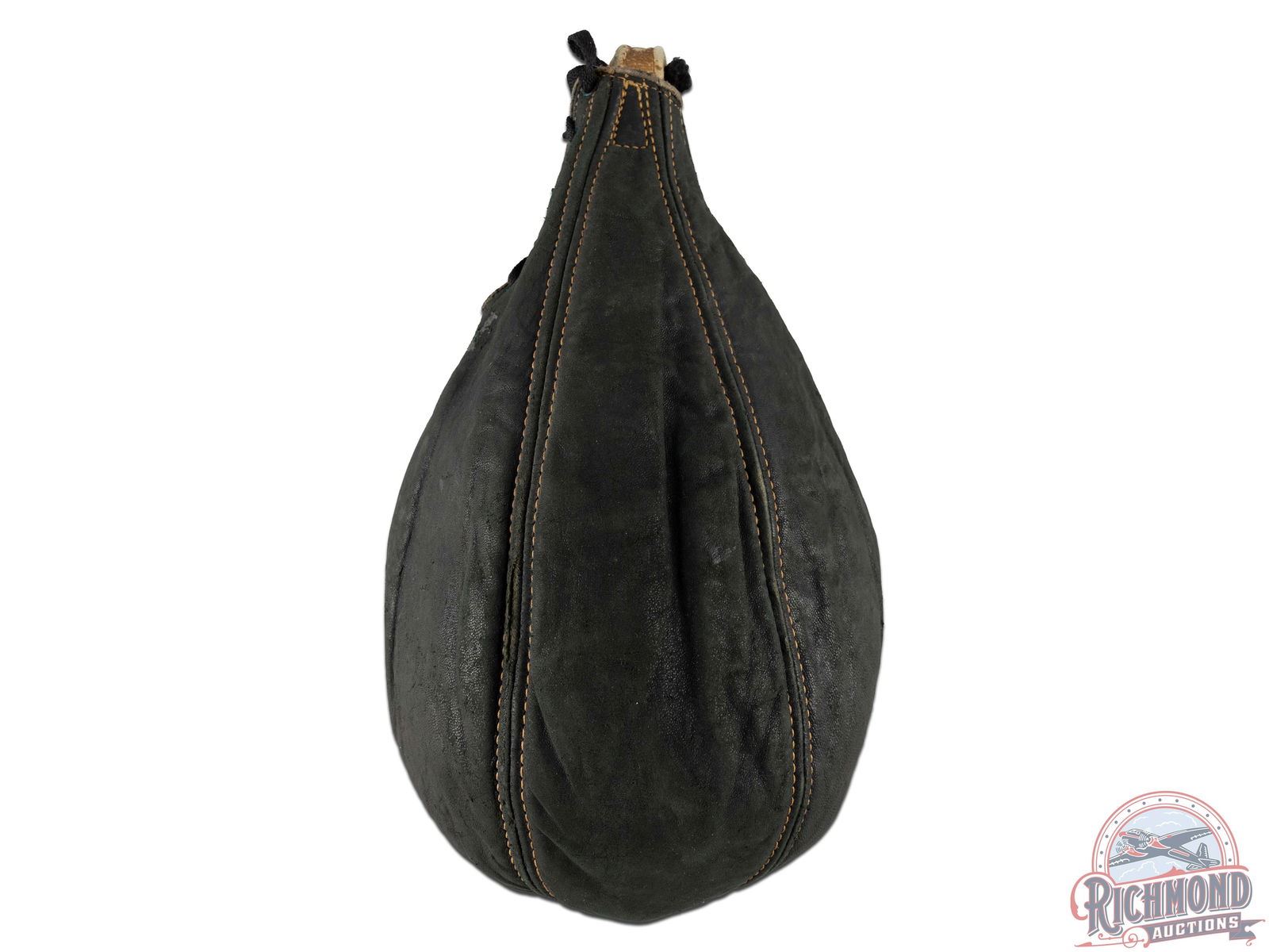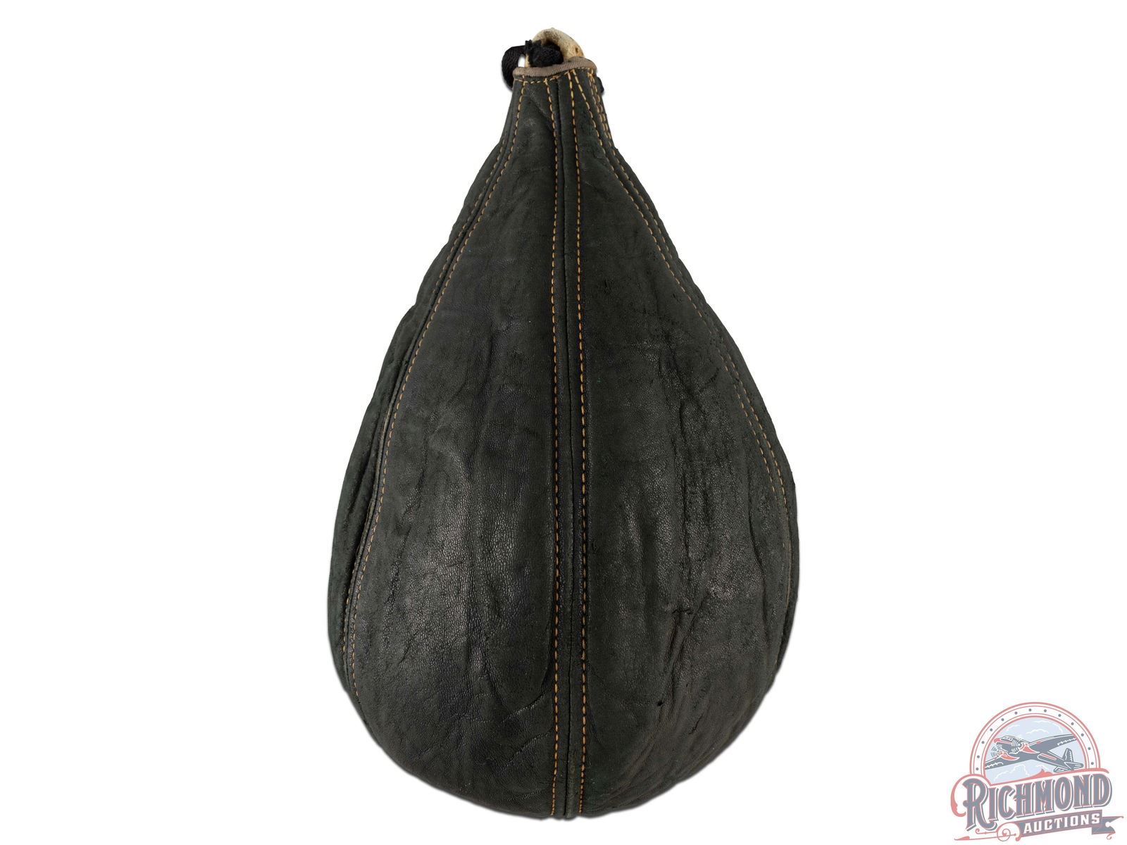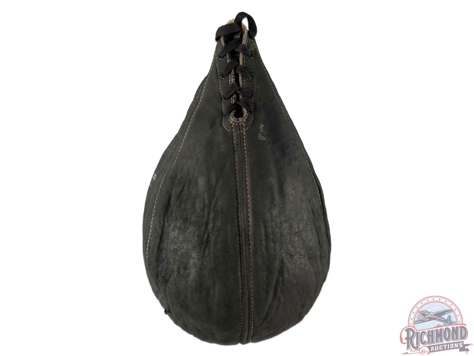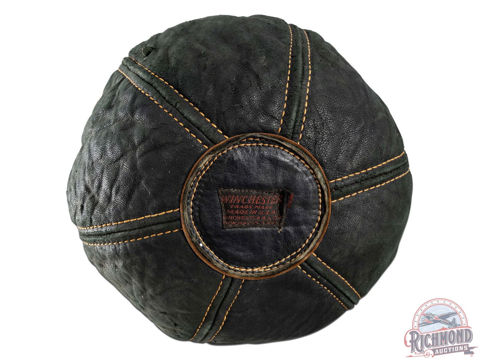 Original Winchester boxing speed bag, constructed of black soft Napa leather with triple sewn seams. Stuffed with an unknown material and appears to have new lacing at top. Retains what appears to be the original top cord for mounting. Overall in very nice condition with general age related wear. Various scuffs including one small 1/8" non-through tear in the bottom of a side panel. Small area of reside beside laces that should clean. Retains the original Winchester sewn label on bottom of bag. Winchester markings are clear and legible. 14" H x 9" W x 9" D.