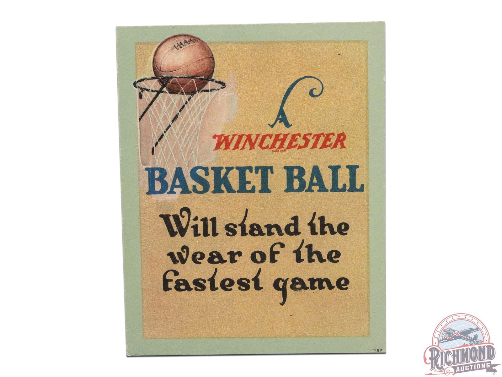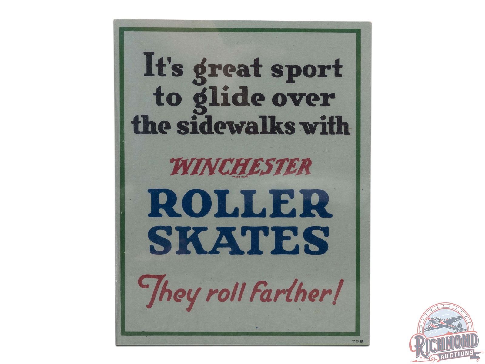 Circa 1920's. Scarce double sided cardboard counter sign has great color. Exhibits general age toning with very minimal corner and edge wear. Display side features a basketball and hoop, marked 75F. Reverse advertises roller skates with slogan "They Roll Farther!" and marked 75B. Overall, in excellent condition. Shrink wrapped to an acrylic panel. 7" H x 5.5" W.