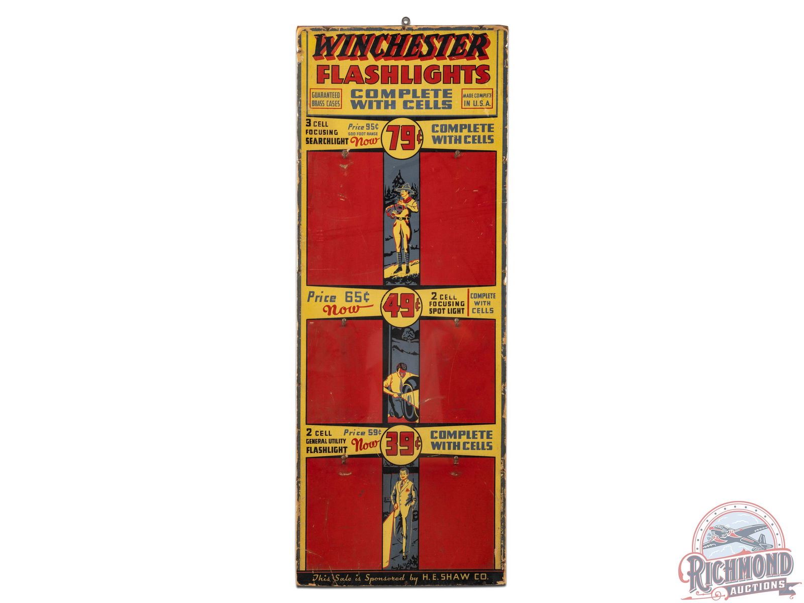 Scarce and early Winchester flashlight display retail sign board with three different flashlight price point; $0.79, $0.49, and $0.39 each. Nice graphics including a Boy Scout/Jr. Rifle Corpsman. Masonite board is mounted to a wood frame with nails and staples. Retains six hooks. Good color overall. Board exhibits with areas of paint loss, edge wear/loss, spots of discoloration and tears. Frame has an eyelet at top center. 47.5" H x 18" W x 1" D.