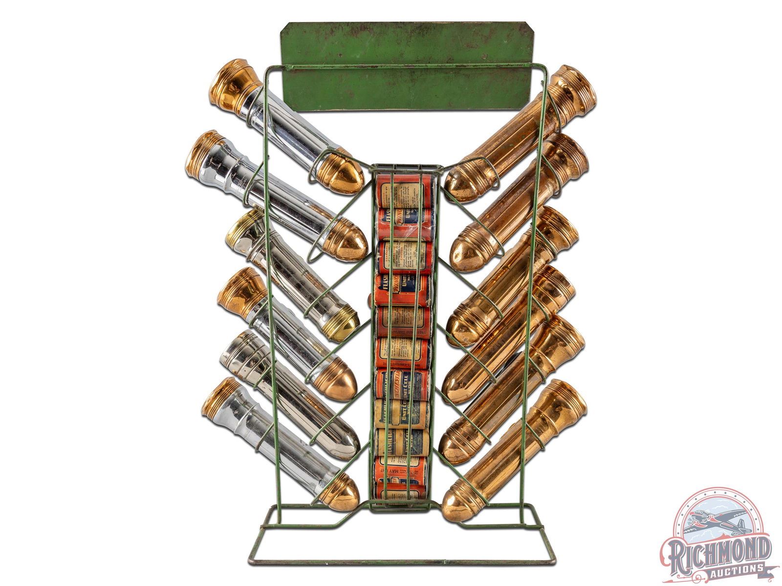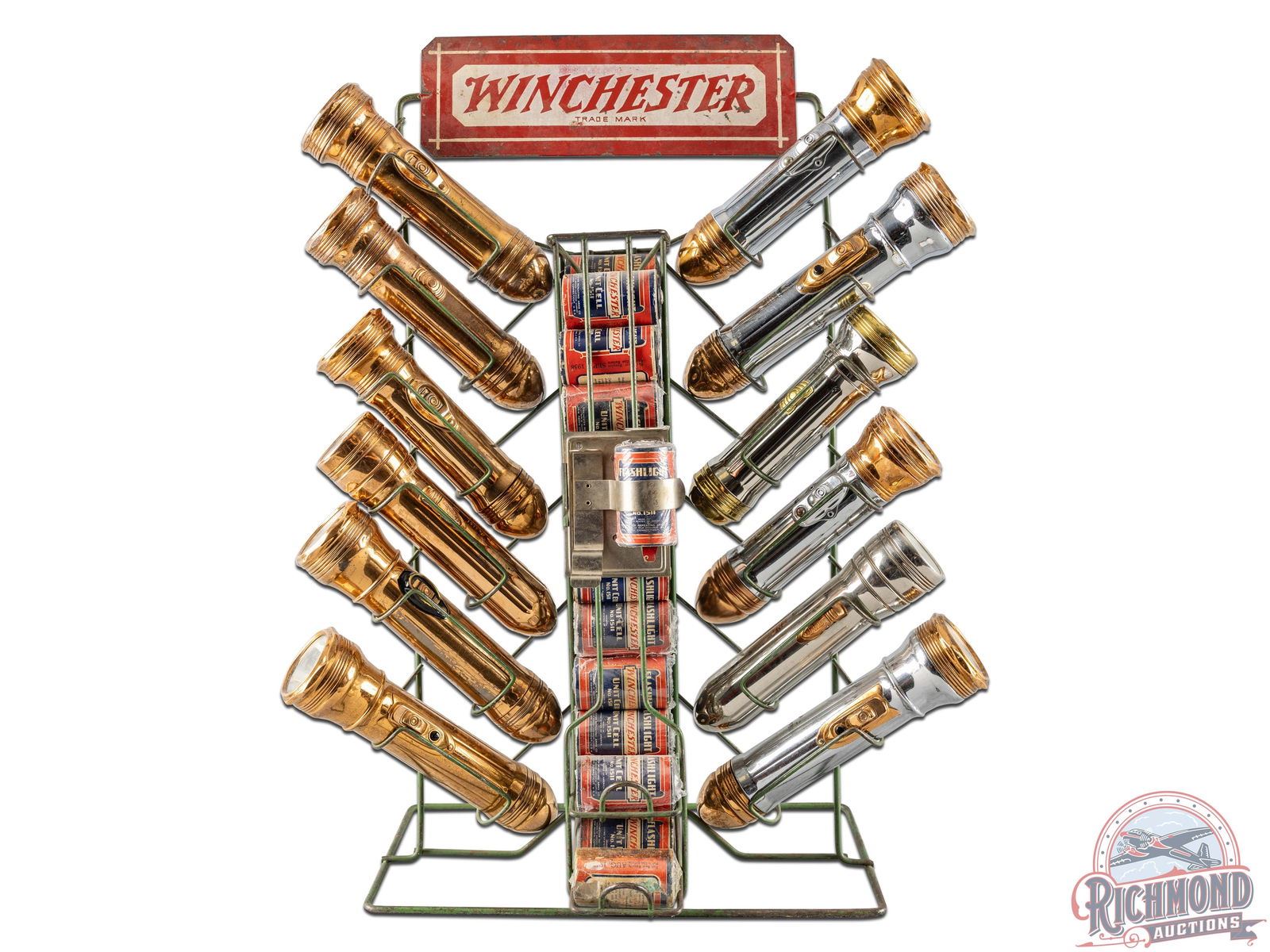 Original wire flashlight countertop display with built in, two row battery cell dispenser. Exhibits general wear, paint loss and some scratches. Includes 12 various Winchester flashlights and 24 Model No. 1151 Battery Cells. Flashlights show typical use/wear and are in unknown working condition. 21" H x 16.5" W x 7" D.