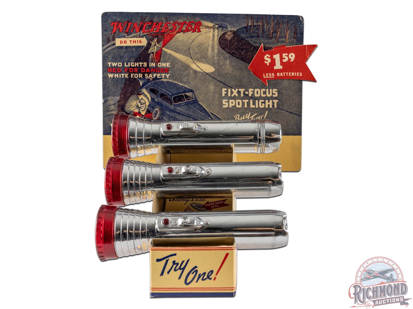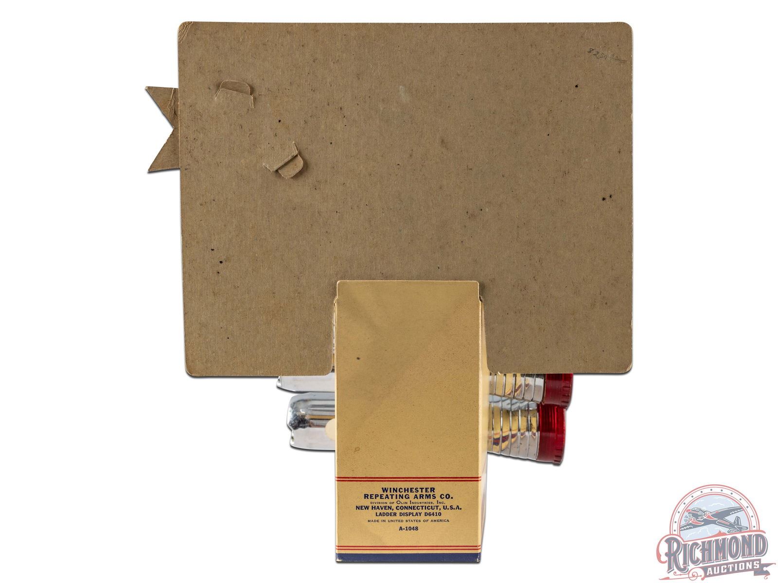 Very nice early countertop display with graphic cardboard topper and three Winchester flashlights. Graphic topper has great color. $1.59 arrow has a bend at one point but is intact. Some general wear and coloring to the cardboard. Includes three used Winchester flashlights that exhibit some wear and general use. One flashlight lens is cracked. Working condition unknown. Marked Winchester Repeating Arms Co., Ladder Display D6410, A-1048 on reverse. 11.25" H x 10" W x 6" D.