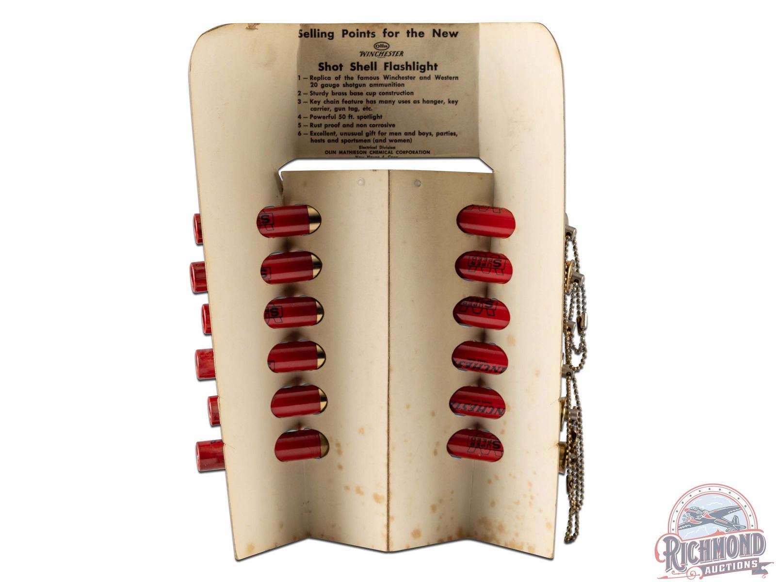 Olin Winchester folding cardboard countertop flashlight display with 12 shotshell keychain flashlights. Good color and graphics. All flashlights appear in excellent condition but working status unknown. 69 cents each. Marked Electrical Division Olin Mathieson Chemical Corp. New Haven Connecticut. 10.75" H x 8" W x 3" D.