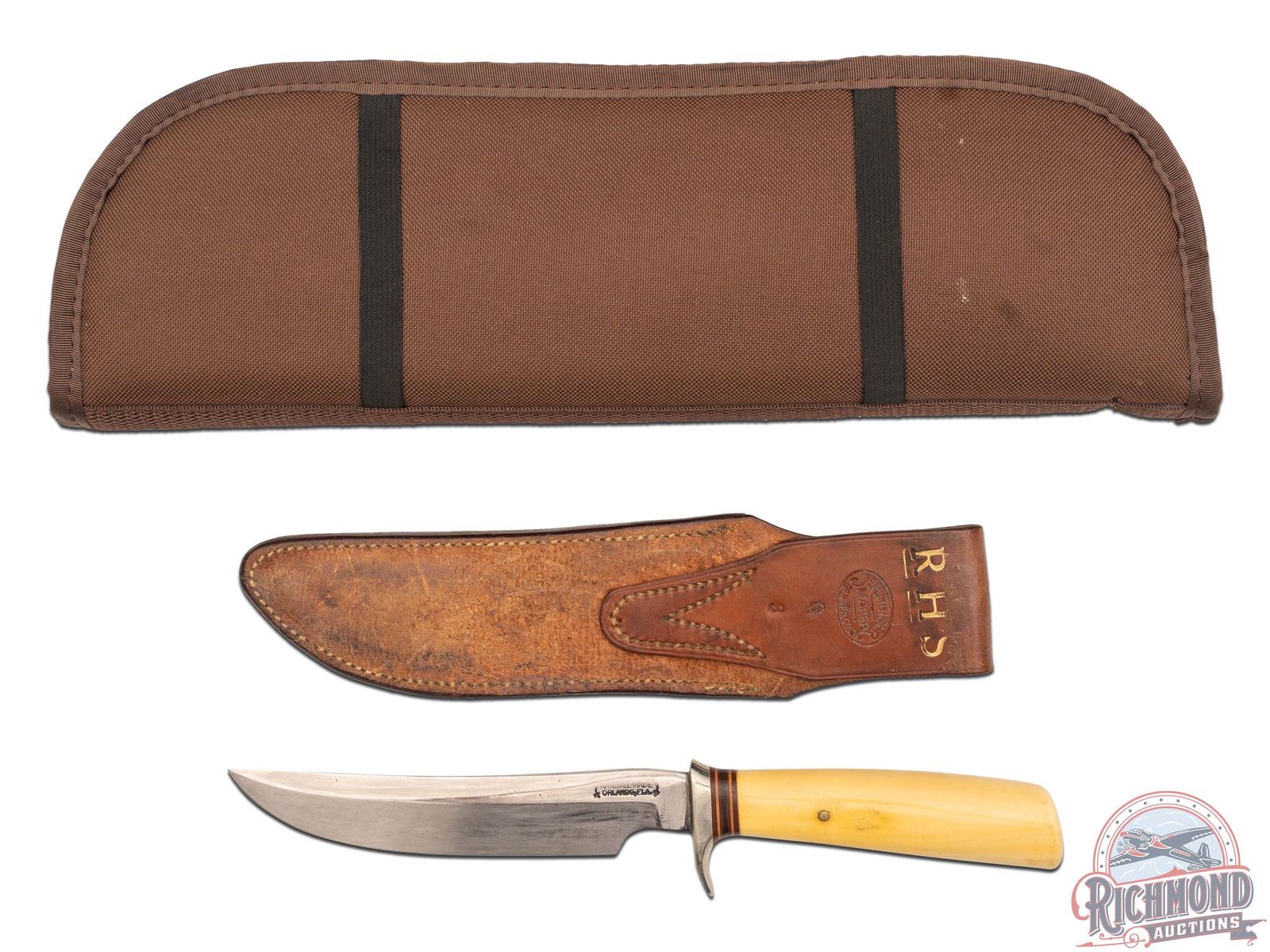 This vintage RMK features a 6" blade with the original carbon steel finish. Upgraded factory bone handle with red, white and black separations at the top and single brass rivet. Nickel single sided hilt. 11" overall length. Includes a zippered storage case and a model A factory leather sheath with logo snaps and hone pocket. Honing block included.