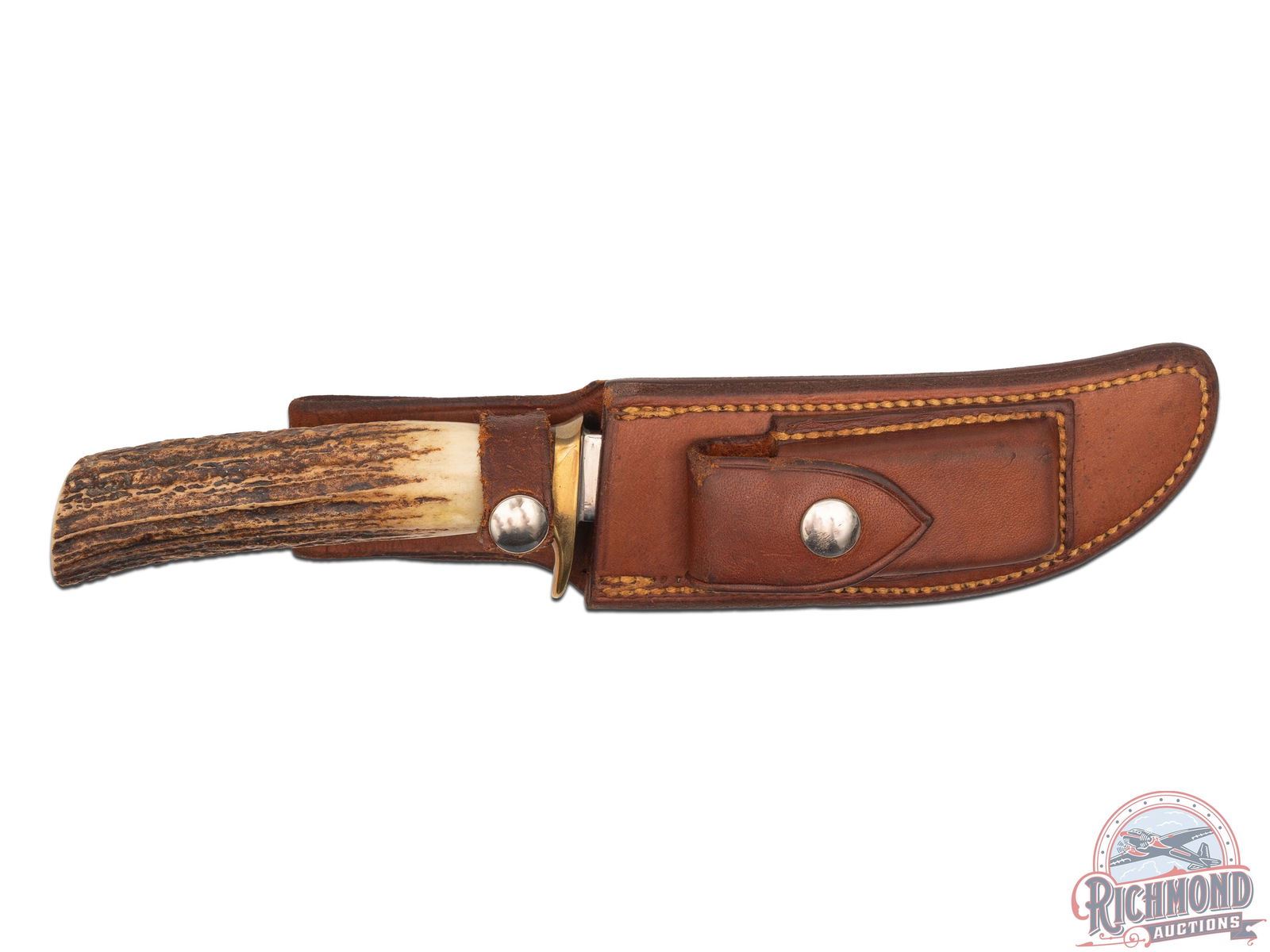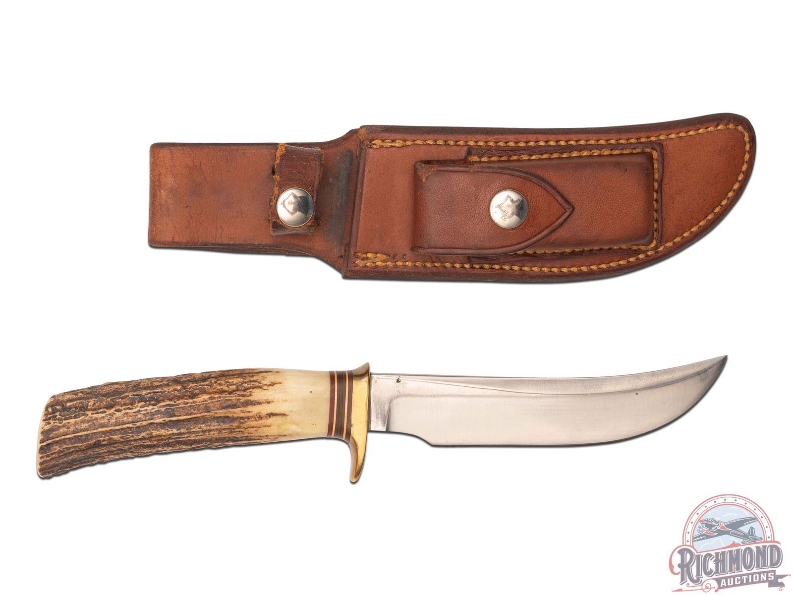 The Randall Model 4 has been extensively used by guides, trappers and sportsman. Features a 5" curved blade perfect for skinning. Stag handle, single brass hilt with red, white and black separations. Includes factory Model A leather sheath with hone pocket. Honing block included.