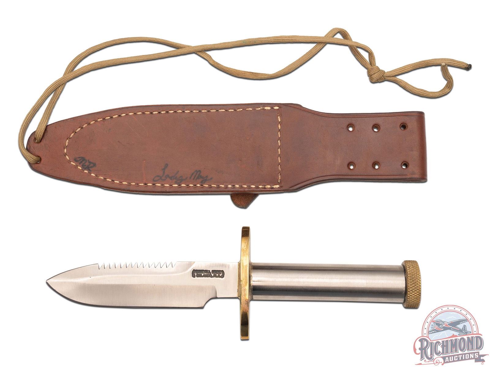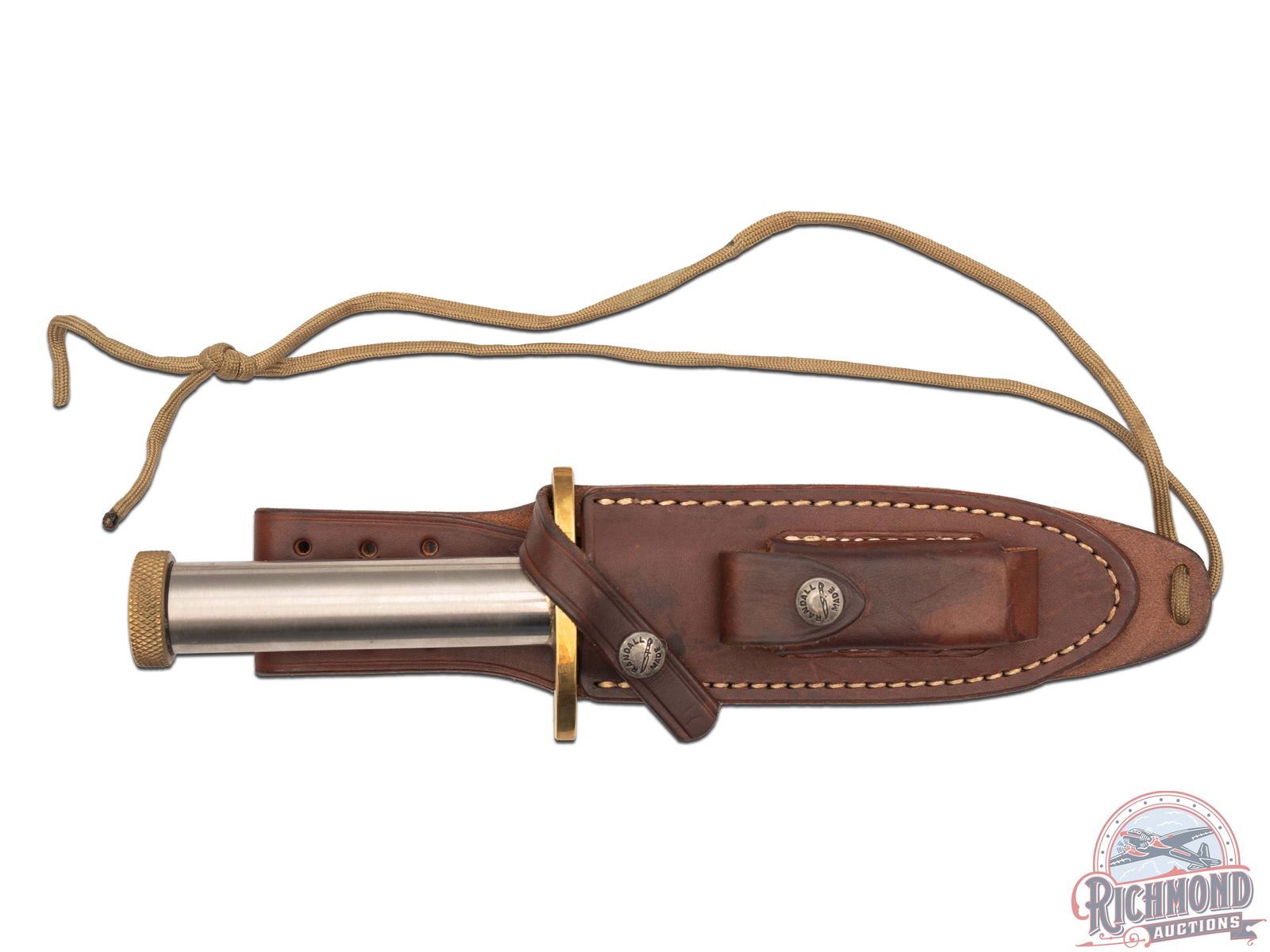 This RMK is made for wilderness survival. Features a 5-1/2" blade with top sawtooth edge. 4-3/4" stainless steel tubular handle in 1" diameter for storage (matches and cotton boll included). Silver soldered to 1/4" oblong brass hilt. Fitted with removable and threaded brass butt cap and waterproof O-ring. Flared holes on both sides of the hilt. Includes factory Model C leather sheath with paracord and hone pocket. Honing block included.