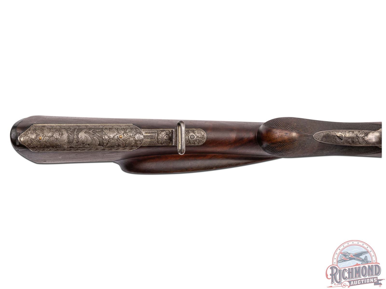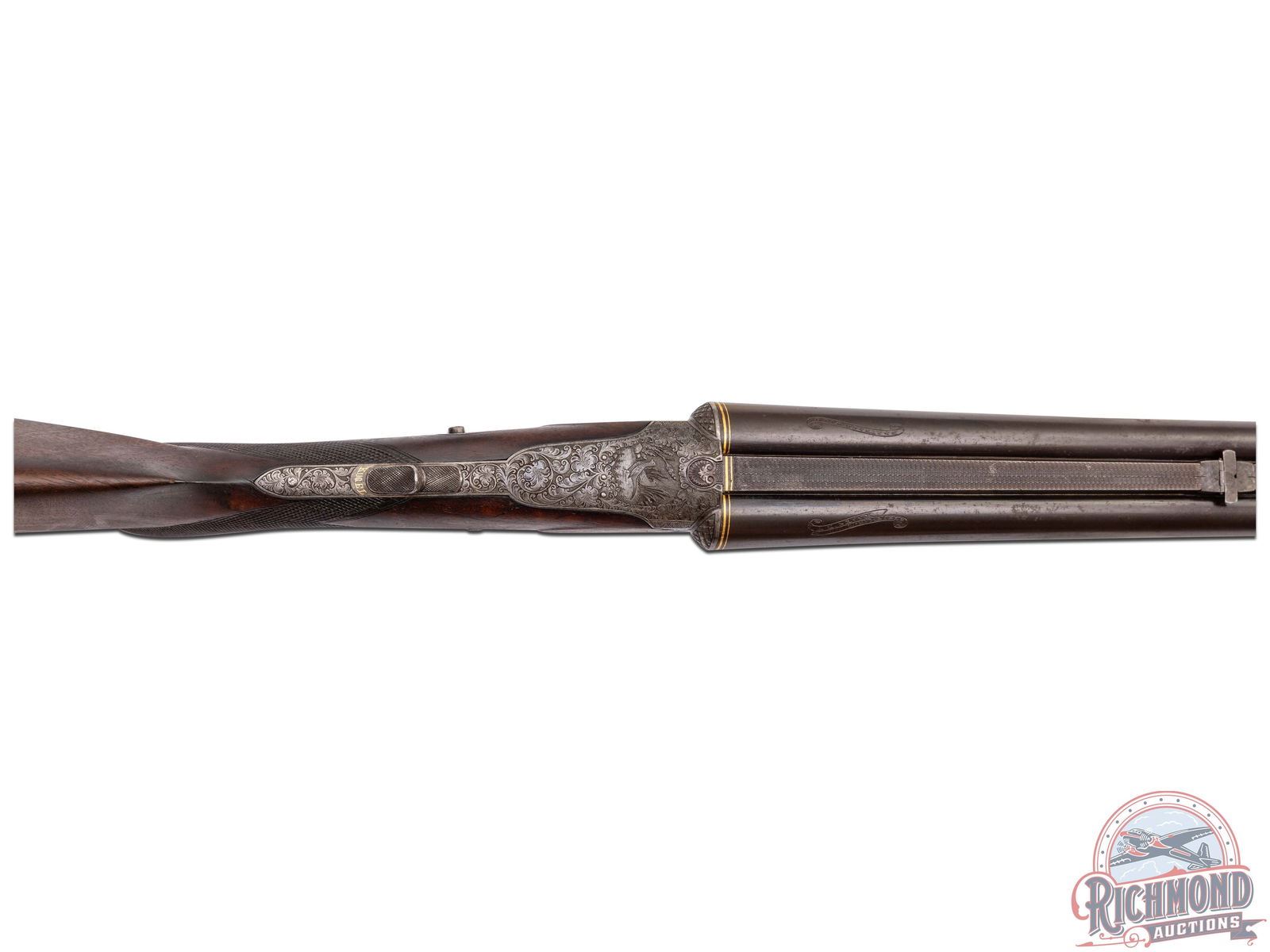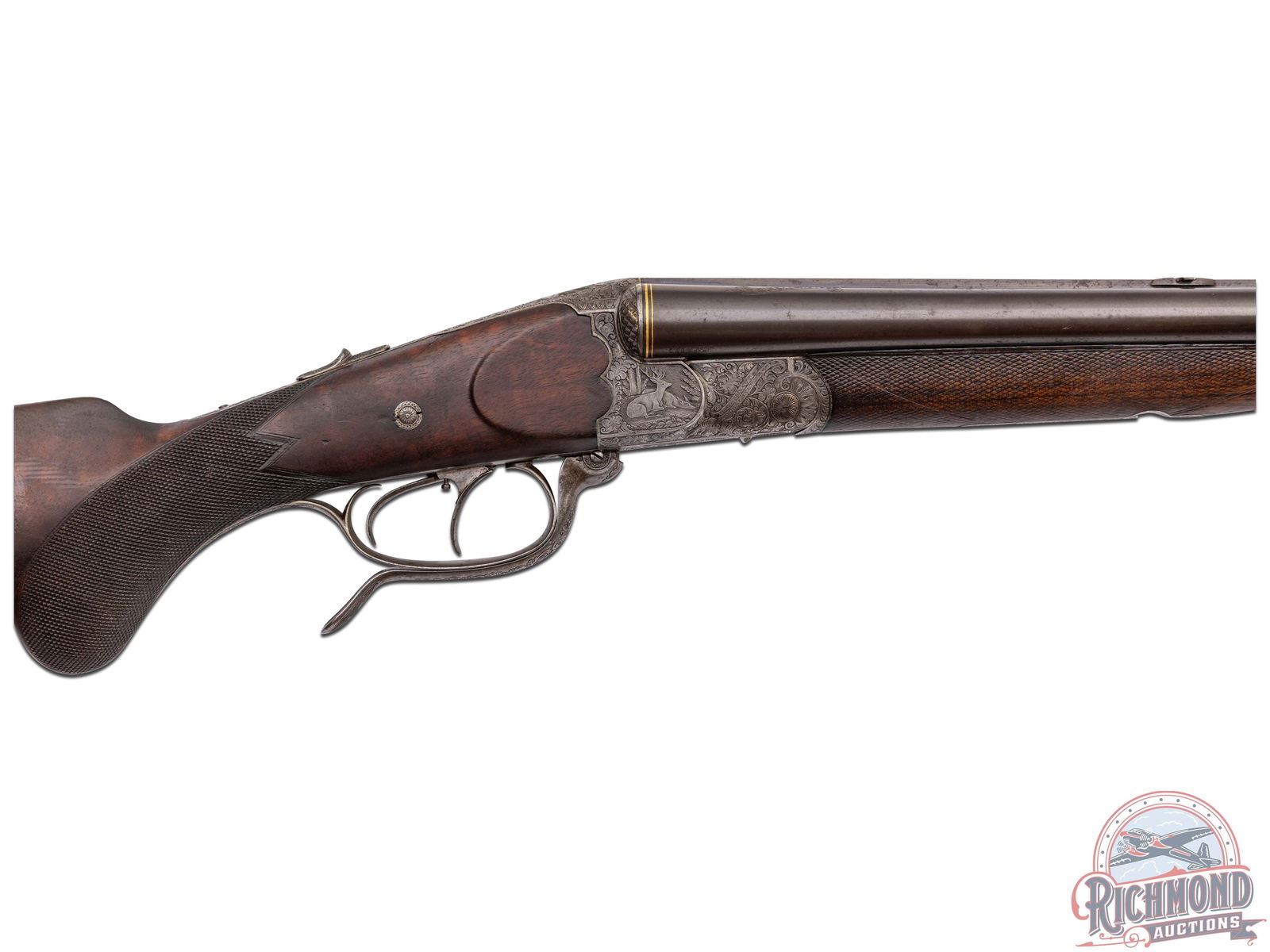 Overall fair with barrels turning plum. Action has turned a dull silver with sharp engraving. Stock varnish has dulled with dings and usage marks and semi-sharp checkering. Good bores with some mechanical issues and safety does not function.