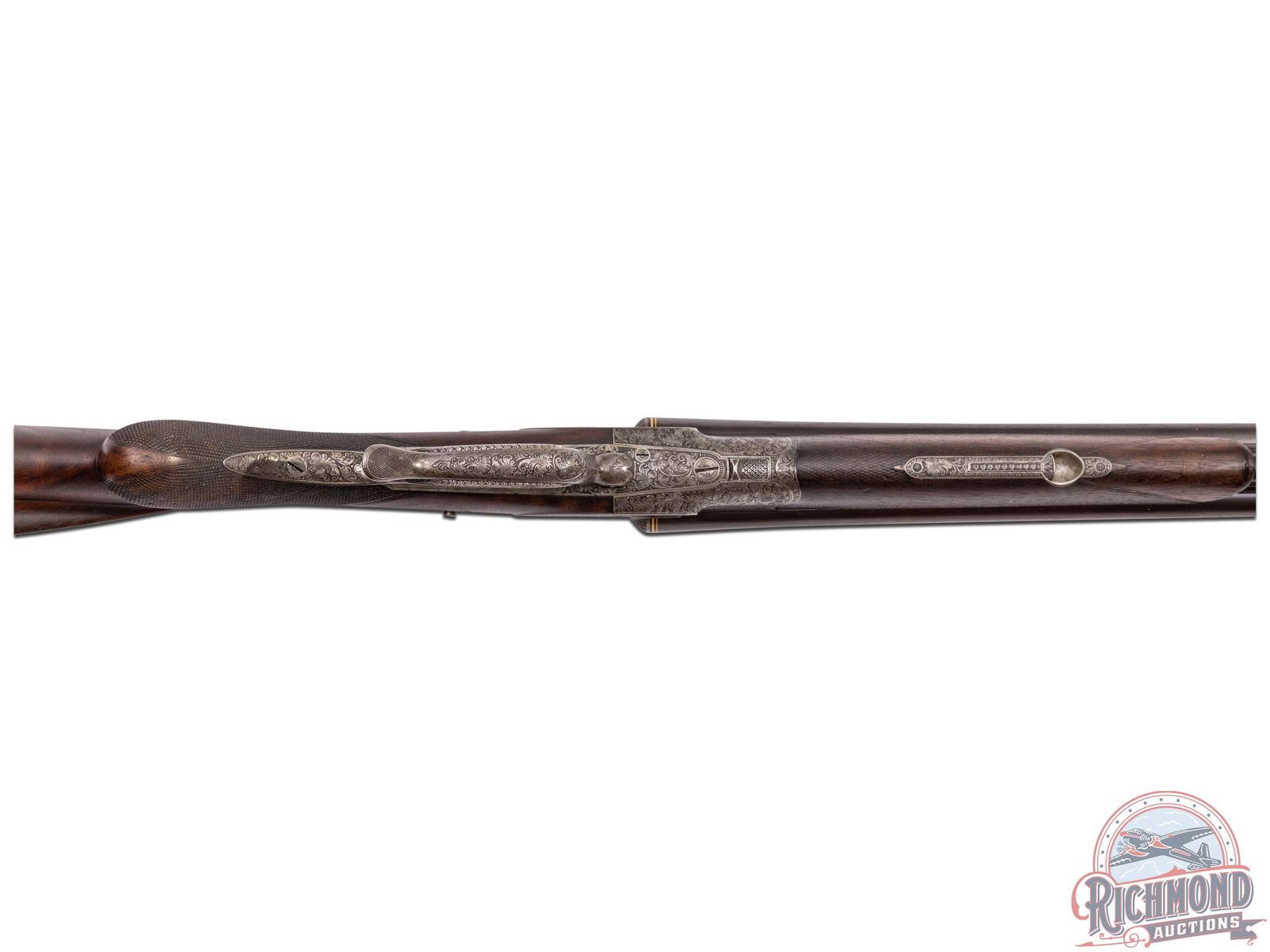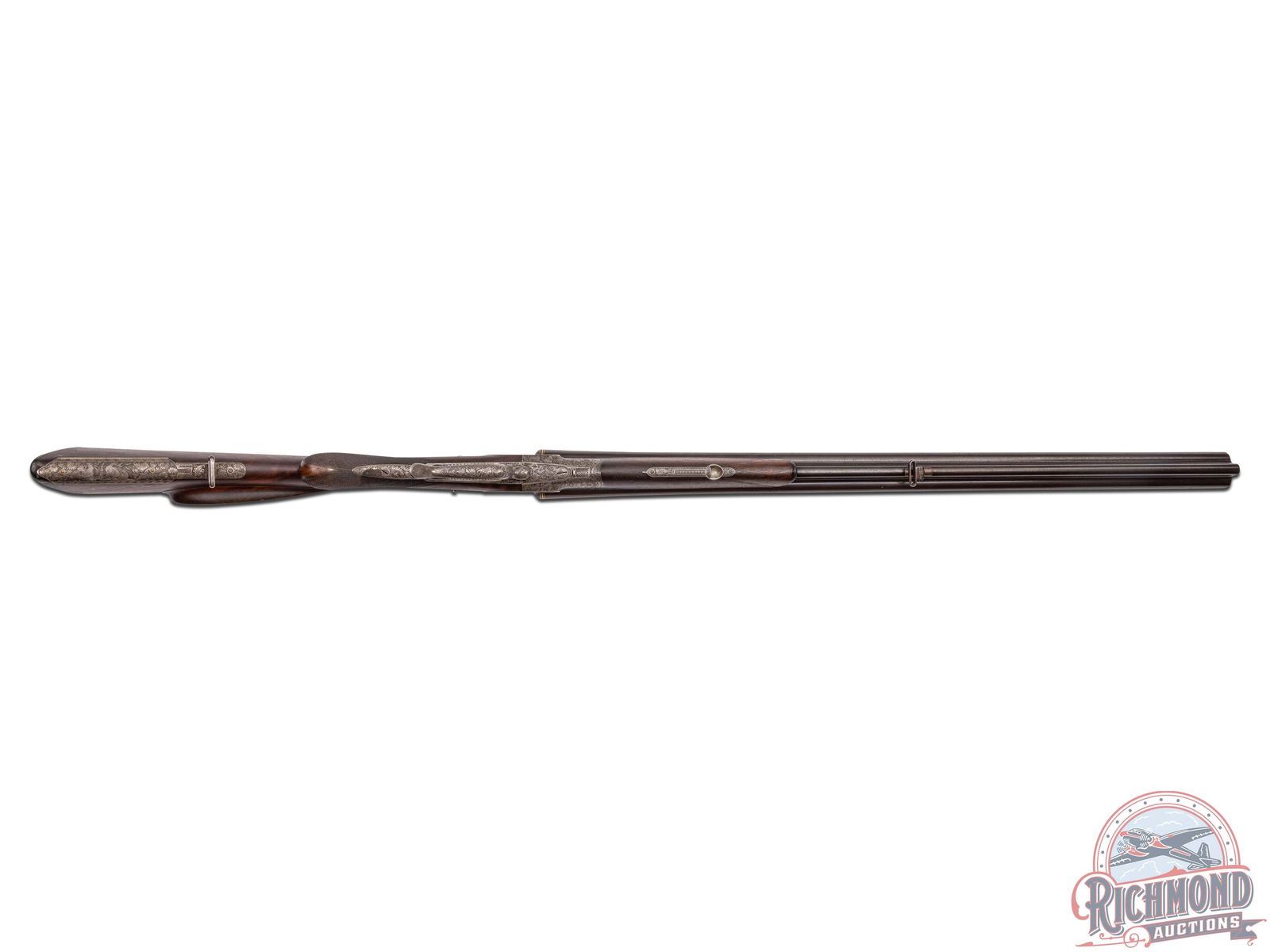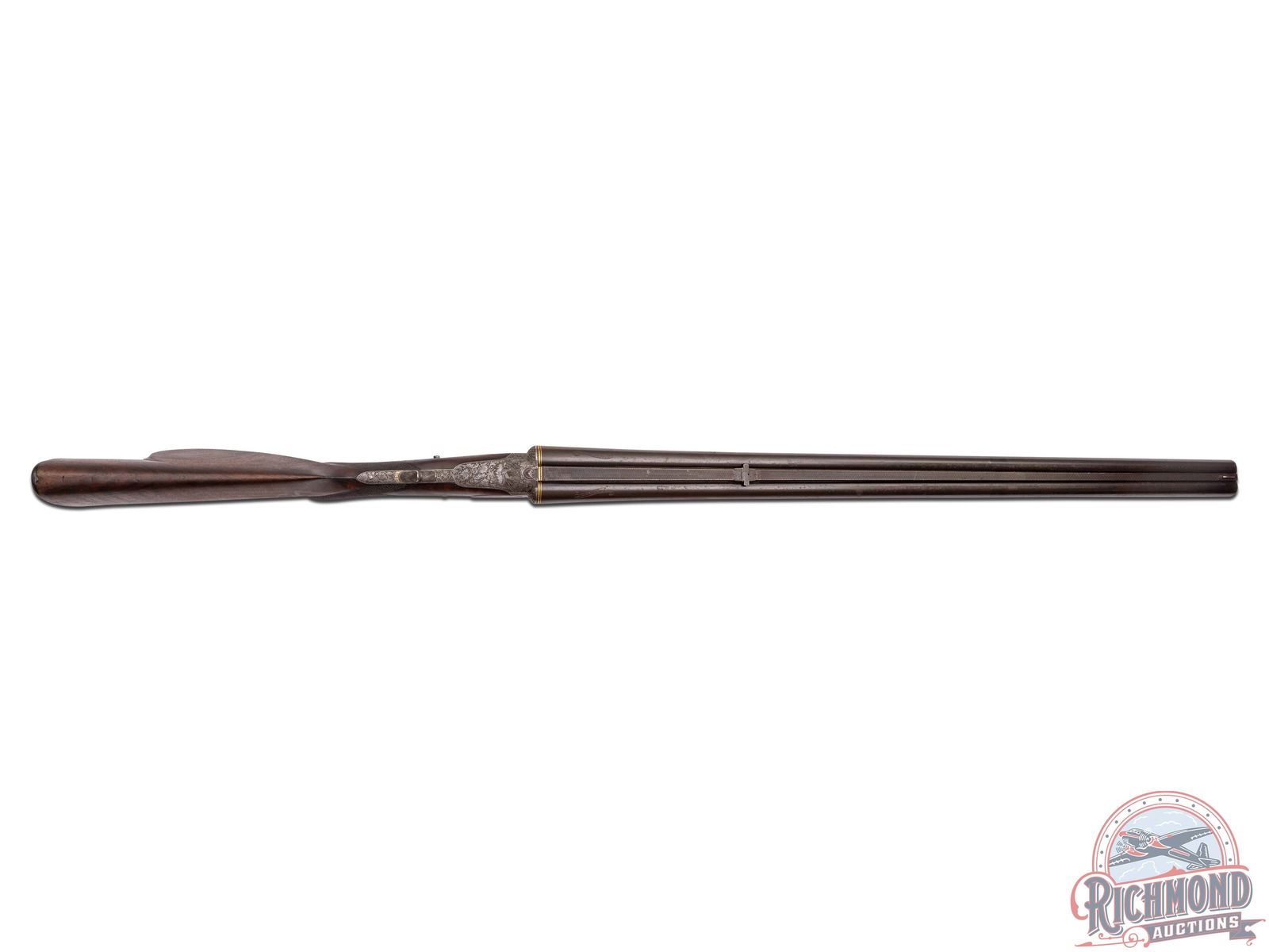 Overall fair with barrels turning plum. Action has turned a dull silver with sharp engraving. Stock varnish has dulled with dings and usage marks and semi-sharp checkering. Good bores with some mechanical issues and safety does not function.