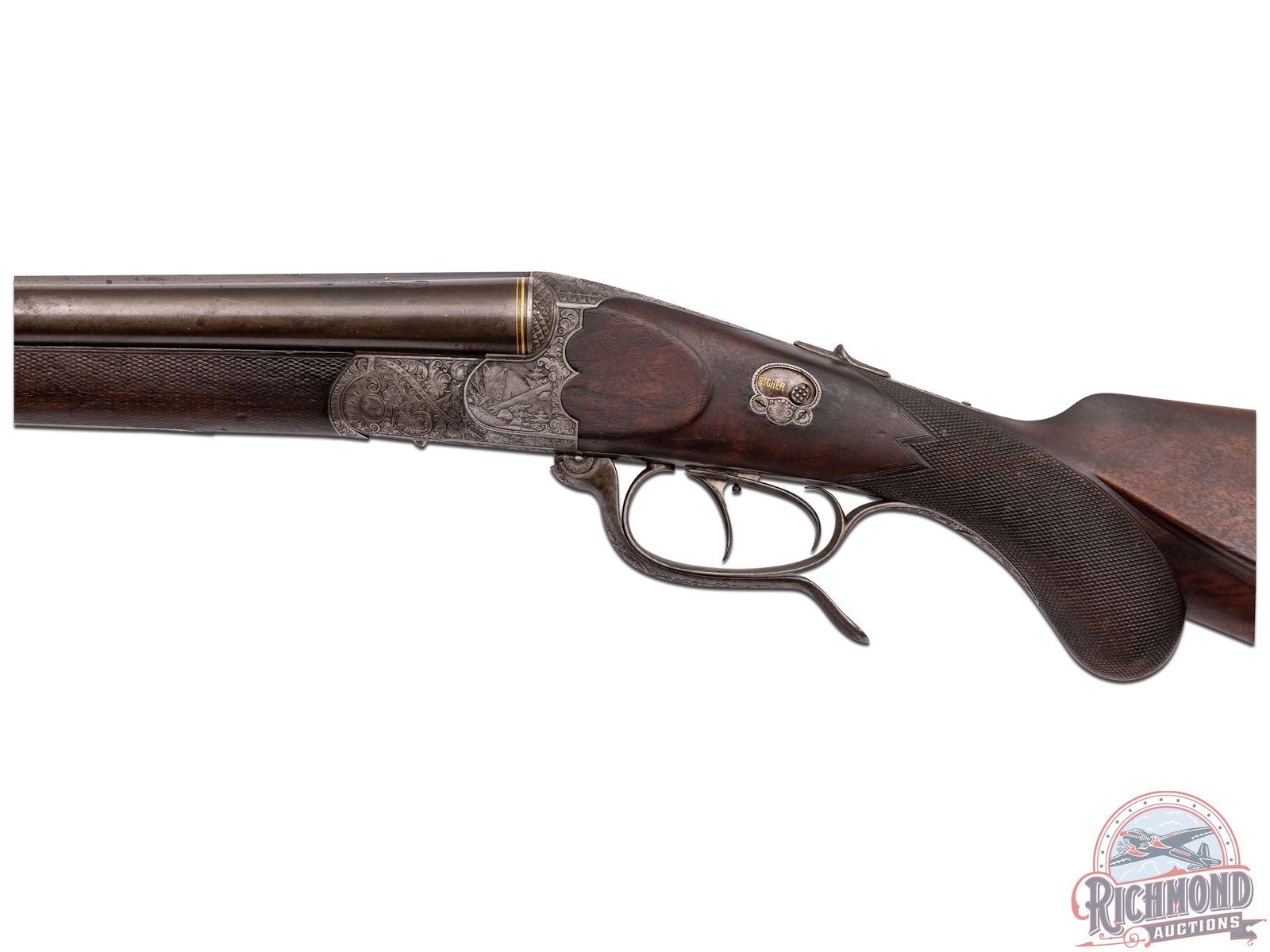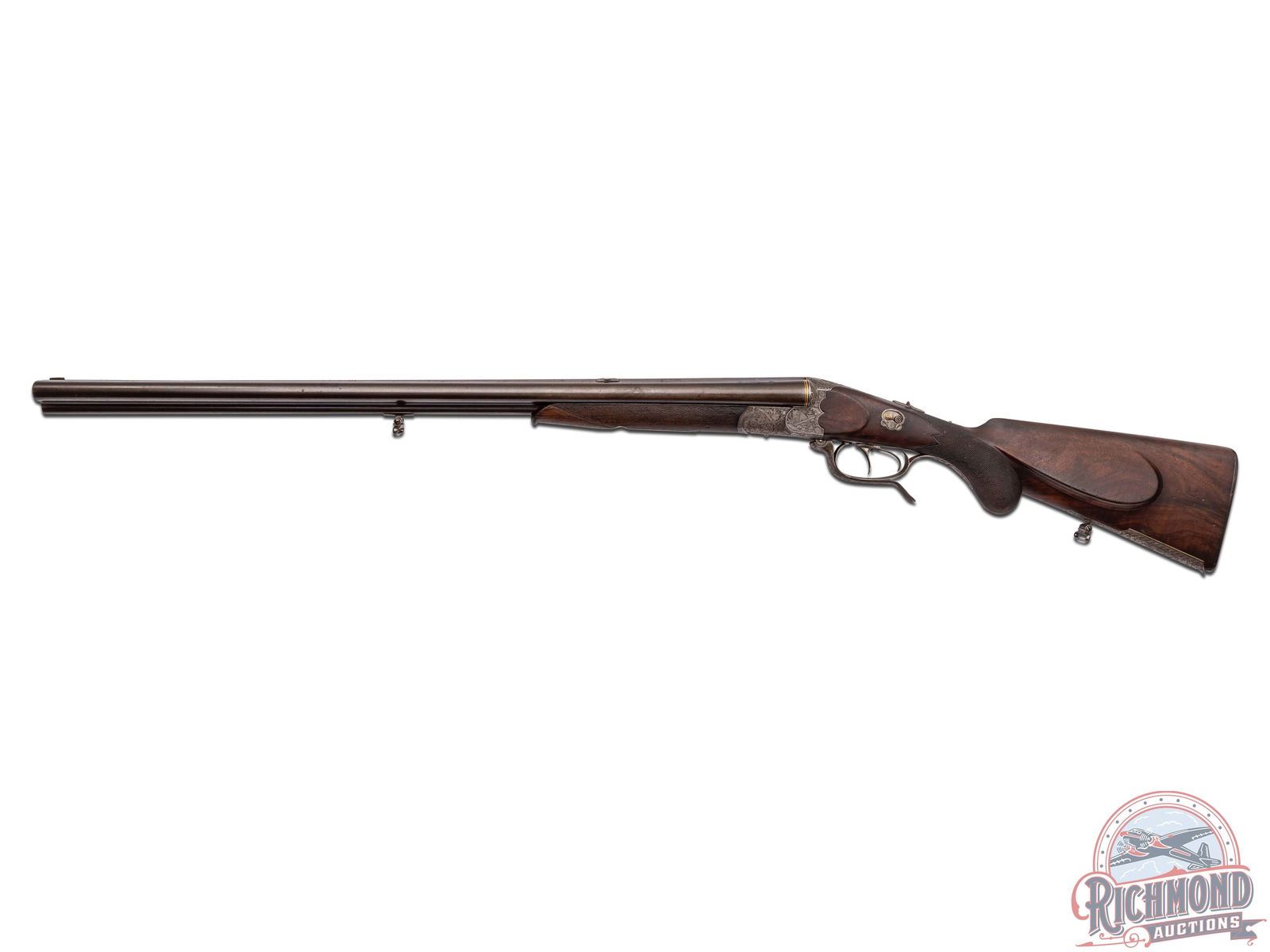 Made in Braunscheig, Germany by G.L. Rasch in 1916. 26-3/4" blued fluid steel barrels with maker markings, matted rib, gold breech rings, rifle sights, and extractors in 16 gauge over 8x72R rifle. Barrels have 2-9/16" chambers and Modified cylinder chokes. Coin finished maker marked underlever action with game scene engraving, Greener safety, top tang barrel selector, and underlever opener. Action has bore scene on left and hirsch scene on right. Walnut checkered round knob pistol grip stock with right-handed cheekpiece, turkey engraved bullet trap and horn butt plate. Matching walnut checkered splinter forearm with latch release. LOP: 13-1/4". DAC: 1-1/2". DAH: 2-1/4". CALIBER: 16/8x72R. S/N: 3214. FFL STATUS: Curio & Relic.