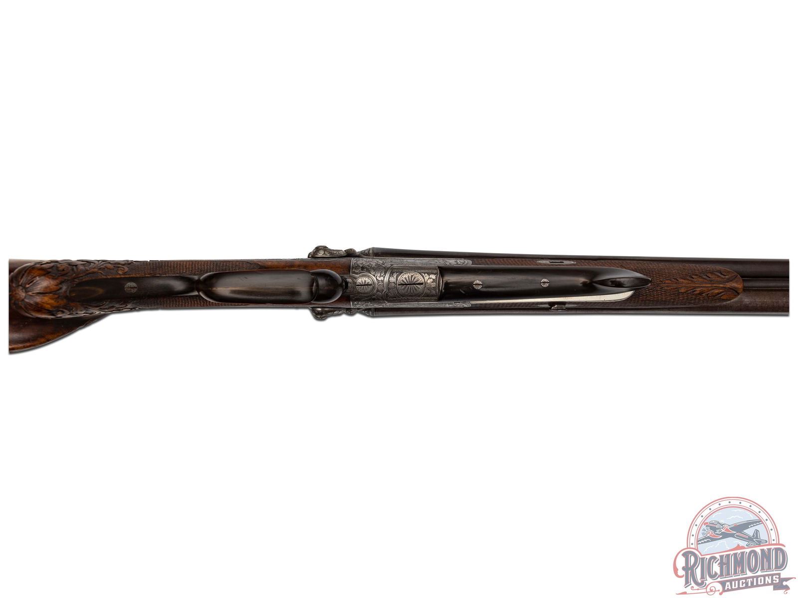 Manufactured circa 1890 by Anton Korinski in Erlangen, Germany. 27" SxS Damascus 16 gauge shotgun barrel beside 11 m/m steel rifle barrel (should be chamber cast to verify) with matted rib, marked "A. Korinski Erlangen", rifle sights and extractors. Underlever gray finished game scene engraved frame and back action locks with exposed hammers featuring running deer, wild boar and fox scenes. Action has horn opening lever and horn trigger guard. Two triggers with front being a set trigger. Dark figured European walnut stock with carved floral round knob pistol grip fading into wrist checkering. Stock has Bavarian style over-the-comb cheekpiece with steel bullet trap. Matching splinter checkered and carved forearm held with wedge. CALIBER: 16 & 11MM. S/N: 6742. FFL STATUS: Antique.