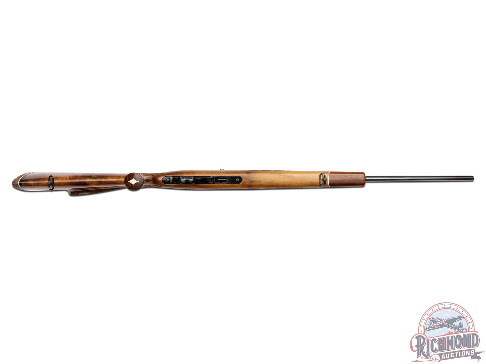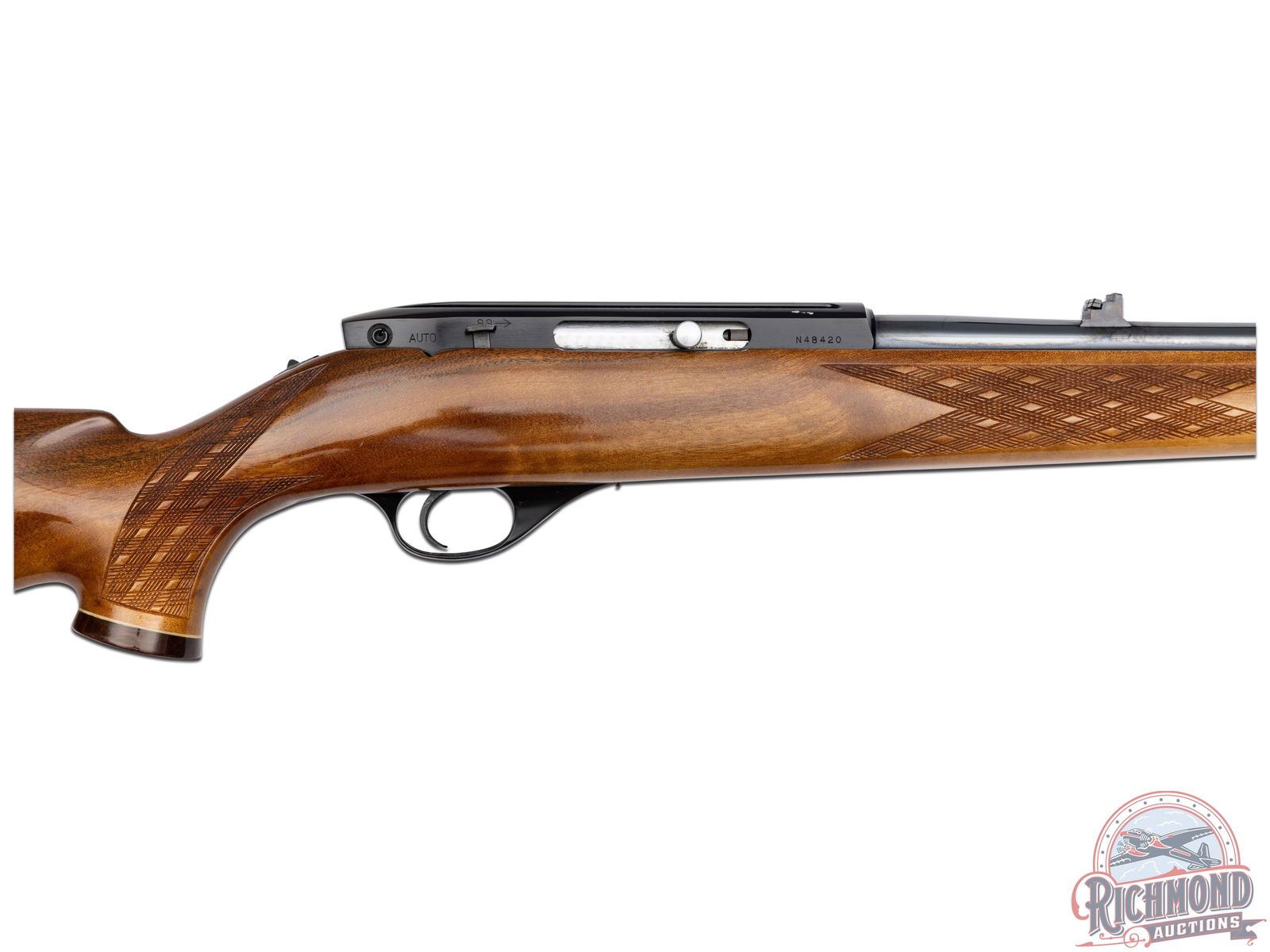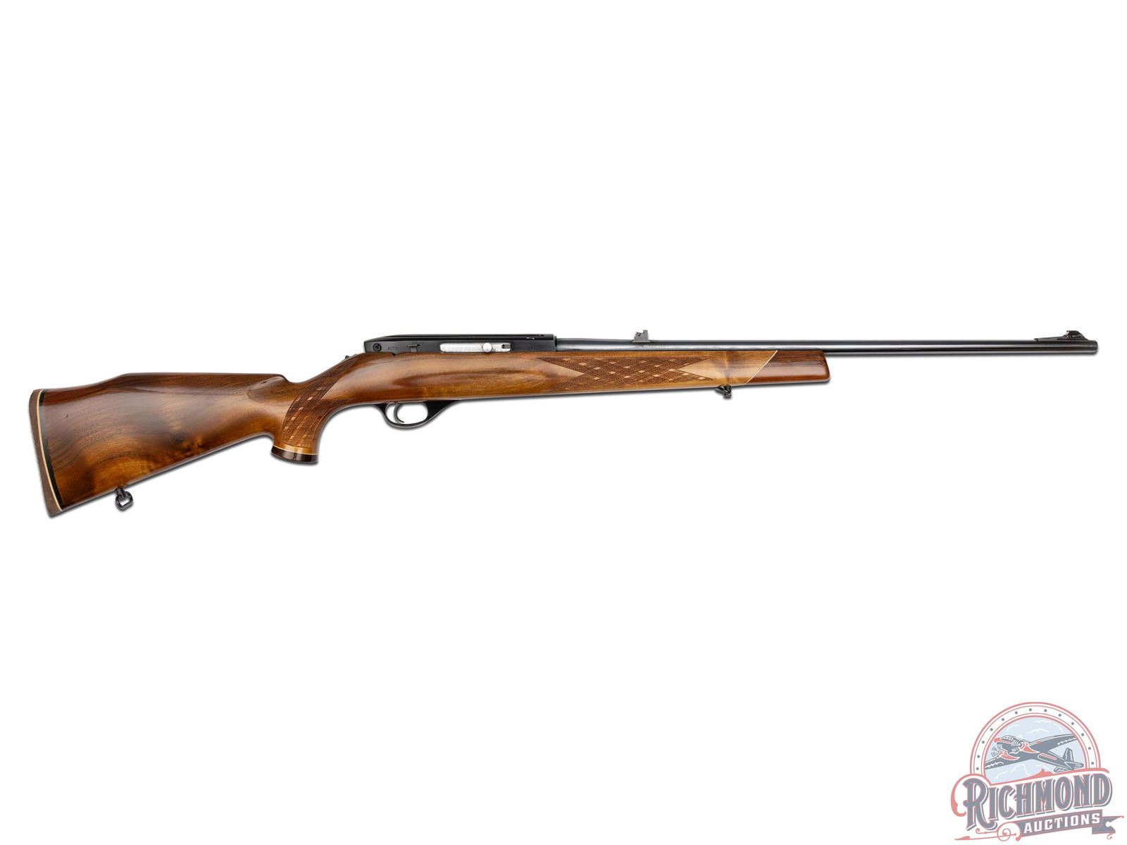Manufactured circa 1975 by Weatherby in Japan. Features a 24" blued tapered barrel with 3-range leaf flip-up rear notch and front blade with brass bead sight. Detachable magazine feds a semi-automatic action with half jeweled bolt. Blued receiver with dovetail groove. Tang mounted manual thumb safety and blued synthetic trigger guard. High gloss walnut wood stock with skip-line checkering on pistol grip and forearm. Right side cheekpiece. White lined Rosewood tip and pistol grip cap with white diamond inlay. Fitted with a black and white lined factory brown recoil pad and equipped with sling swivels. Includes a Bushnell 4 Power Scopechief Twenty-two scope and factory paperwork in the original factory box. LOP: 13-1/2". CALIBER: 22 LR. S/N: N48420. FFL STATUS: Modern.