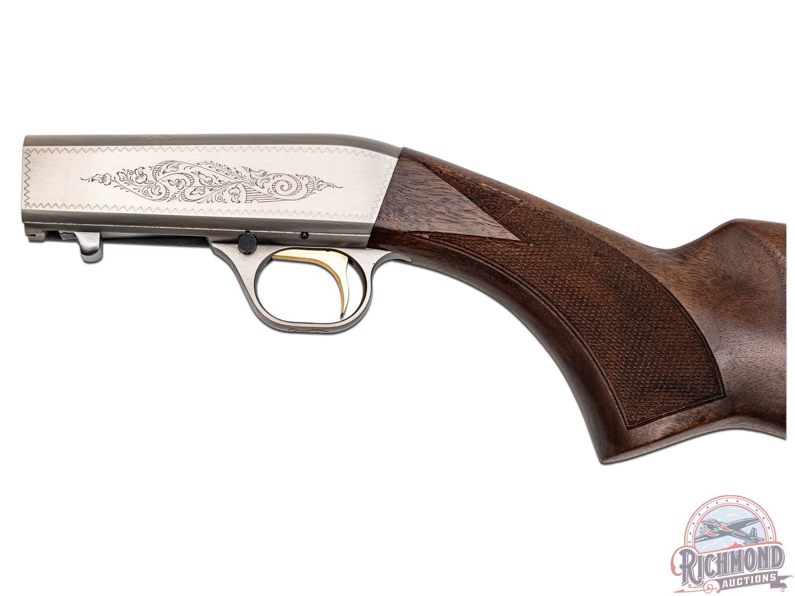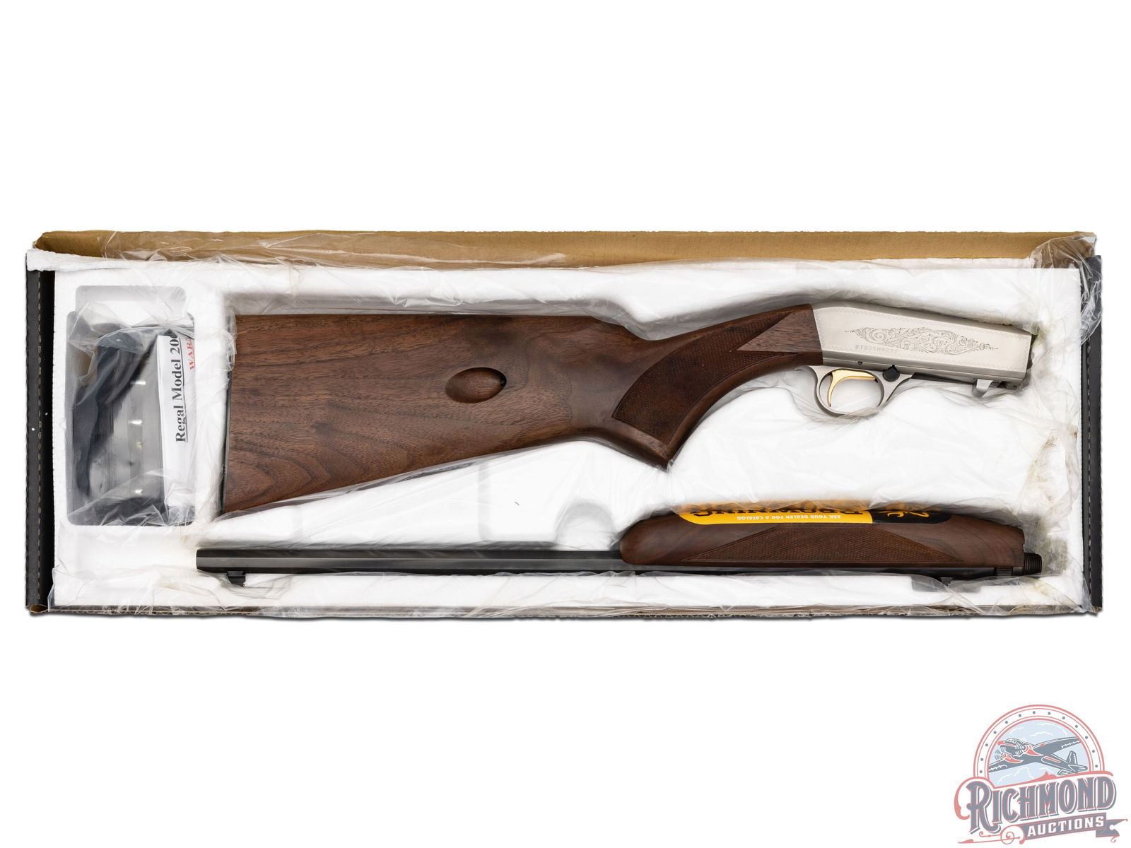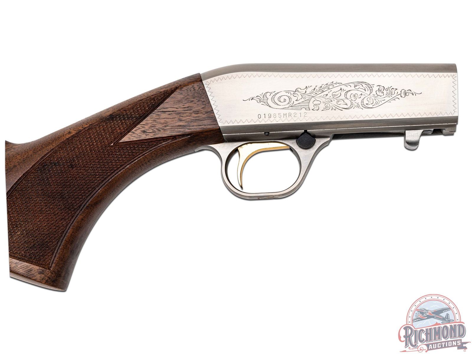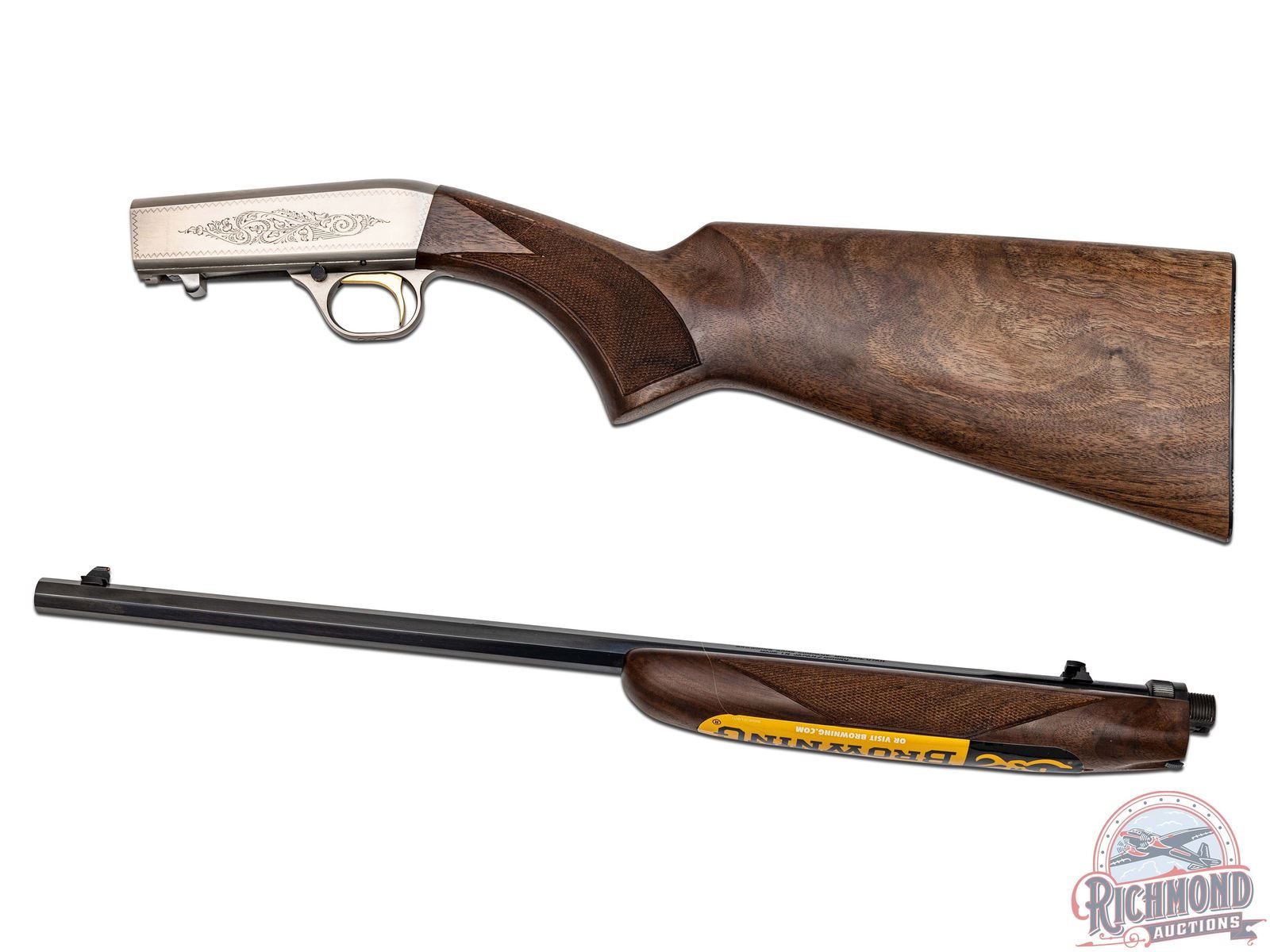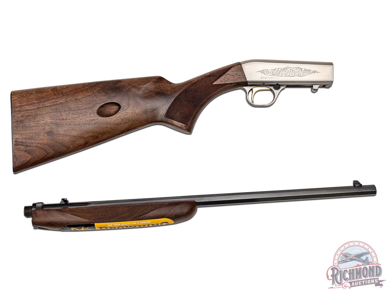 Manufactured in 2007. Blued octagon 19-3/8" steel barrel with hunting sights and factory drilled for a scope. Grayed takedown floral engraved receiver. gold-plated trigger with push button safety and tubular magazine. Walnut hand rubbed satin finished checkered stock with blued steel serrated butt plate. Includes factory box and paperwork. CALIBER: 22 LONG. S/N: 01985MR212. FFL STATUS: Modern.