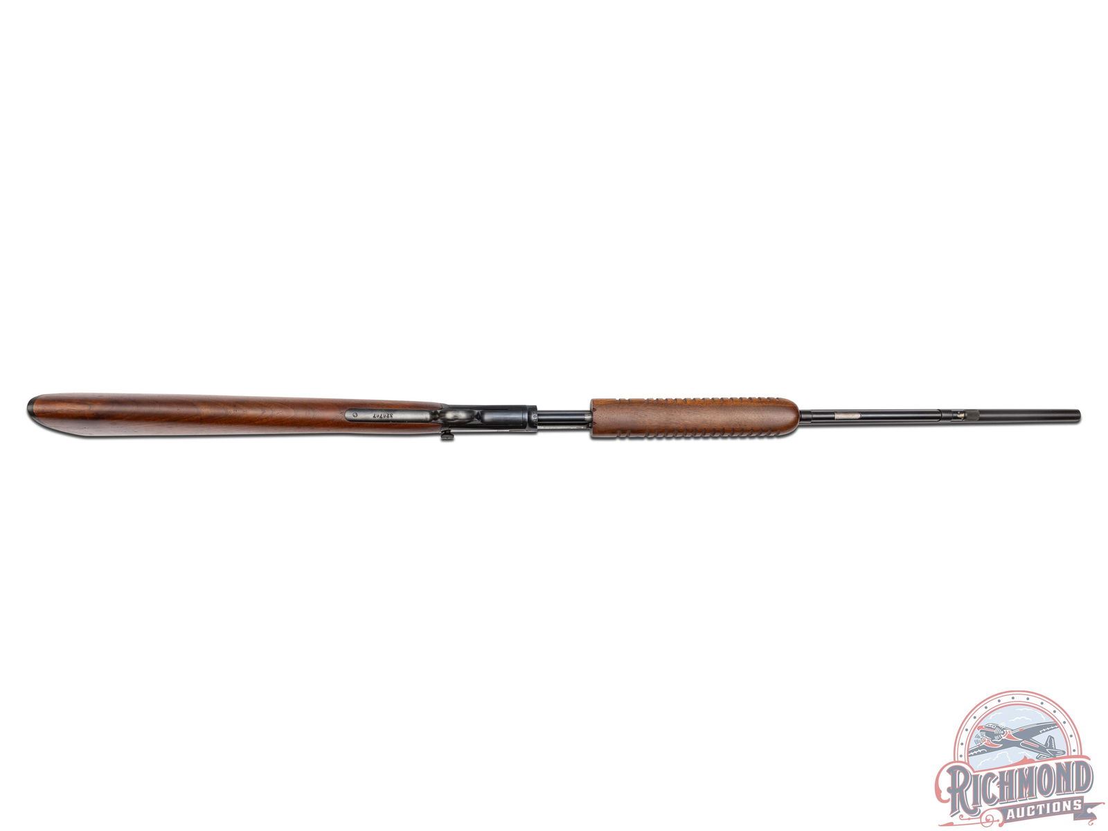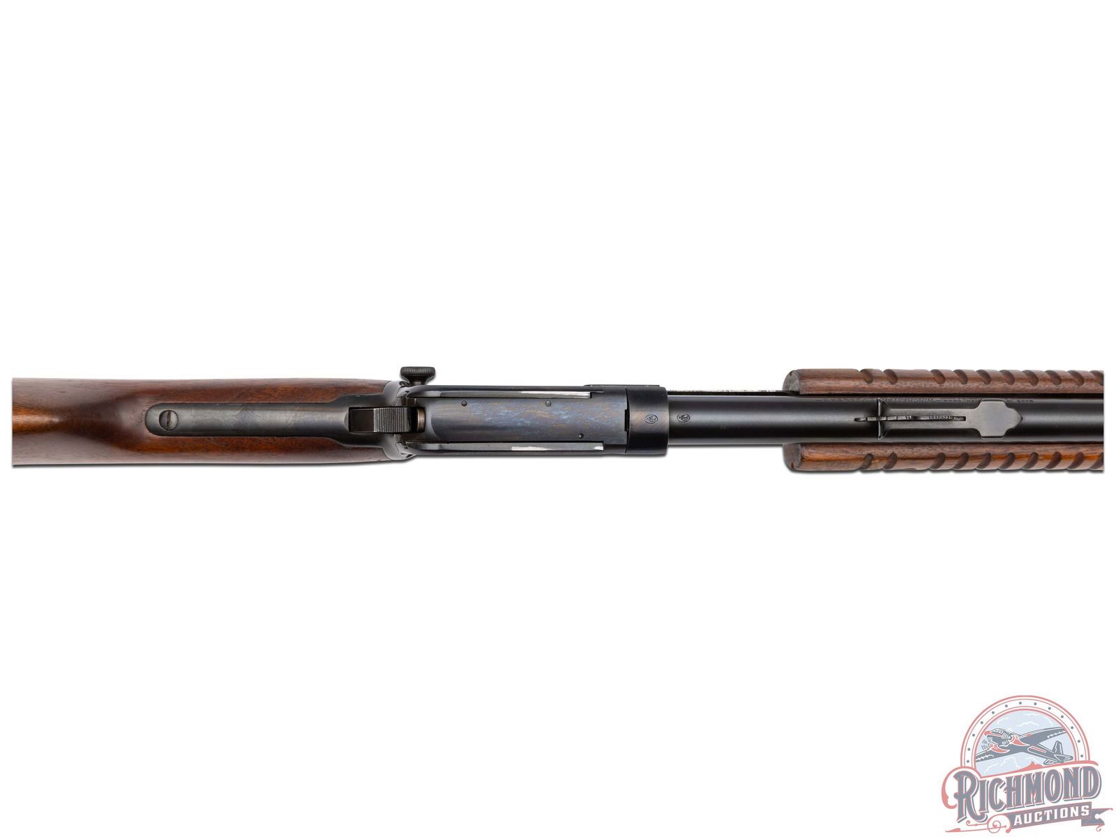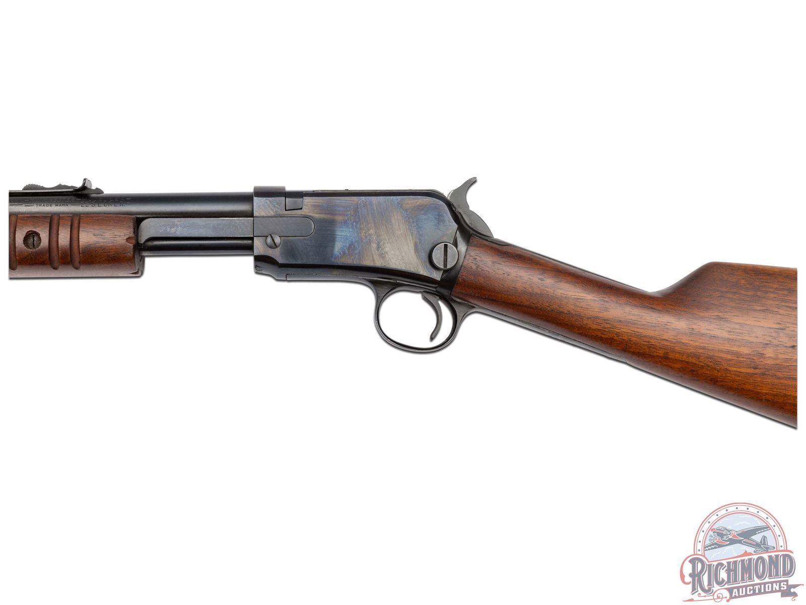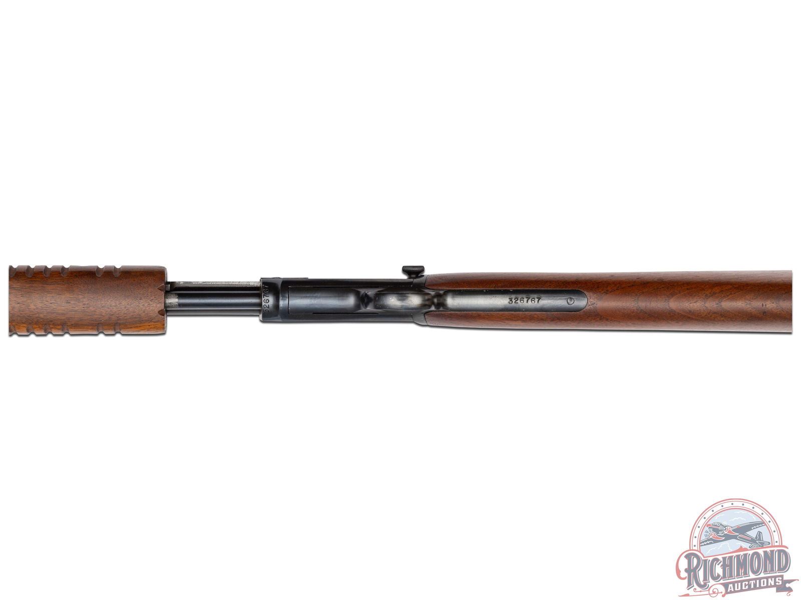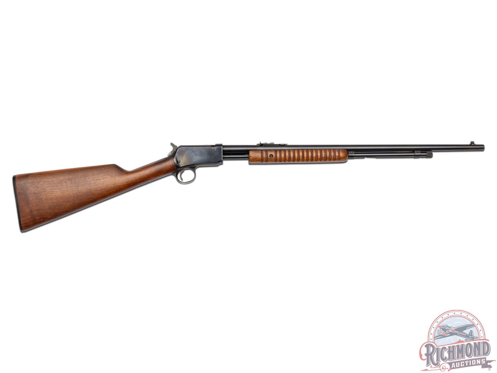 Made by Winchester Repeating Arms in 1954. Fitted with 23" blued Winchester Proof Steel round barrel with standard sights, Winchester model/address/caliber marking with blued tubular magazine in 22 Short, Long, Long Rifle caliber. Blued visible hammer takedown frame with plain trigger. Standard walnut plain stocks with flat bottom corrugated slide handle. Butt stock fitted with Winchester hard rubber butt plate. CALIBER: 22 S/L/LR. S/N: 326767. FFL STATUS: Curio & Relic.