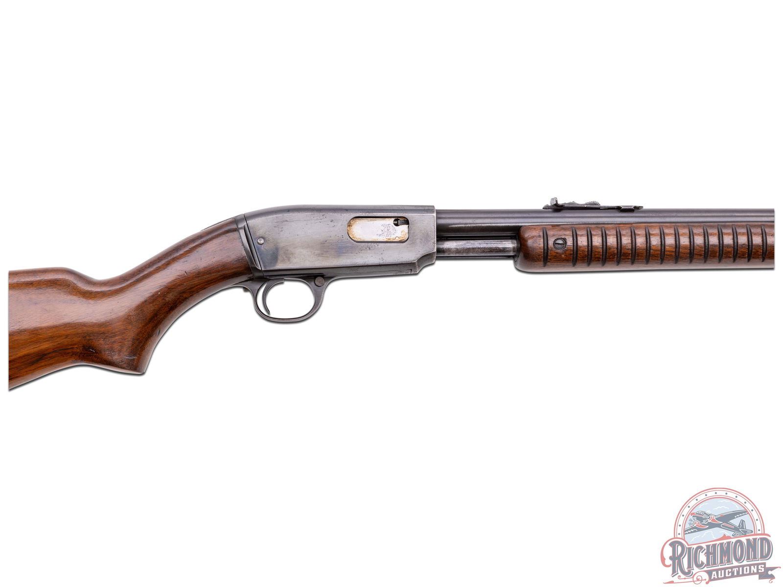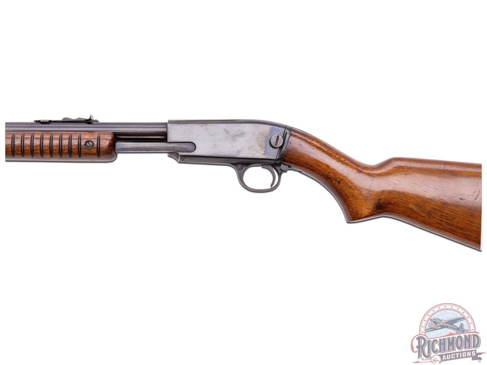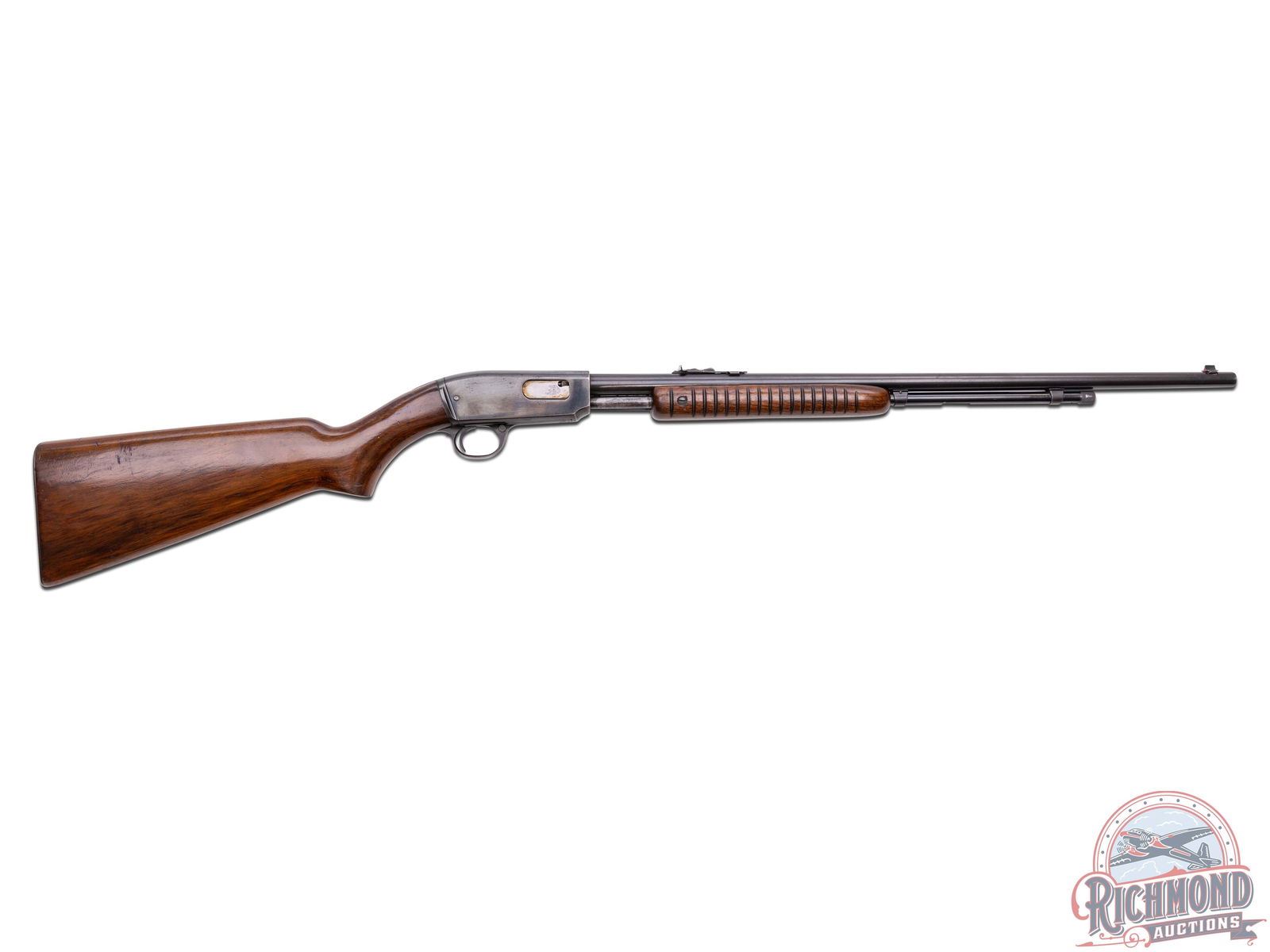 Made by Winchester Repeating Arms Company in 1947. 24" blued round Winchester Proof Steel barrel with standard sights and markings in 22 S, L, LR caliber. Blued smooth top undrilled takedown receiver with blued tubular magazine and standard trigger and safety. Standard walnut stocks with checkered steel butt plate and corrugated flat bottom slide handle. CALIBER: 22 S/L/LR. S/N: 73247. FFL STATUS: Curio & Relic.