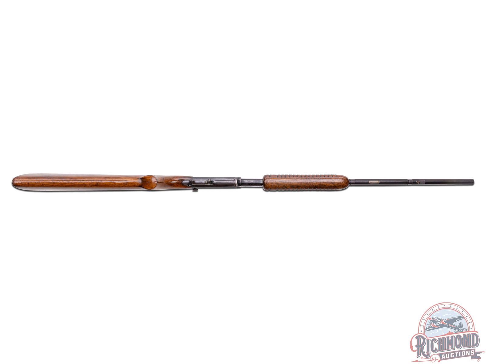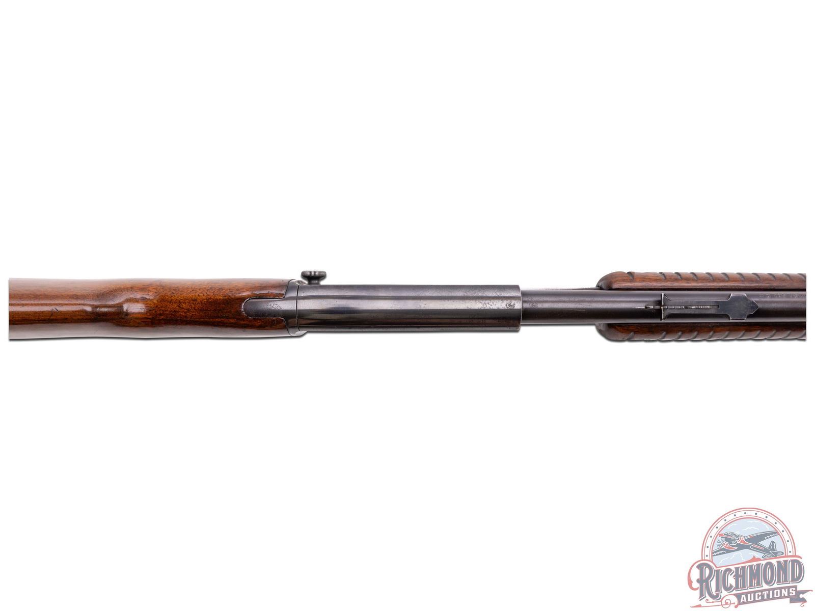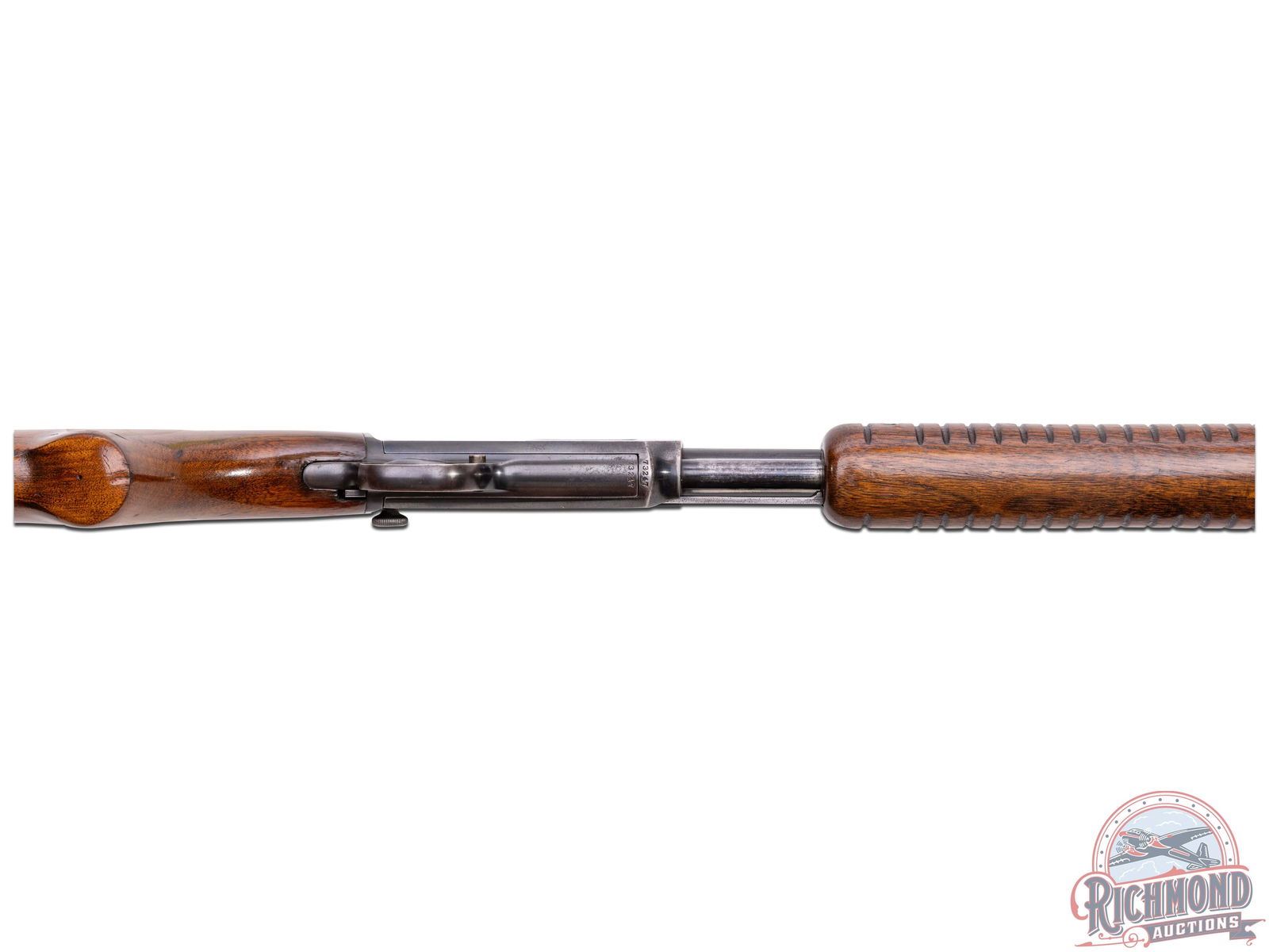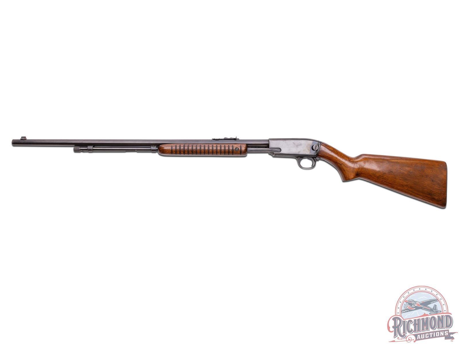 Made by Winchester Repeating Arms Company in 1947. 24" blued round Winchester Proof Steel barrel with standard sights and markings in 22 S, L, LR caliber. Blued smooth top undrilled takedown receiver with blued tubular magazine and standard trigger and safety. Standard walnut stocks with checkered steel butt plate and corrugated flat bottom slide handle. CALIBER: 22 S/L/LR. S/N: 73247. FFL STATUS: Curio & Relic.
