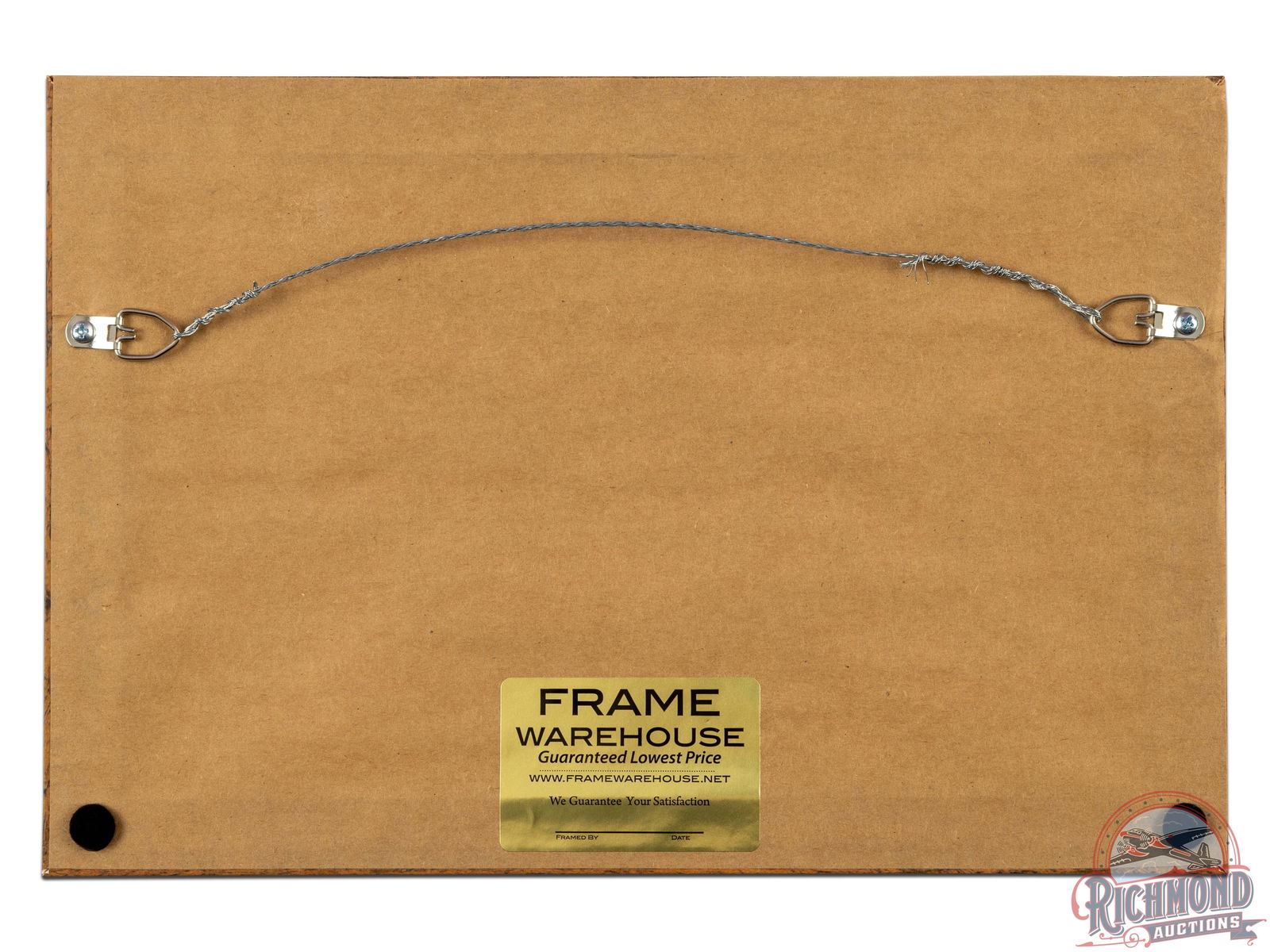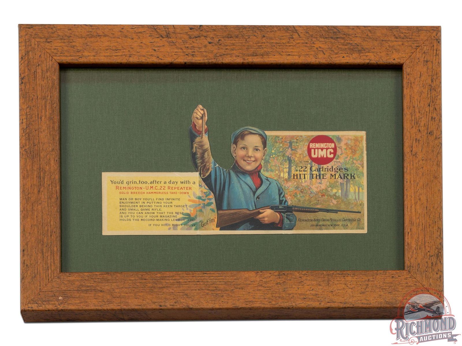 Striking die cut fold out mailer with incredible color and graphics. When closed, the image is a boy hiding behind a fence gate with his Remington .22. When opened, the boy is holding a rat by the tail. Presents with great color and some general age toning, light wear along the corners/edges and a 1/8" rip in the boy's arm. A true survivor and one of the only examples we have seen. Professionally framed under glass. 9.25" H x 13.75" W.