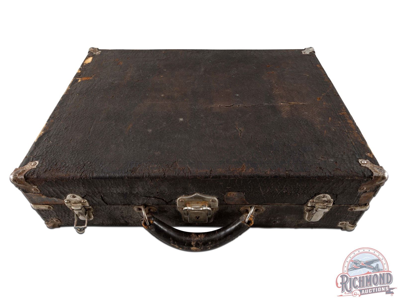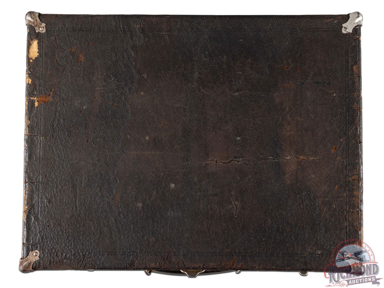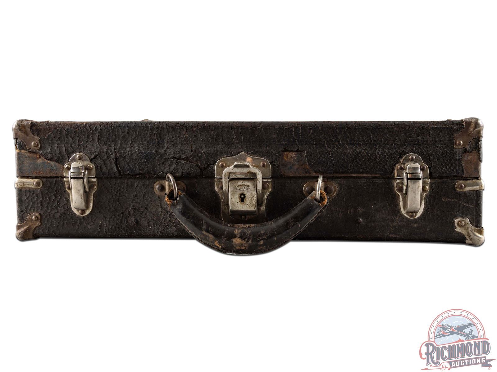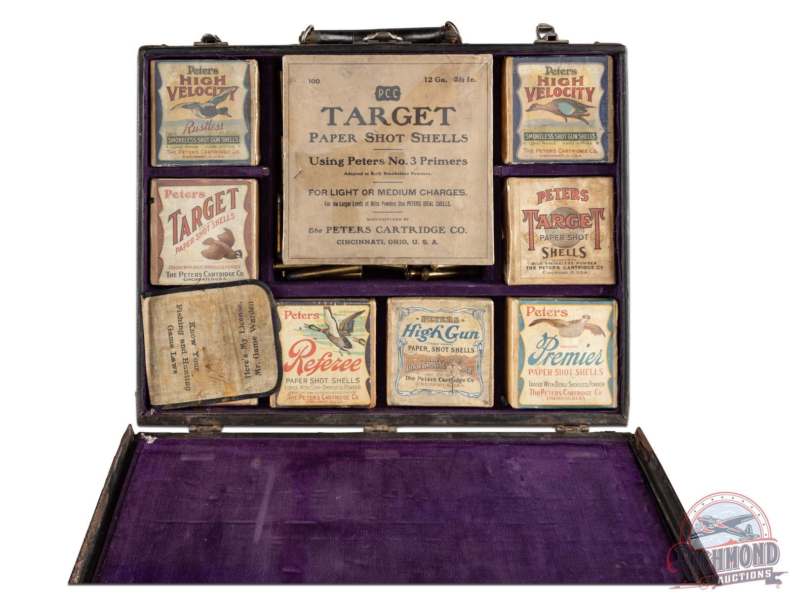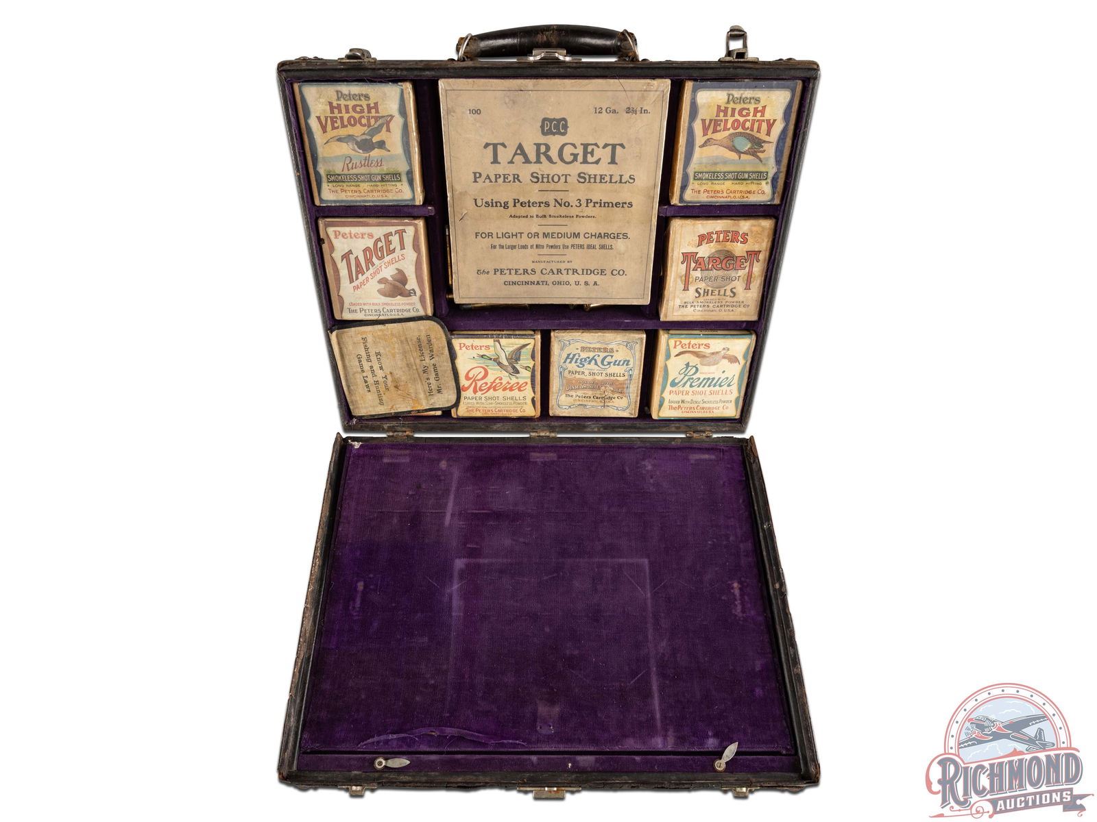 The King of Salesman Sample Kits used by the Peters Cartridge Company of Cincinnati, Ohio showing their complete line of rifle and shotgun shells circa 1920. With this kit is instruction sheets detailing each round and inventorying all rounds. Kit is in a leather bound suitcase with leather handle and is divided by purple felt boards with rifle shells held in place by copper wire. Bottom of case has all boxes of shotshells made at the time with each box wrapped in plastic for preservation. The Ultimate Salesman Sample Kit!