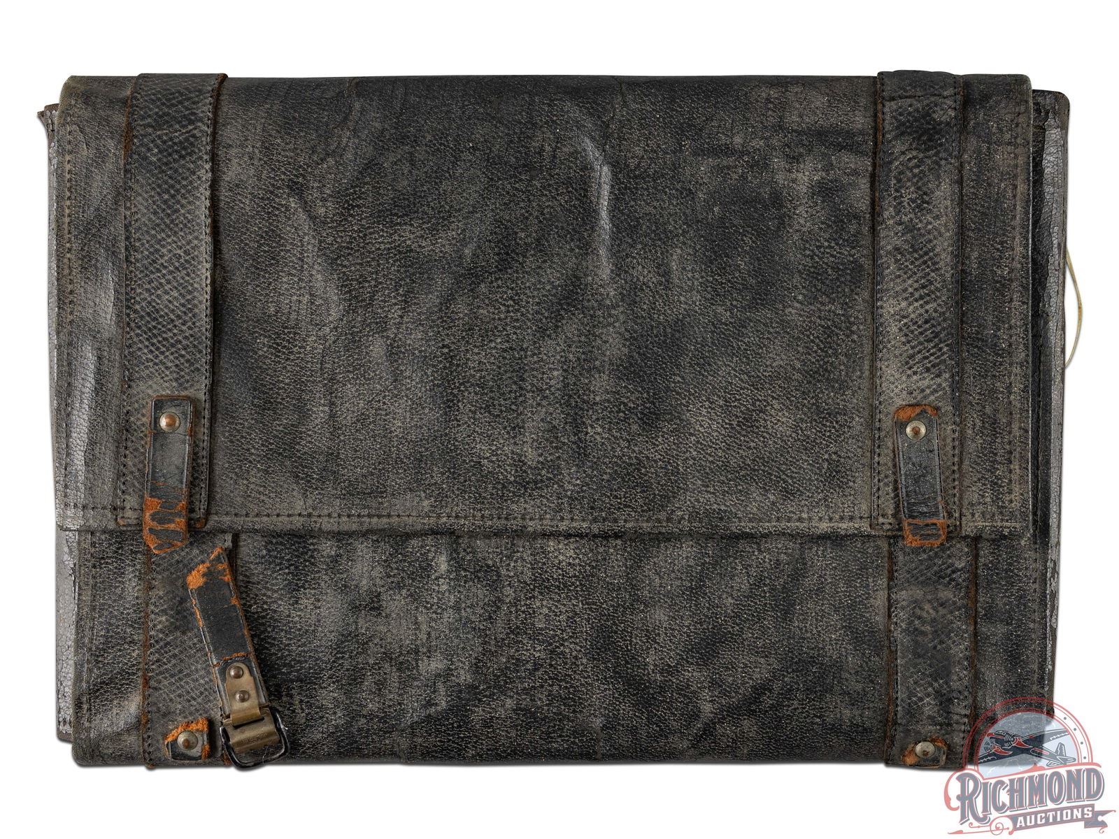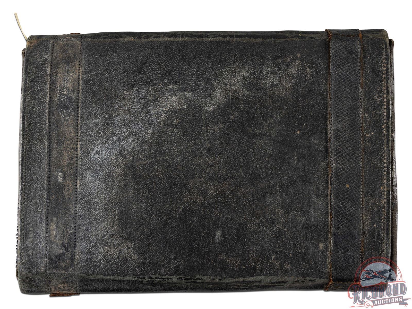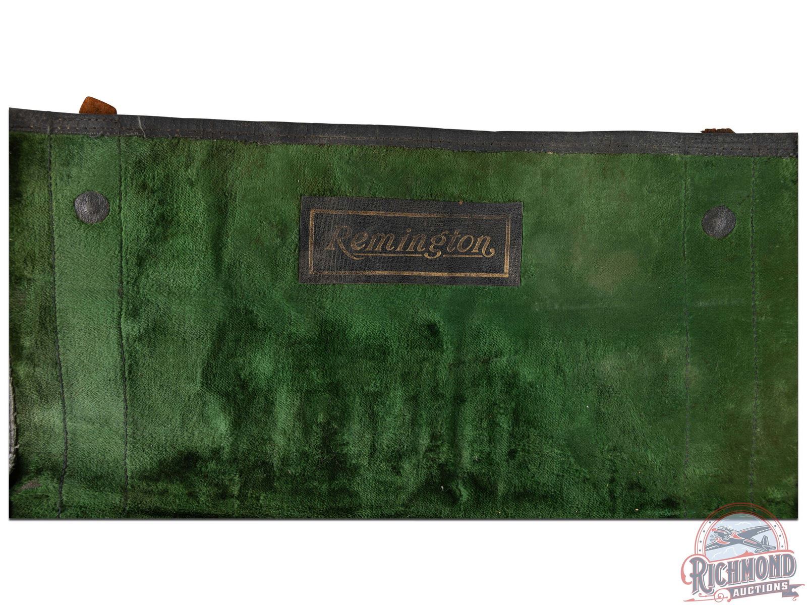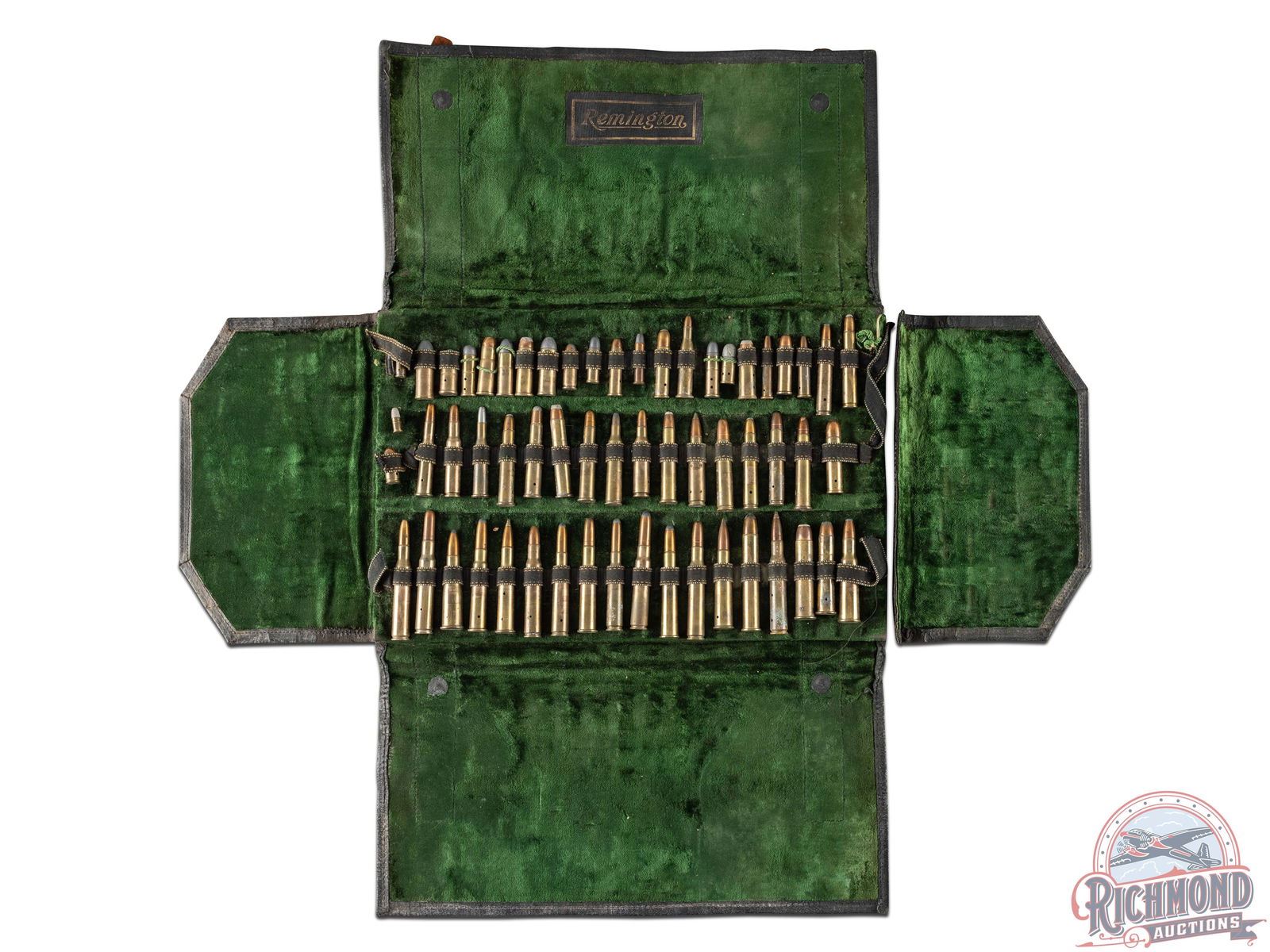 1920's Vintage Remington U.M.C. Dummy Cartridge Salesman Sample Kit with approximately 50 Rem-UMC head stamped lacquered rifle and pistol rounds housed in fold out leather satchel with green felt lining and "Remington" label.