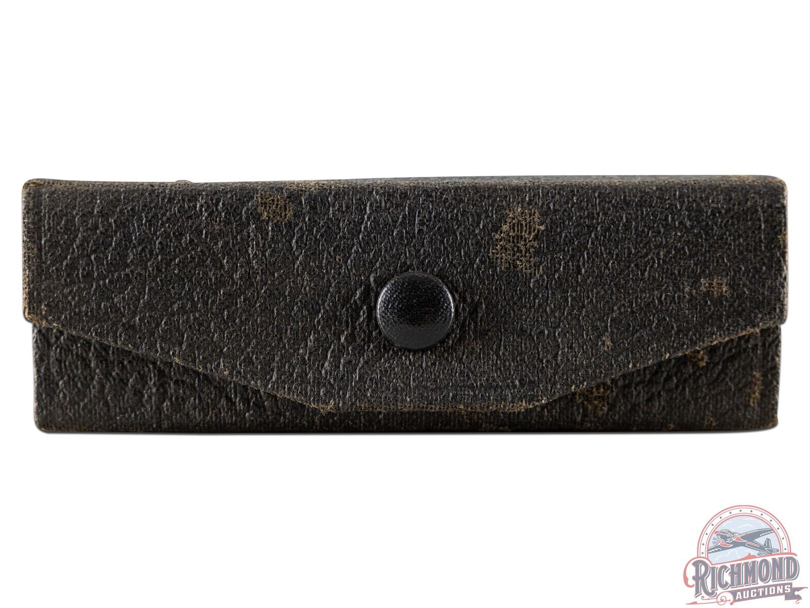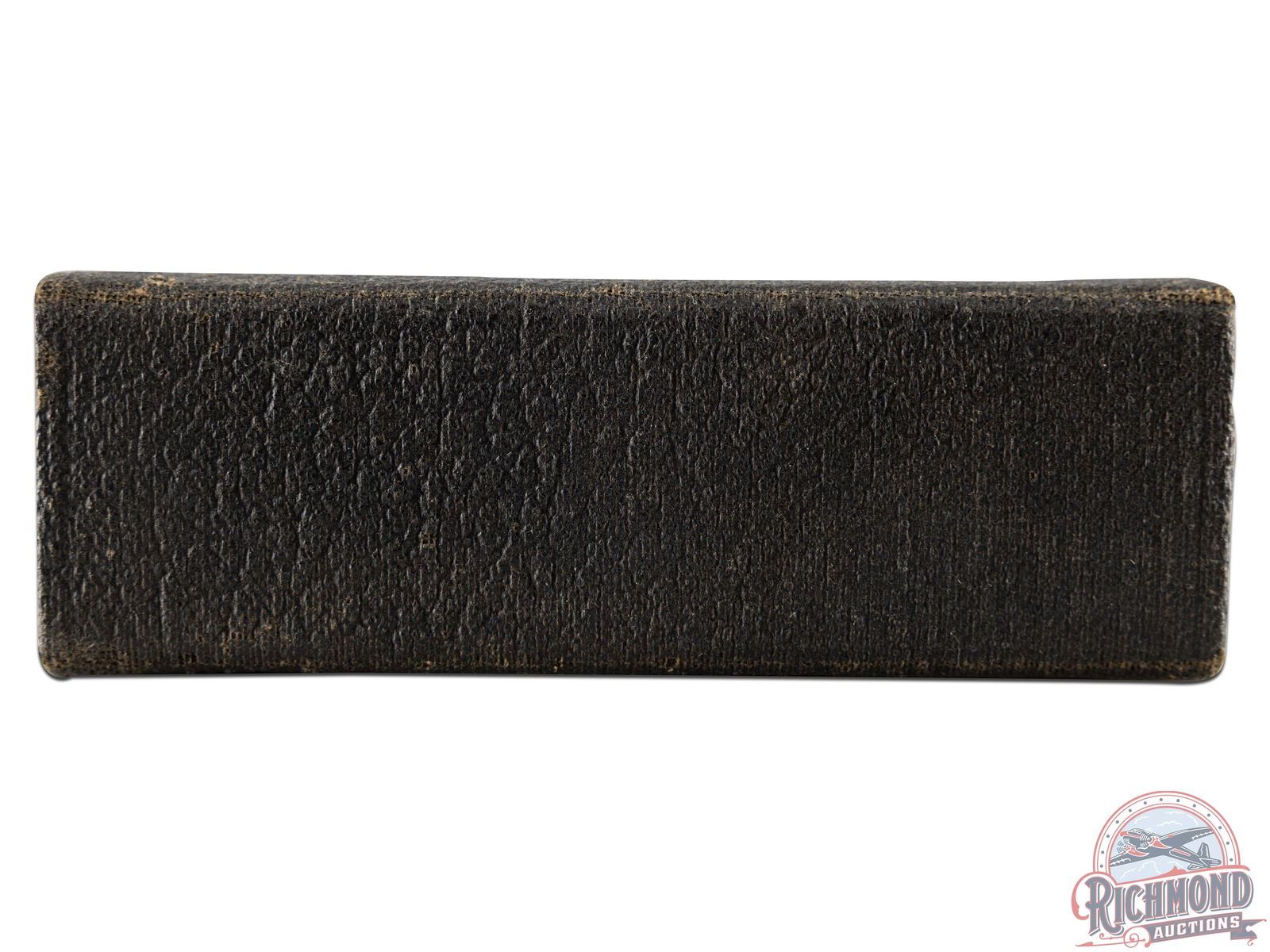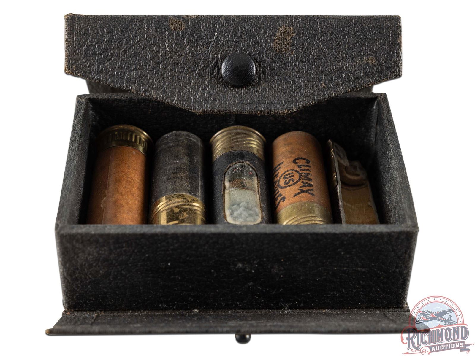 Vintage 1920's United States Cartridge Company shotgun shell salesman sample kit with kit having "Defiance, Climax, Climax Heavies, Ajax Heavy and Ajax Heavy shell sliced lengthwise. Shells are housed in heavy cardboard leather covered case with snap lid. Box has no label.