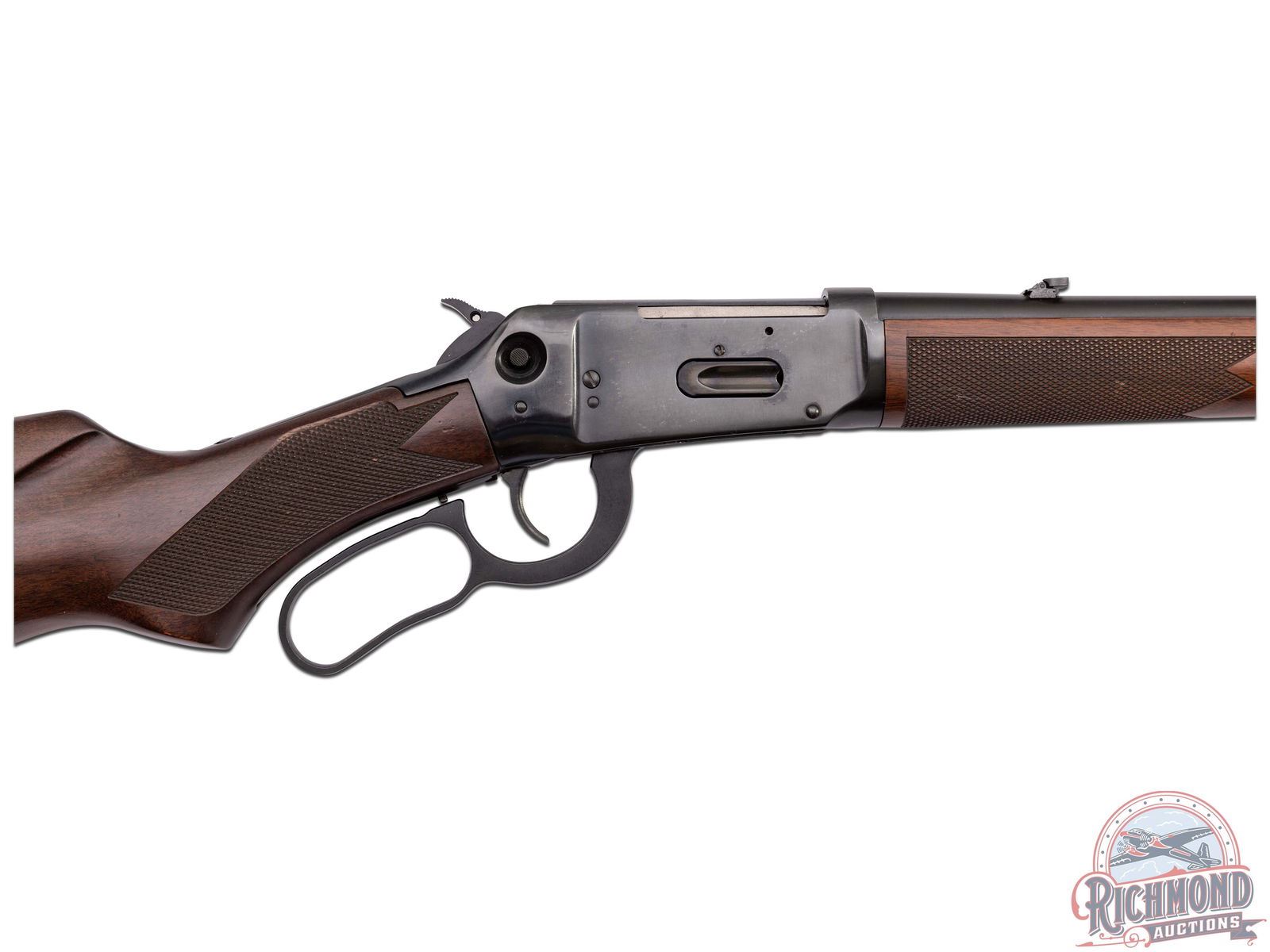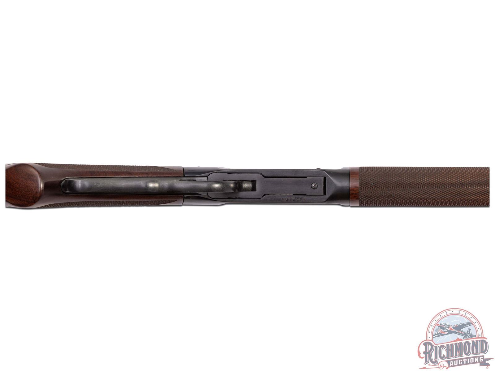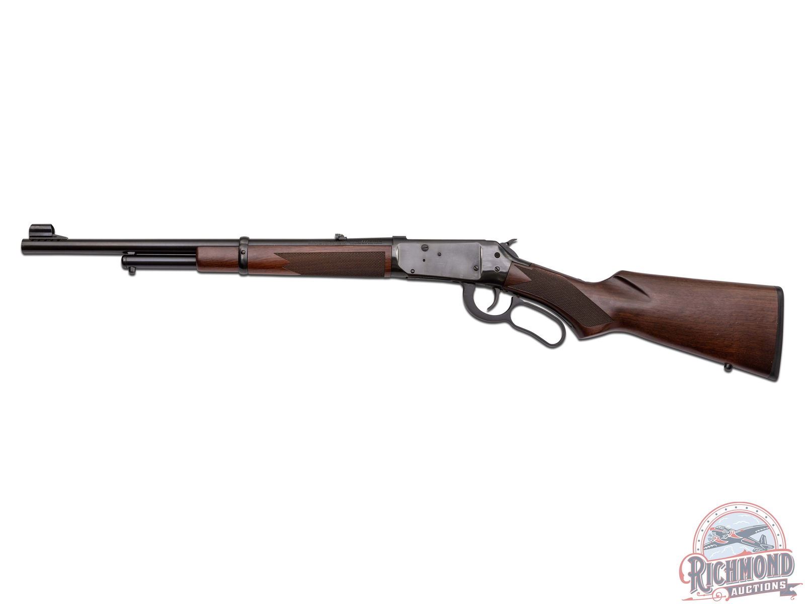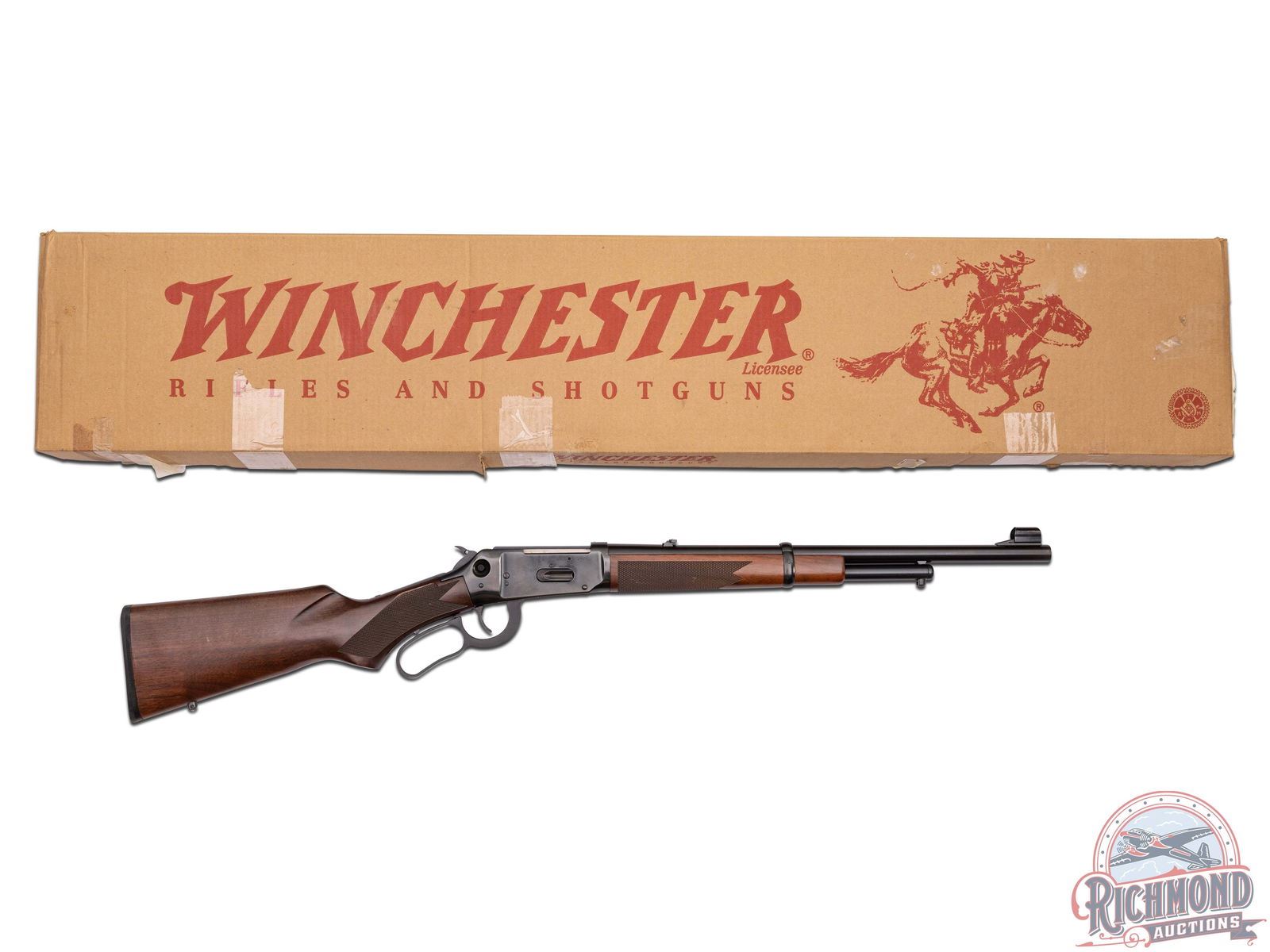 Manufactured circa 2000. This Big Bore features an 18" ported blued barrel with rear flip-up adjustable notch sight with white diamond insert and a ramped hooded front blade. Three-quarter magazine tube holds up to 5 rounds of the powerful .444 Marlin cartridges. Blued receiver with side loading gate and crossbolt safety. Satin walnut deluxe stock with checkered pistol grip and forearm. Fitted with a factory Winchester rubber recoil pad and sling studs. Comes in the original box with factory paperwork and cable lock. LOP: 13-3/4". CALIBER: 444 MARLIN. S/N: 6445104. FFL STATUS: Modern.