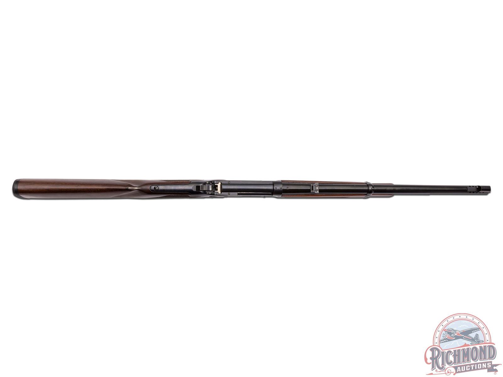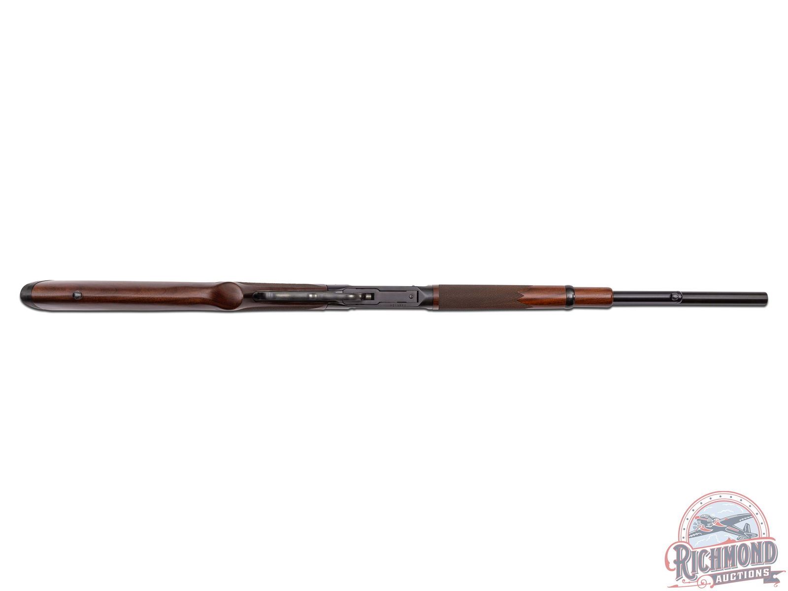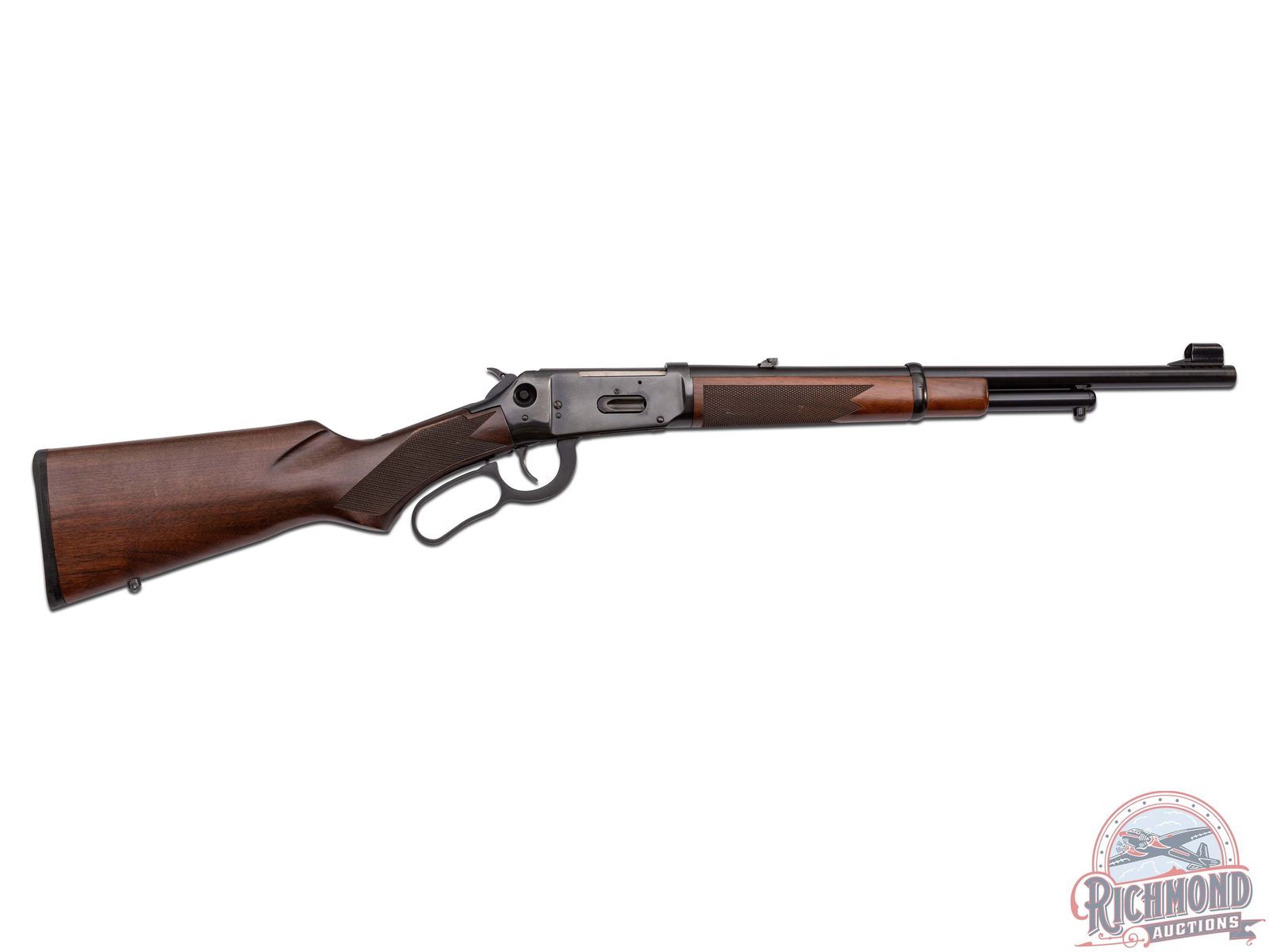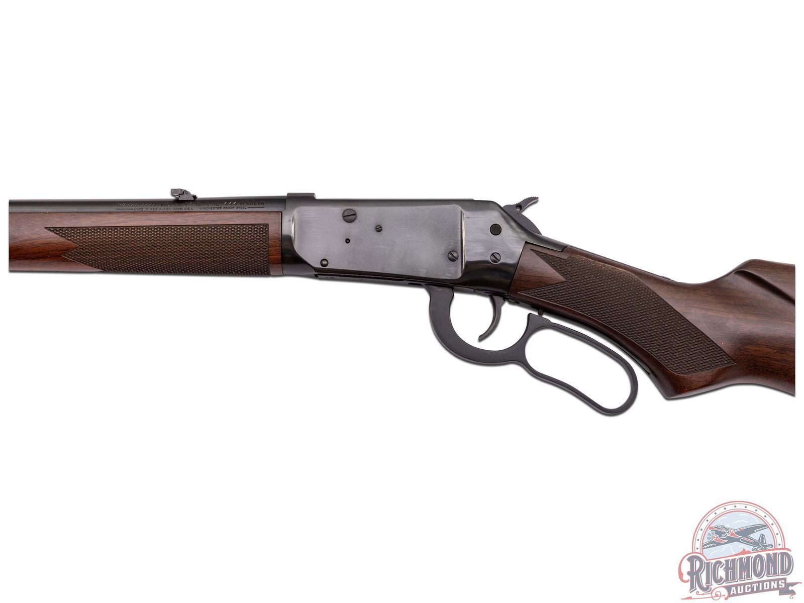 Manufactured circa 2000. This Big Bore features an 18" ported blued barrel with rear flip-up adjustable notch sight with white diamond insert and a ramped hooded front blade. Three-quarter magazine tube holds up to 5 rounds of the powerful .444 Marlin cartridges. Blued receiver with side loading gate and crossbolt safety. Satin walnut deluxe stock with checkered pistol grip and forearm. Fitted with a factory Winchester rubber recoil pad and sling studs. Comes in the original box with factory paperwork and cable lock. LOP: 13-3/4". CALIBER: 444 MARLIN. S/N: 6445104. FFL STATUS: Modern.