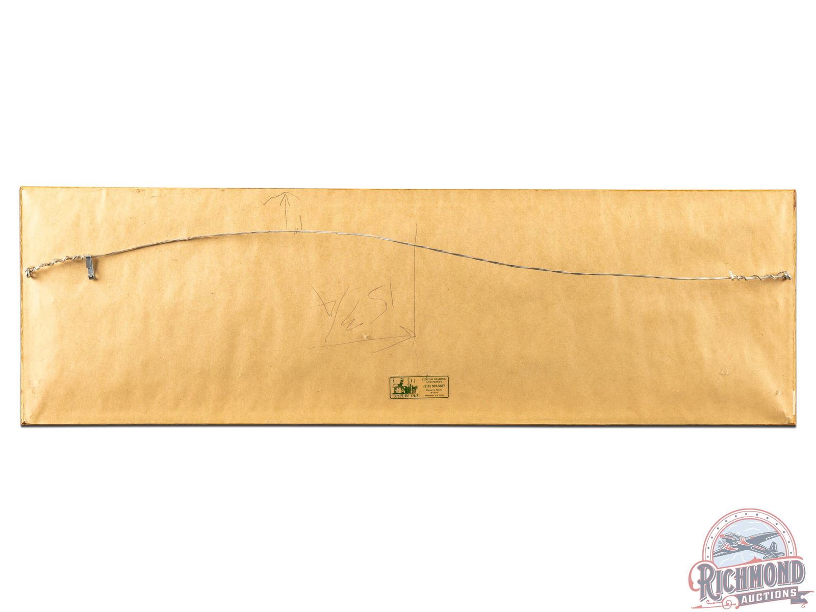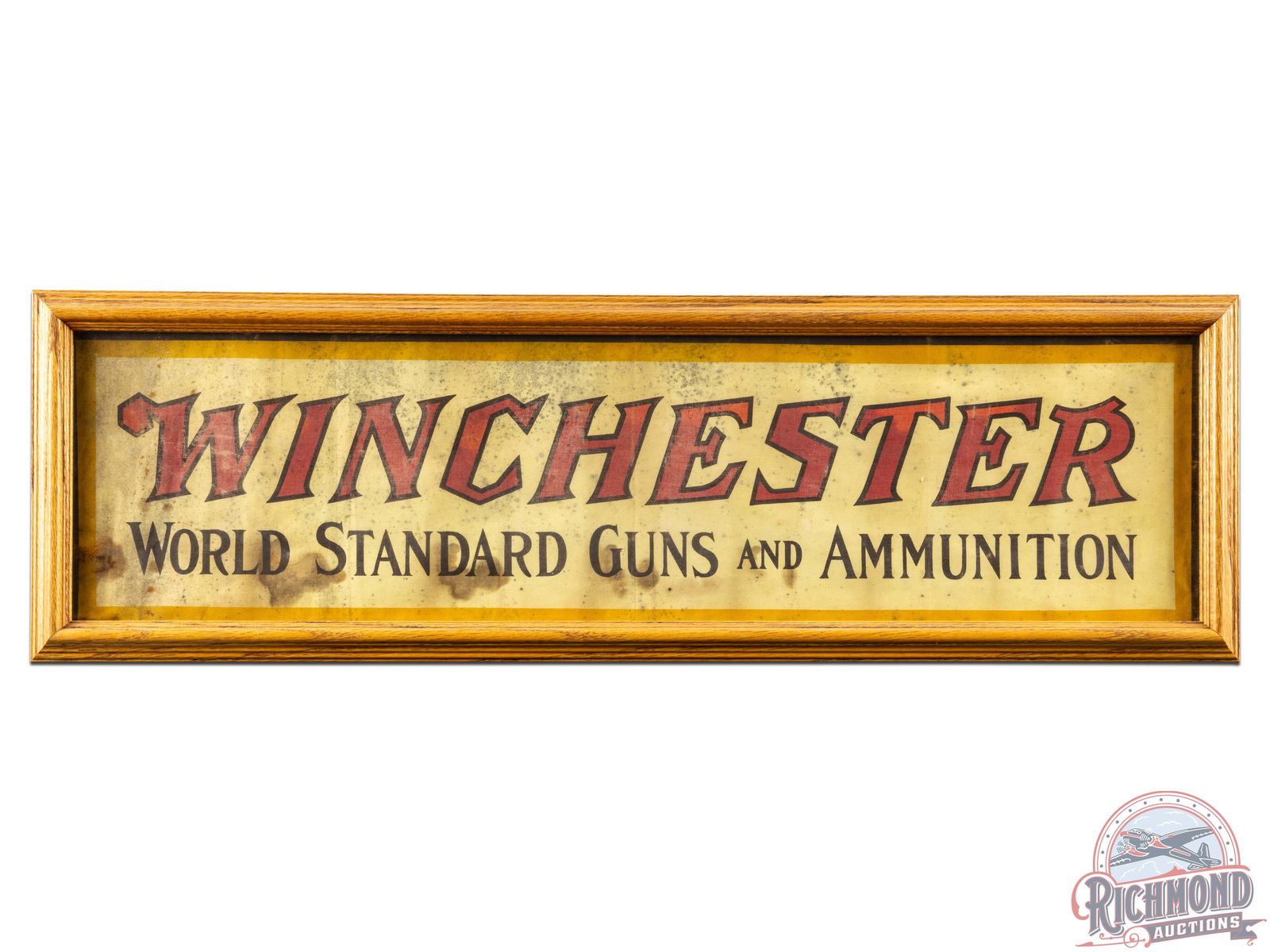 Seldom seen canvas banner under glass in a wood frame. Exhibits discoloration and staining with one eraser size hole at the bottom left corner. This very unusual Winchester piece has a great patina and weathered look. 9.5" H x 31.5" W.