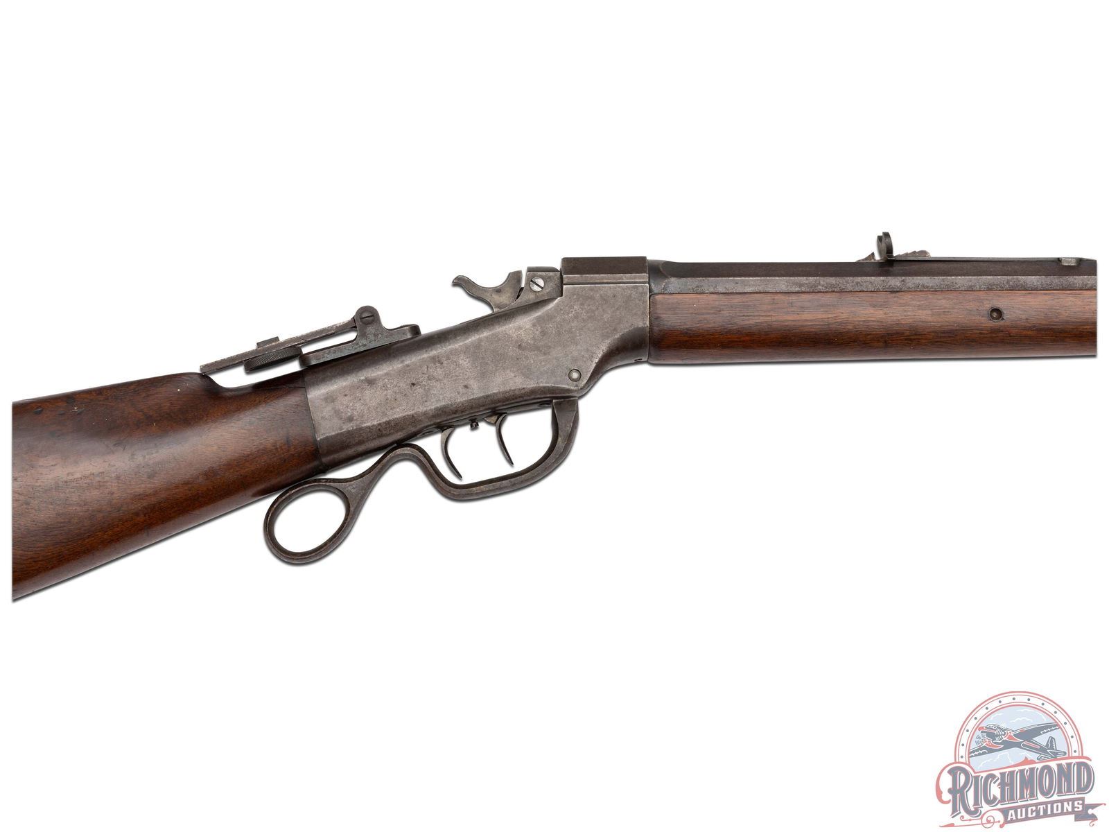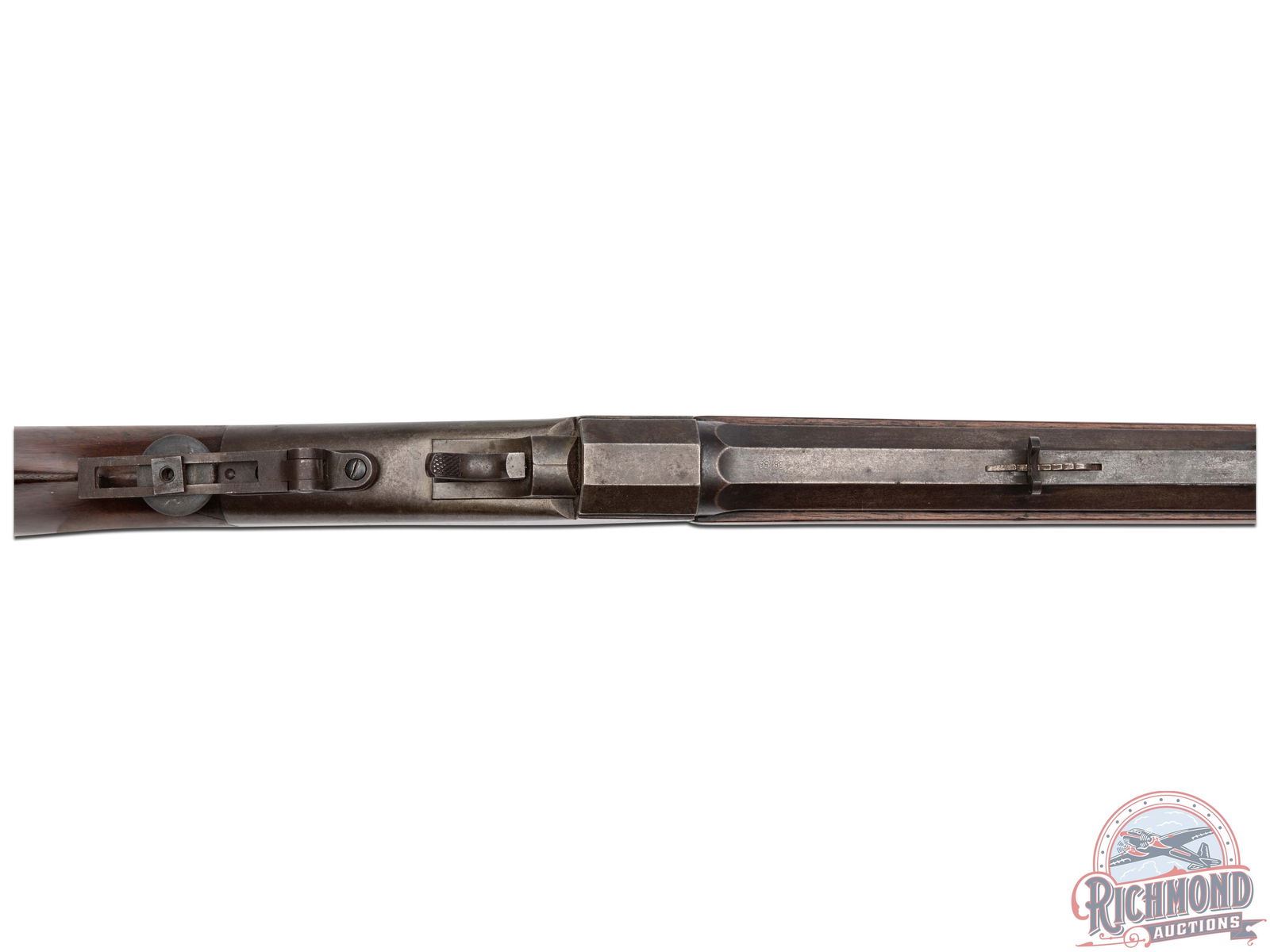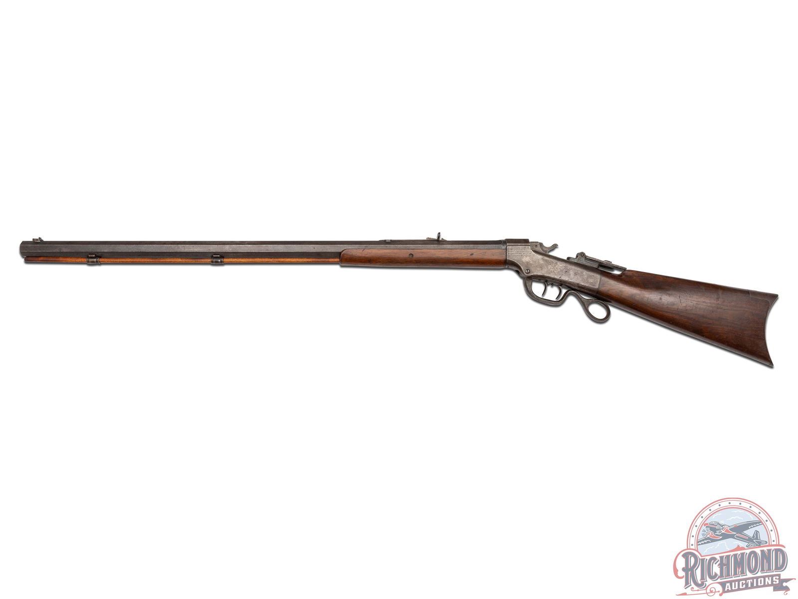Made by the J.M. Marlin Company in 1890. Blued 30" octagon barrel with Beech front sight and Rocky Mountain rear adjustable sight in 38-55 caliber. Comes with under barrel mounted hardwood ramrod. Case-hardened Marlin two address marked action with factory double set triggers and ring loop lever. Tang has Ballard Vernier sight. Walnut plain standard stocks with steel crescent butt plate. J.T. Livengood Collection. CALIBER: 38-55. S/N: 16837. FFL STATUS: Antique.